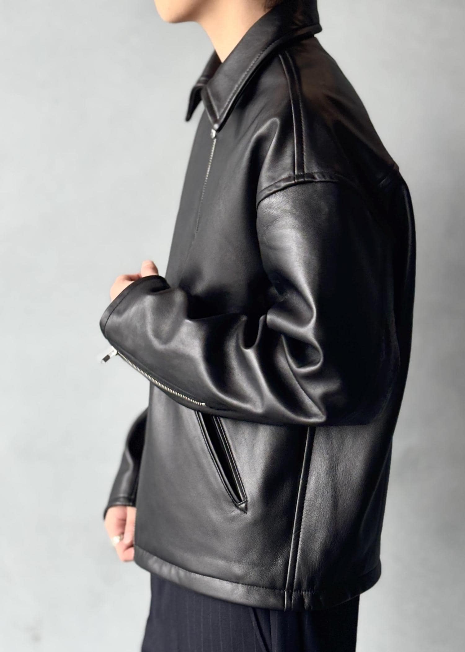 重厚感はあるが着てみると革が柔らかく着心地がいい。 -