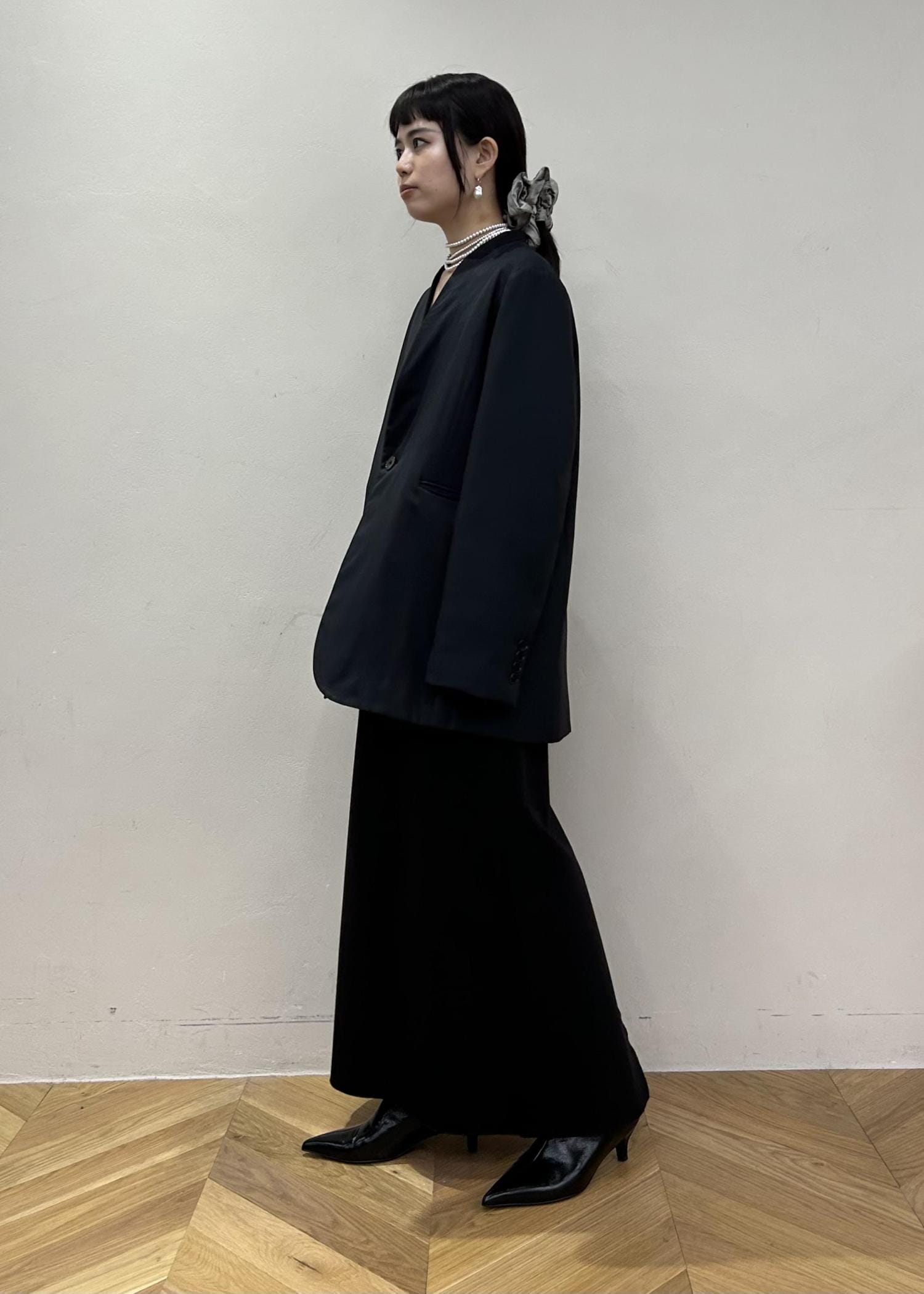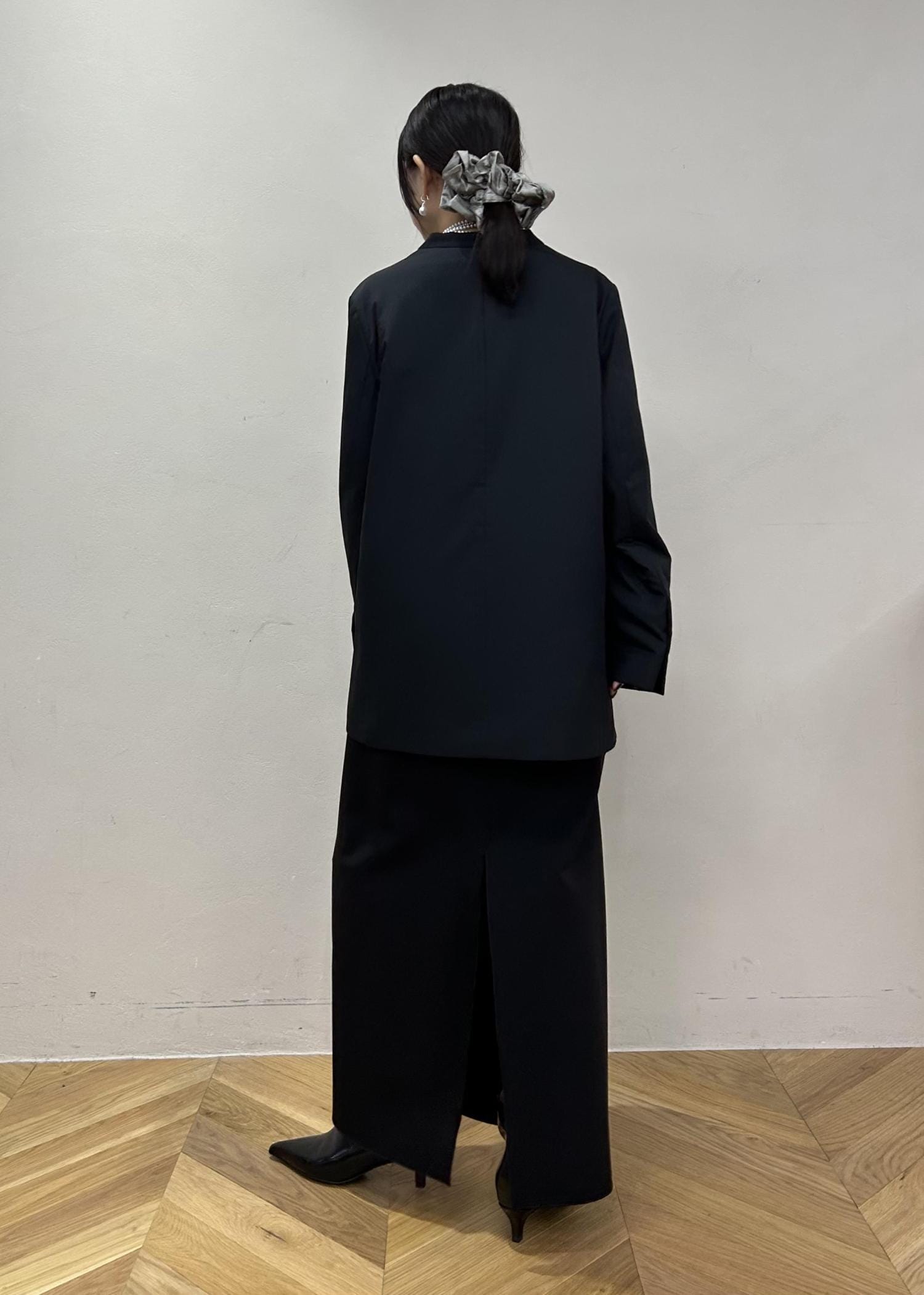 タイトなシルエットですが、ジャージのように伸縮性があるので着心地は楽です。深めのスリットで足さばきしやすく、ロングブーツなどをちら見せするのも素敵です。