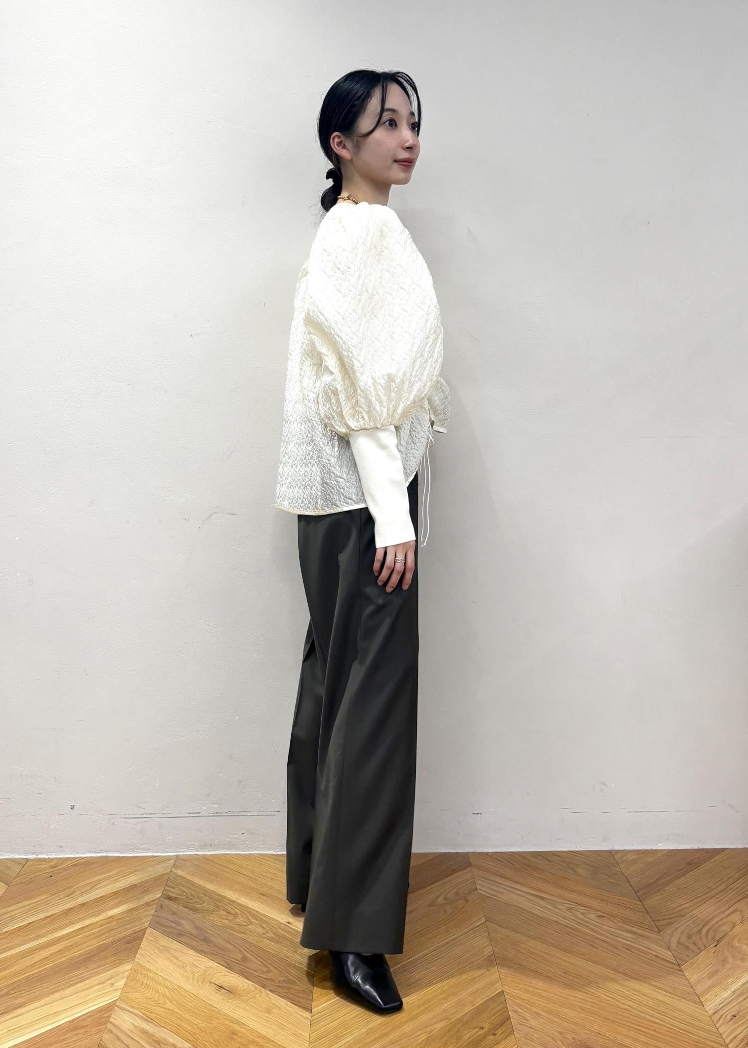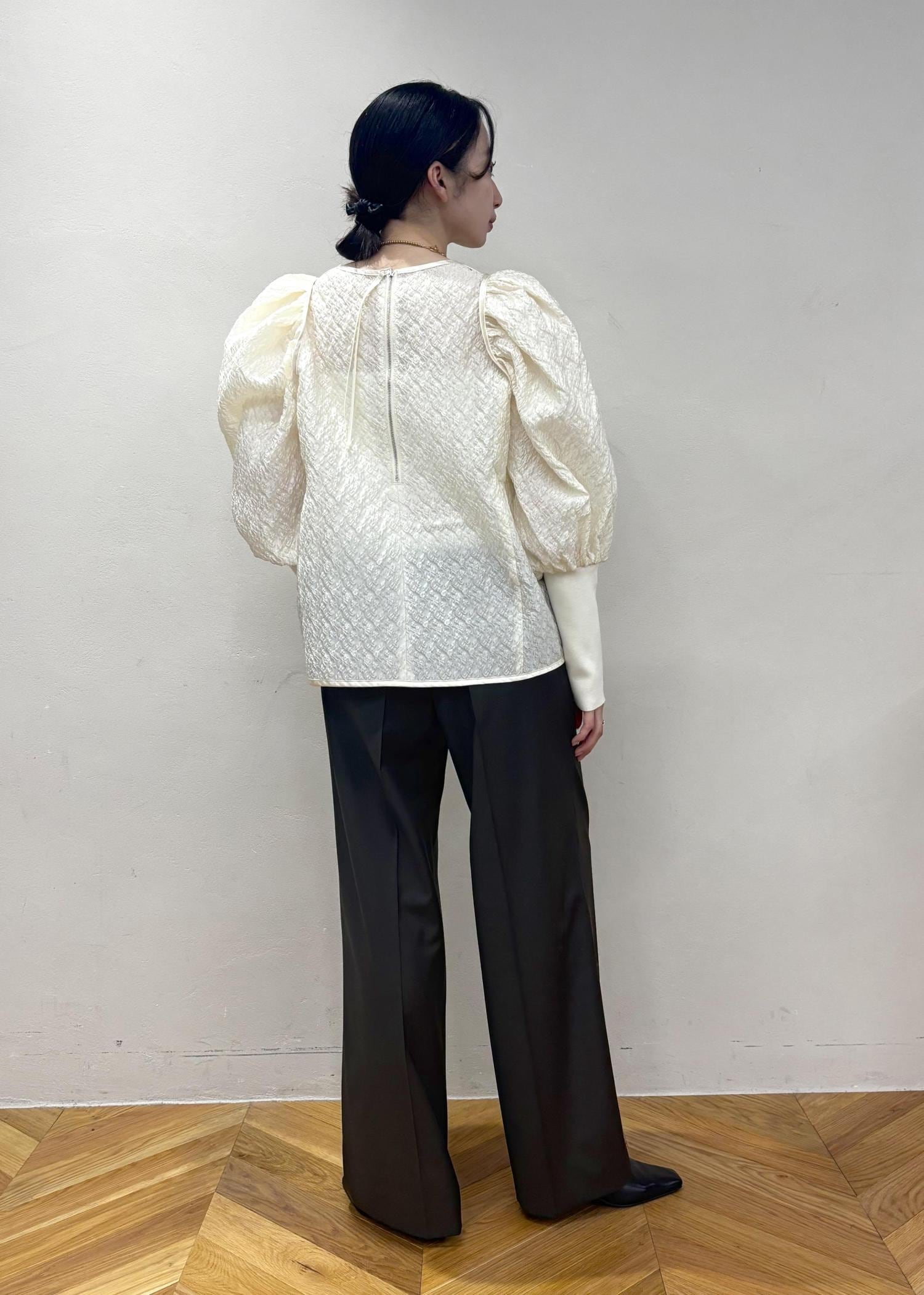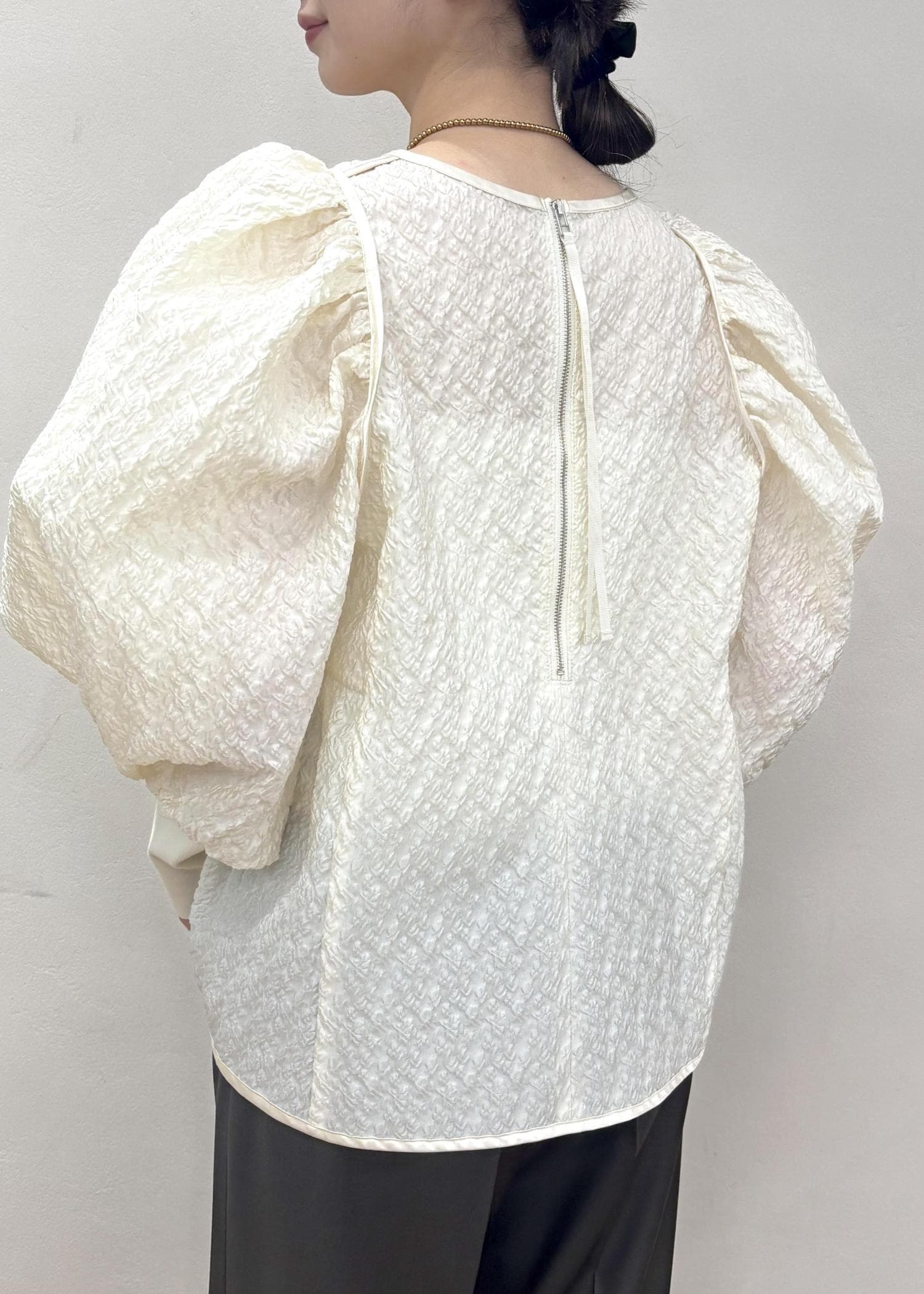 ボリューム感のあるスリーブが魅力のトップスです!首周りが詰まっておらず、スリーブのヒジから下も細身なので、着膨れして見えないのが◎スッキリしたボトムスと合わせた方が、トップスのシルエットが魅力的に見えます☺︎