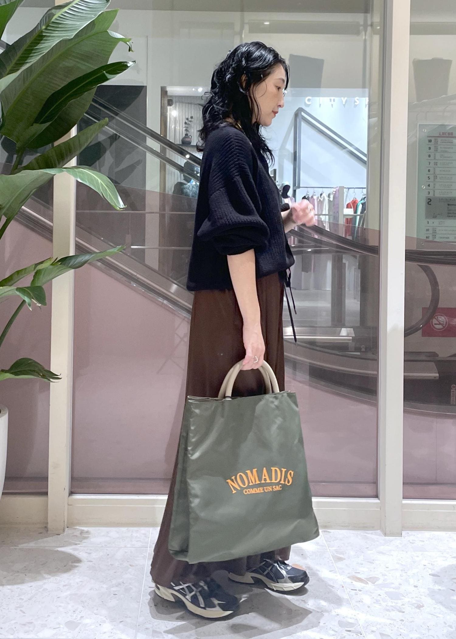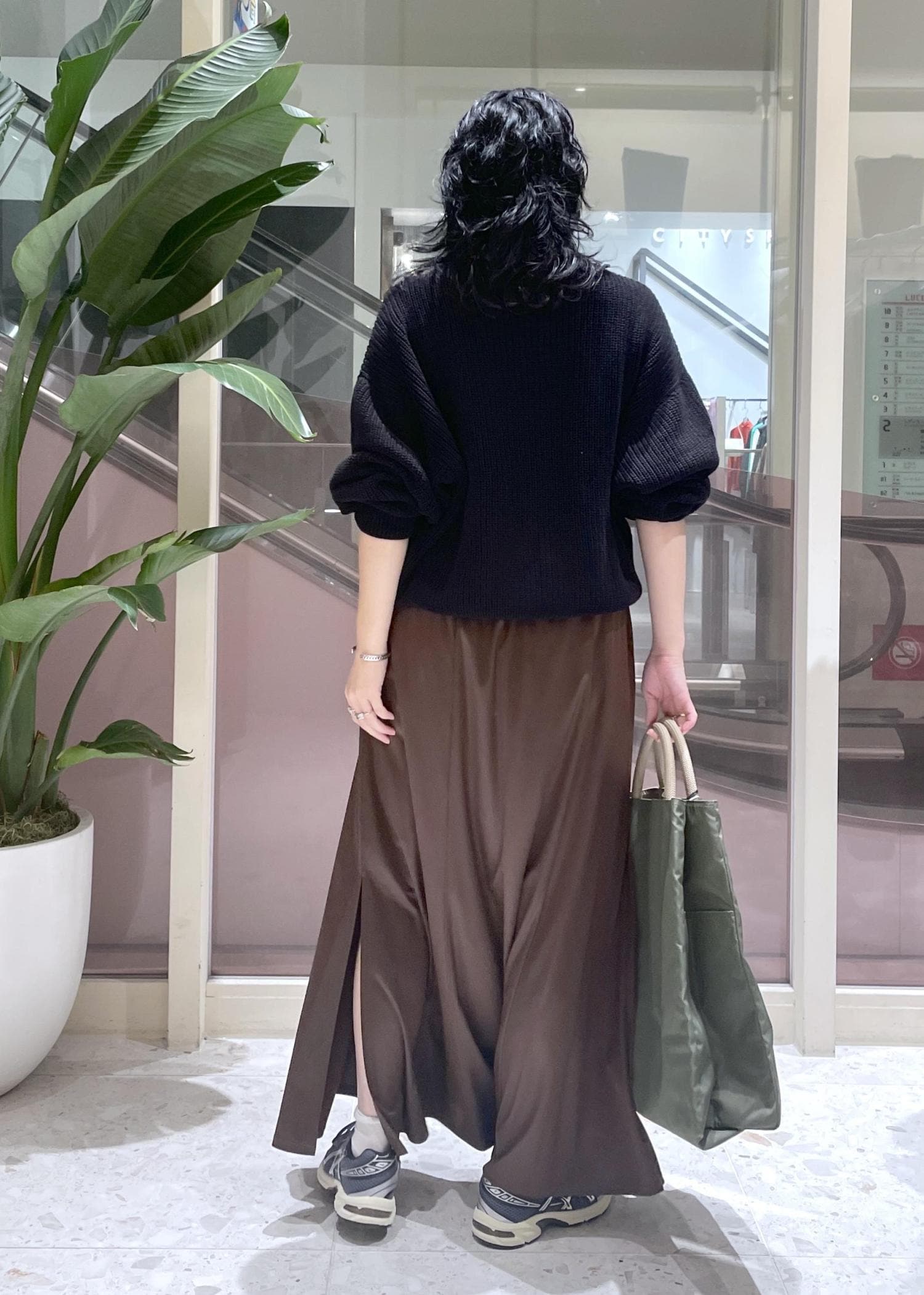 さらっと落ち感があり、レザー見えする素材が甘くなりすぎない雰囲気でカジュアル派にもおすすめ。 -