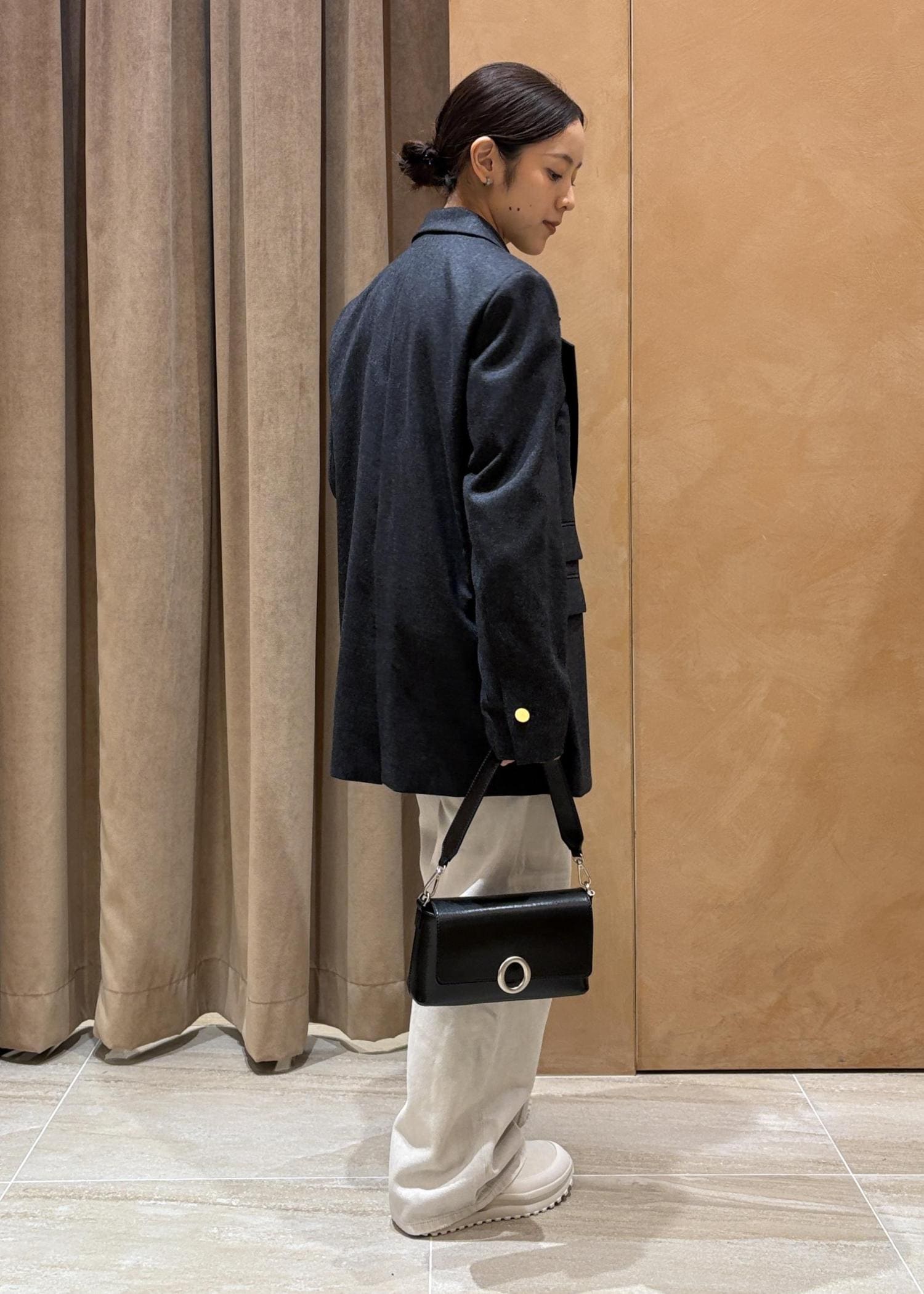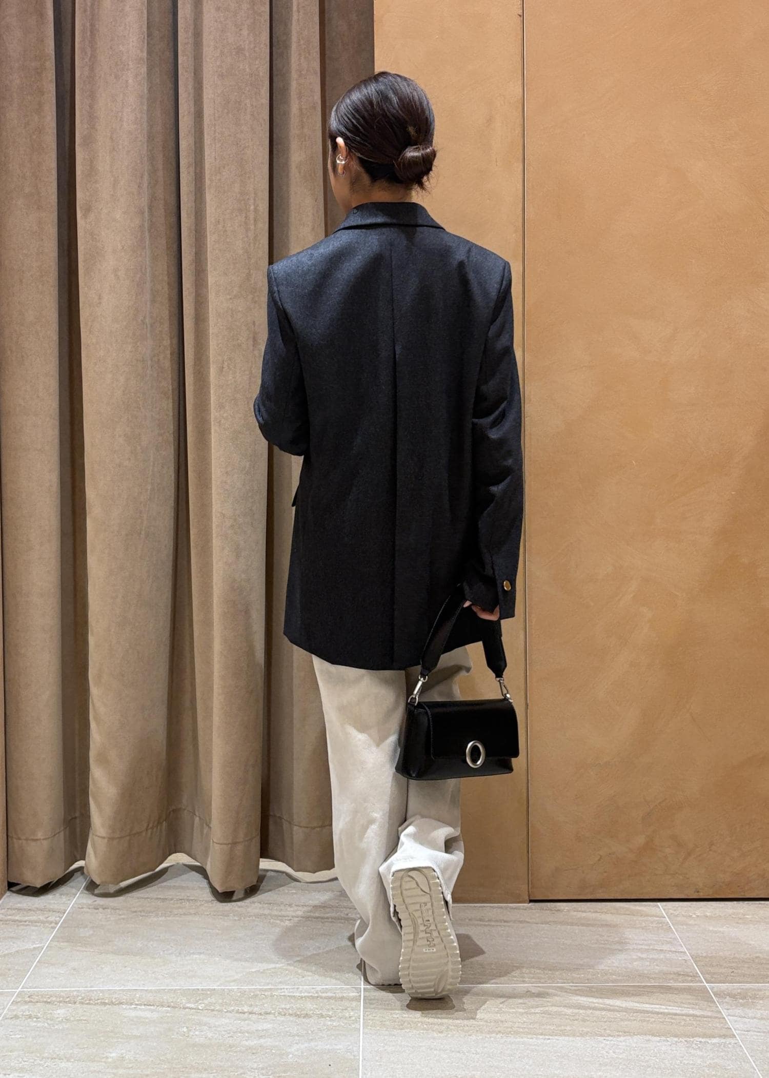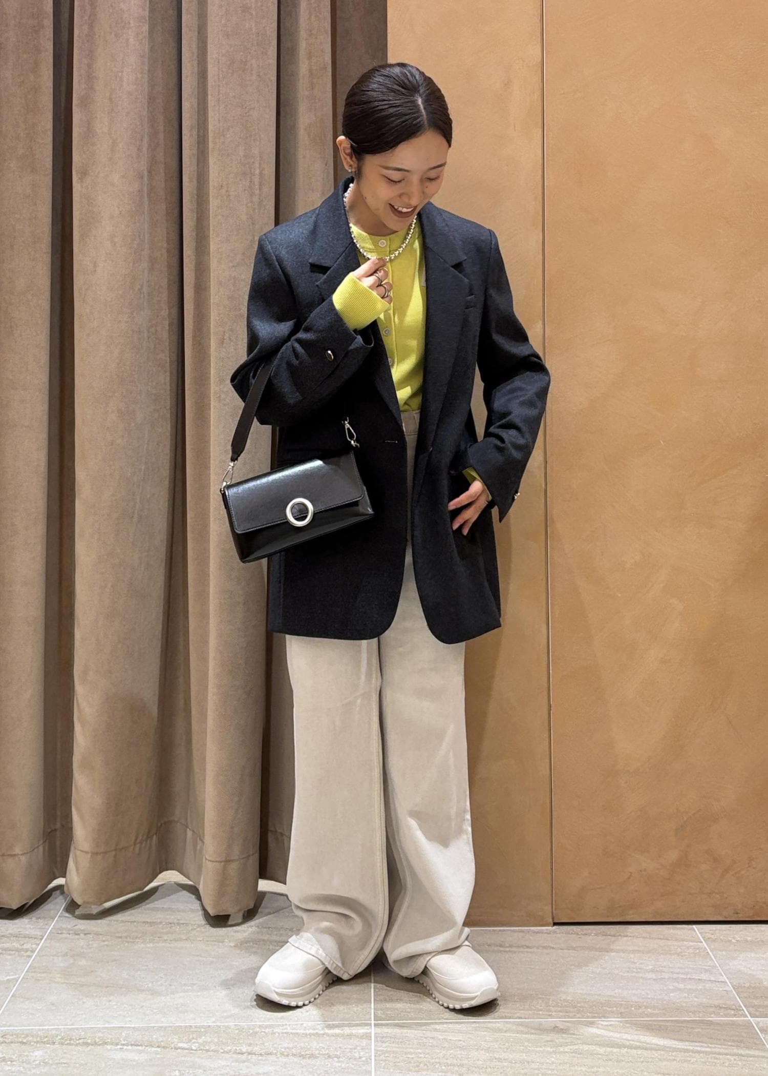 カーディガンとスリットジャケットを重ねたレイヤードで、柔らかさと暖かさを両立。セミフレアデニムとHUNTERシューズで歩きやすさも確保し、バッグはショルダーでアクティブに持てるスタイルです。