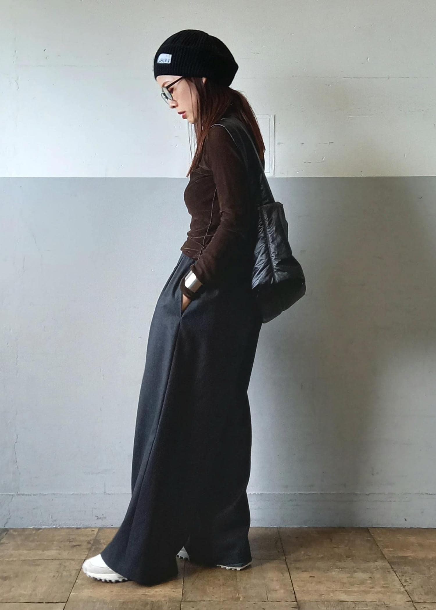 ウエストはゴムなのと、紐で調節できるイージーデザインですが、上品なウール素材で楽チンなのに楽チン見えしない優秀ボトム!!膝下あたりまで裏地も付いているのでチクチク感も全くなく本当にストレスフリー◎しかも洗えるという文句無しの一着✨