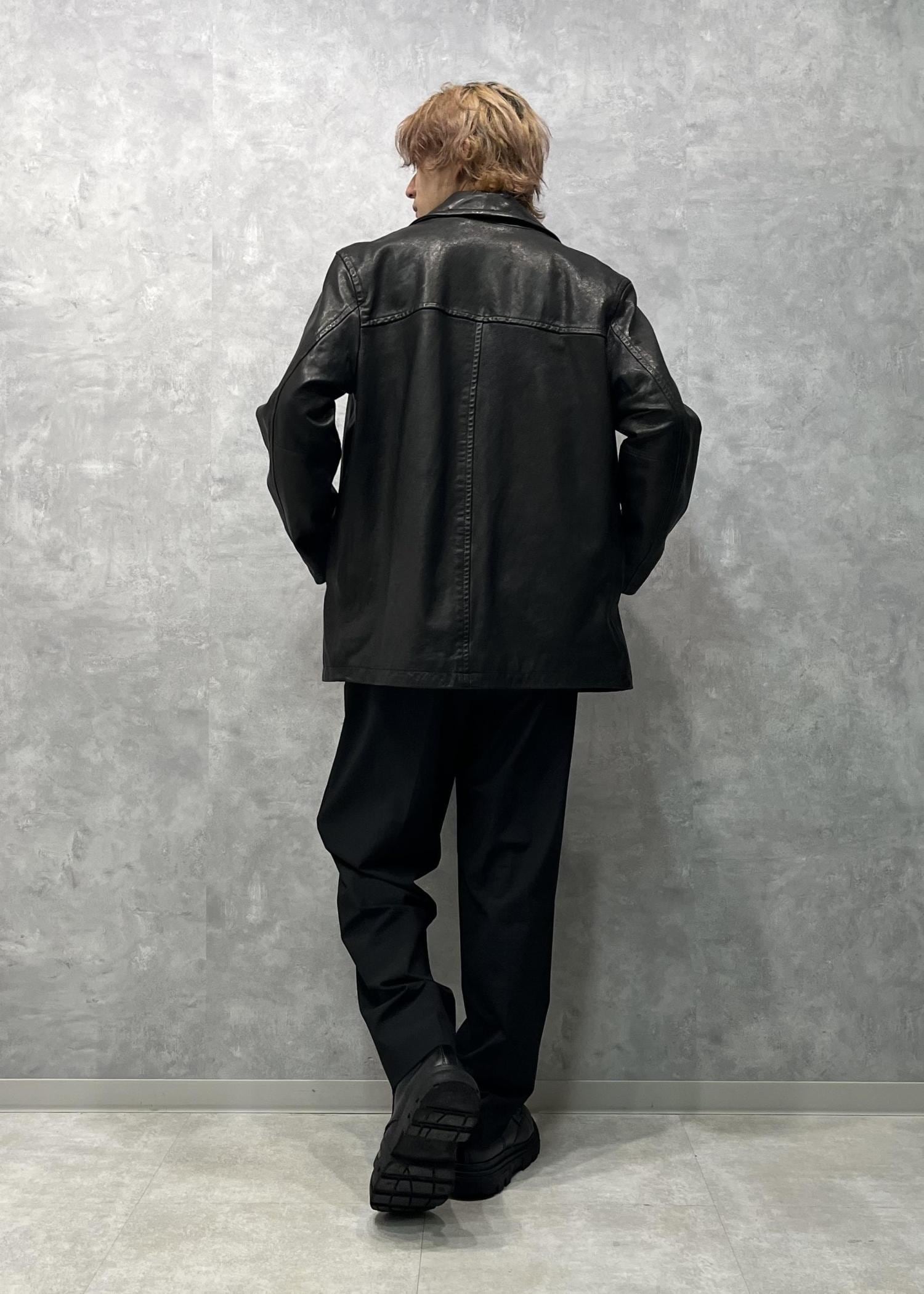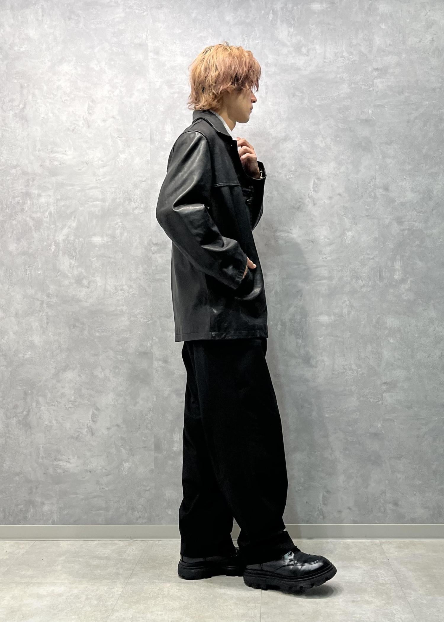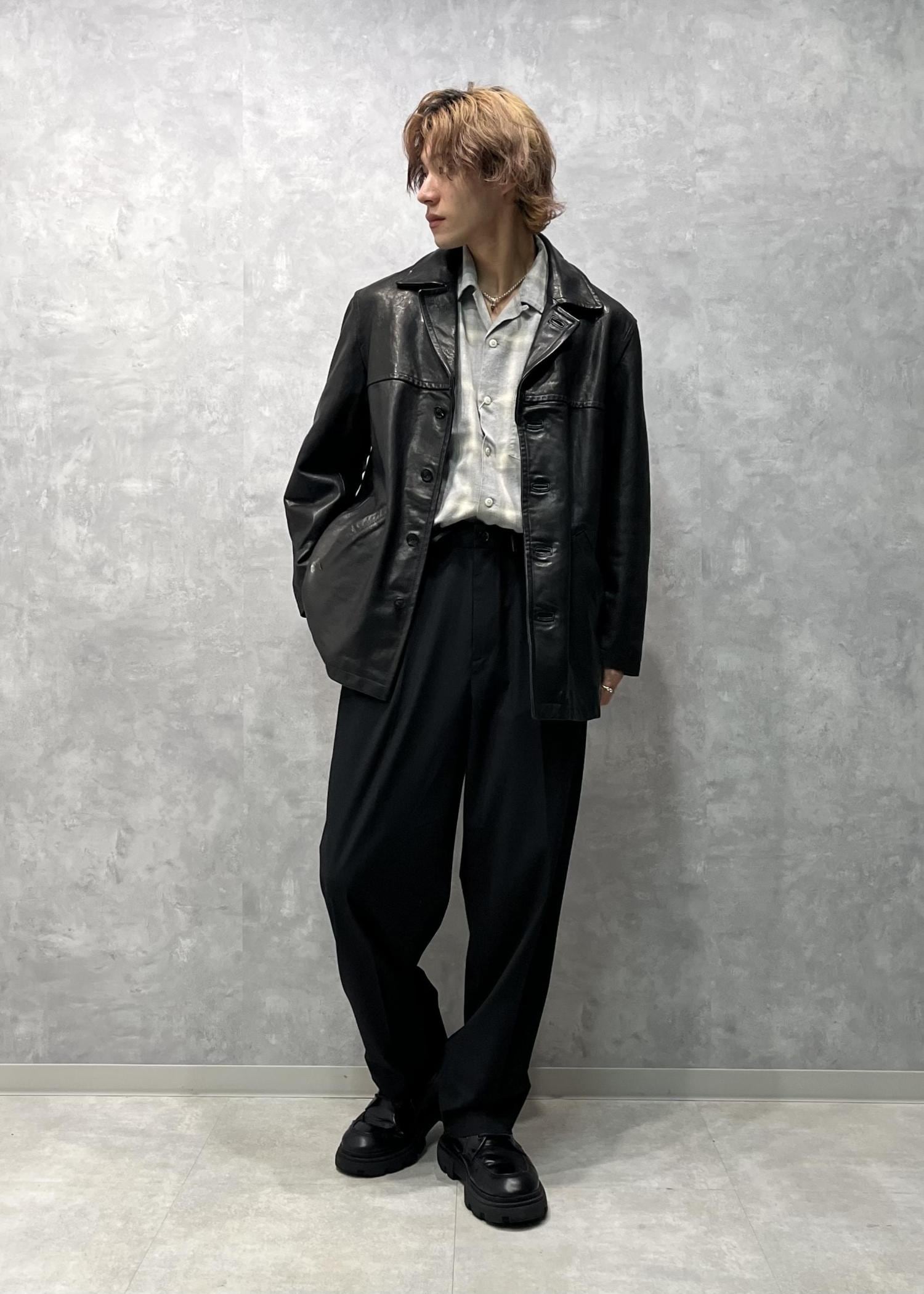秋らしいチェックシャツとキレイめなスラックスはレザーコートともマッチするスタイリングです。
