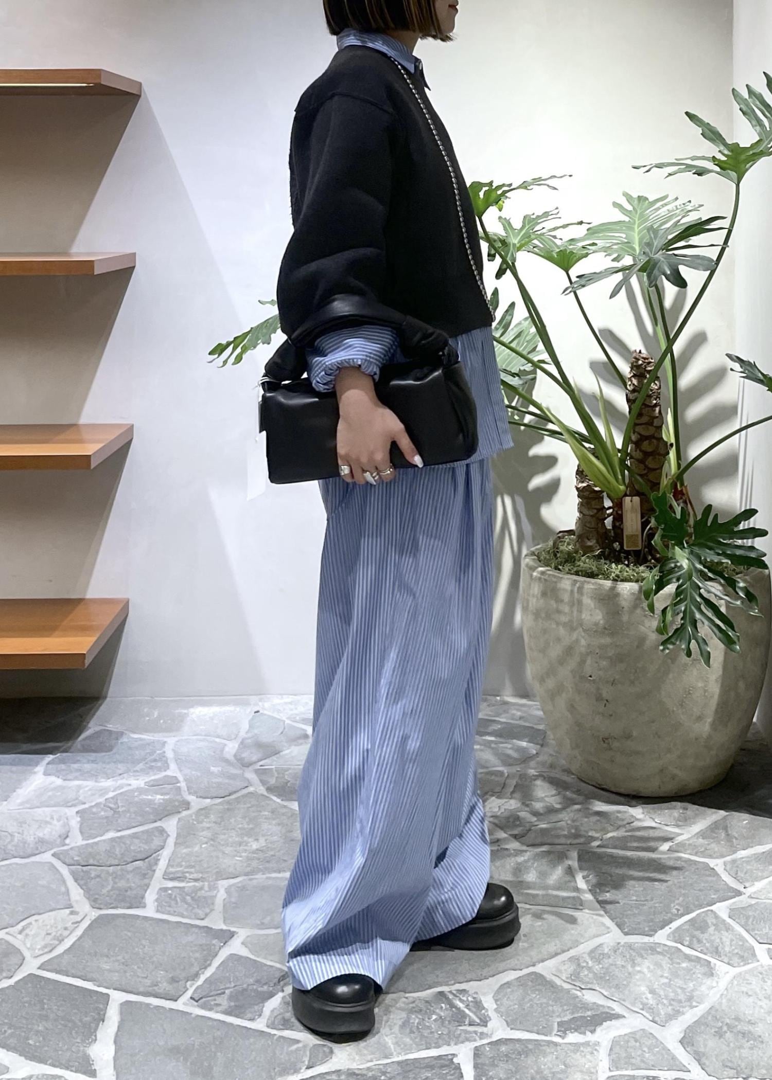 ワイドシルエットとタック入りでパジャマ感も出にくいストライプパンツです。 -
