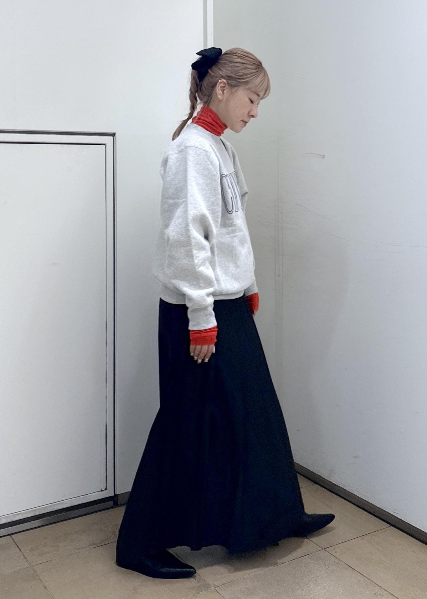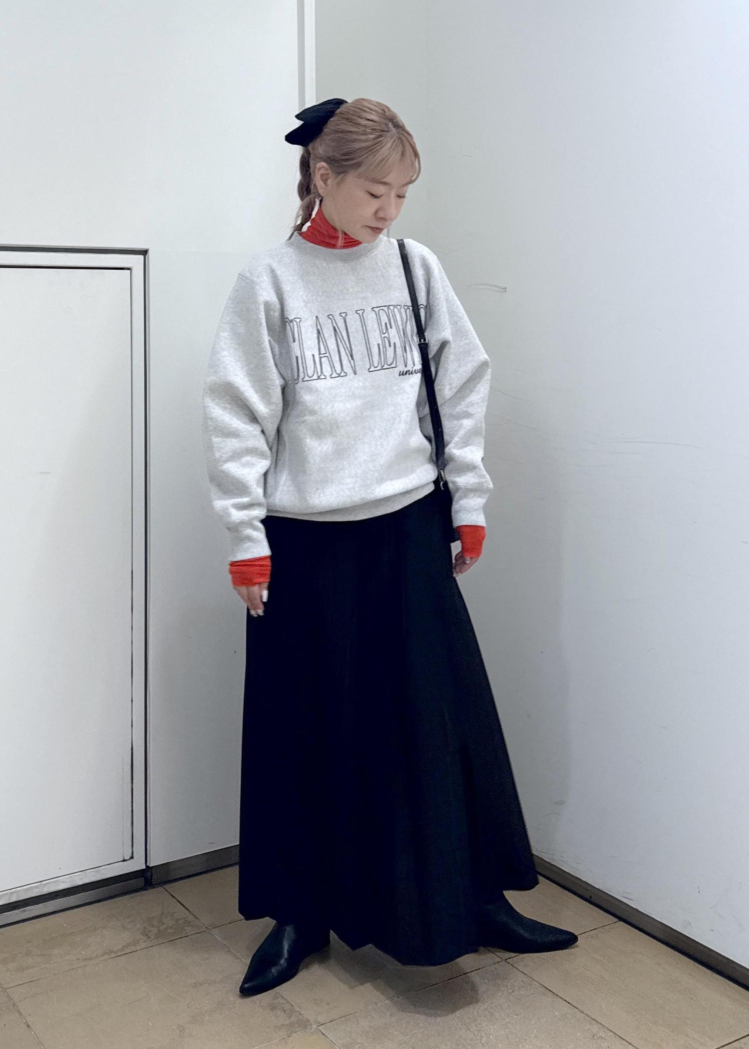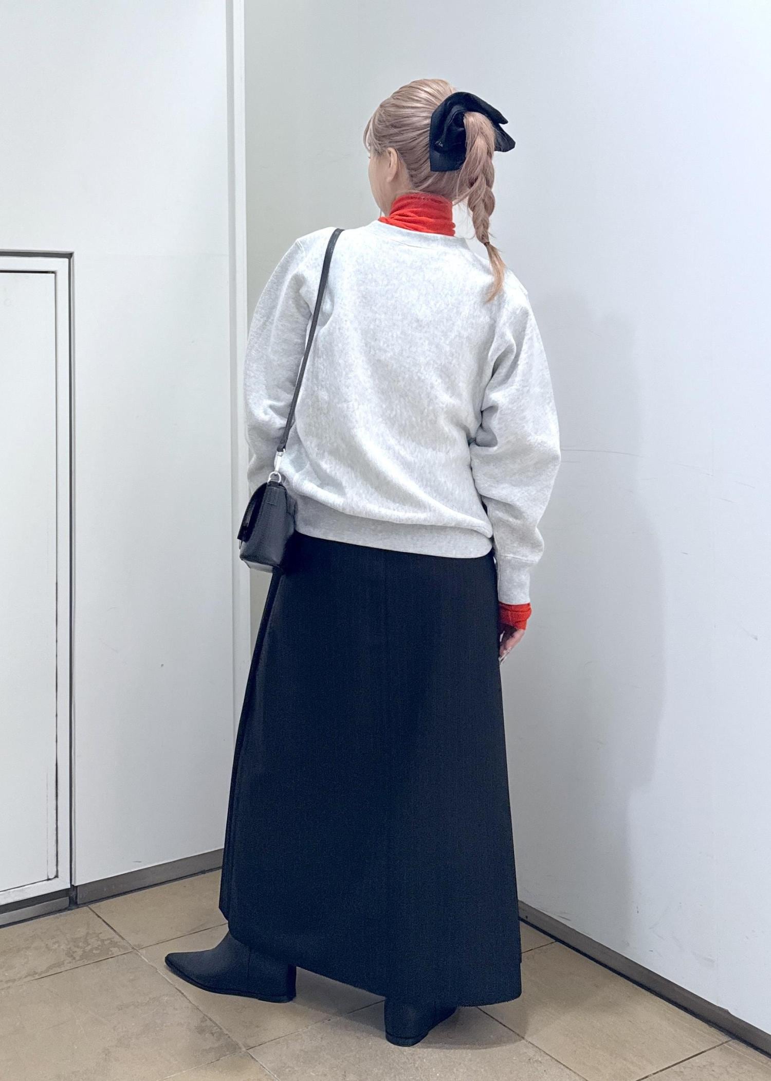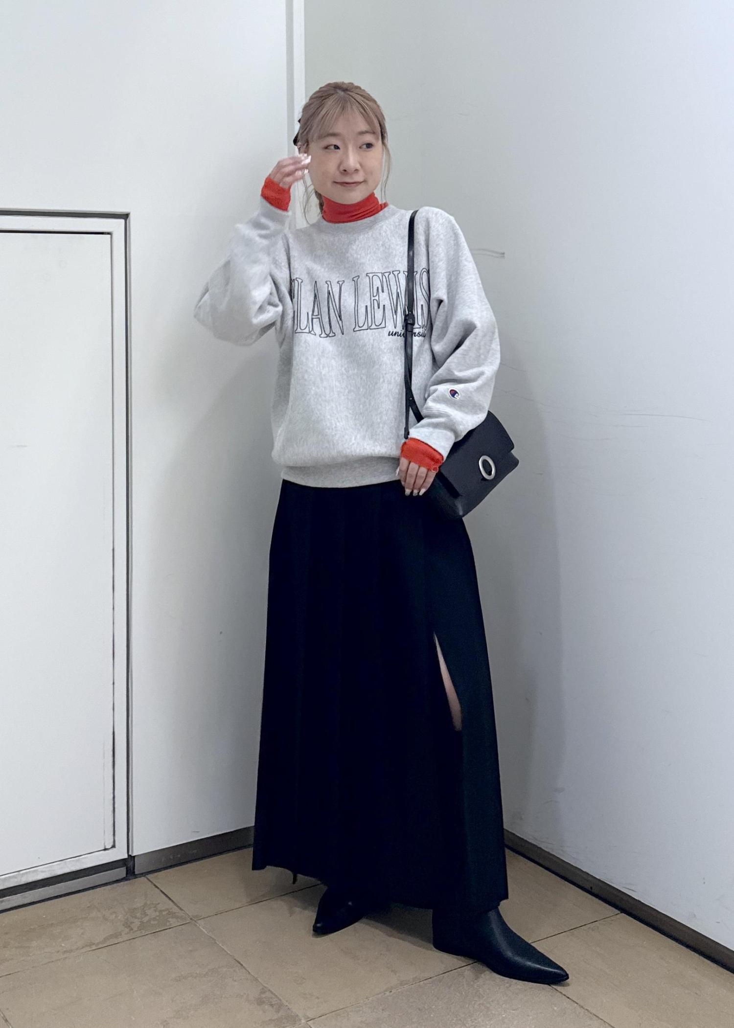 スウェットやニットの中にも着やすくコーディネートを楽しめます! -