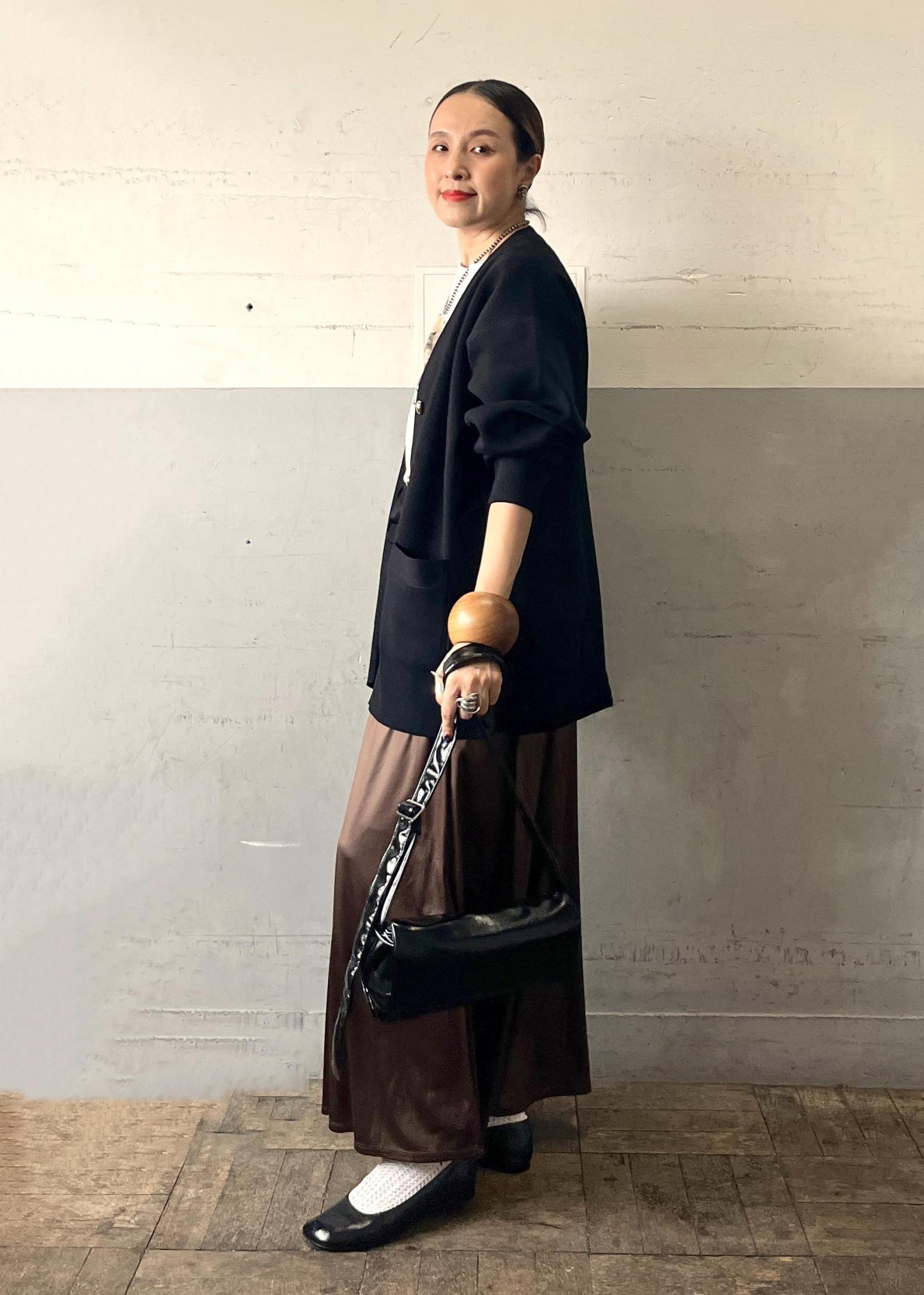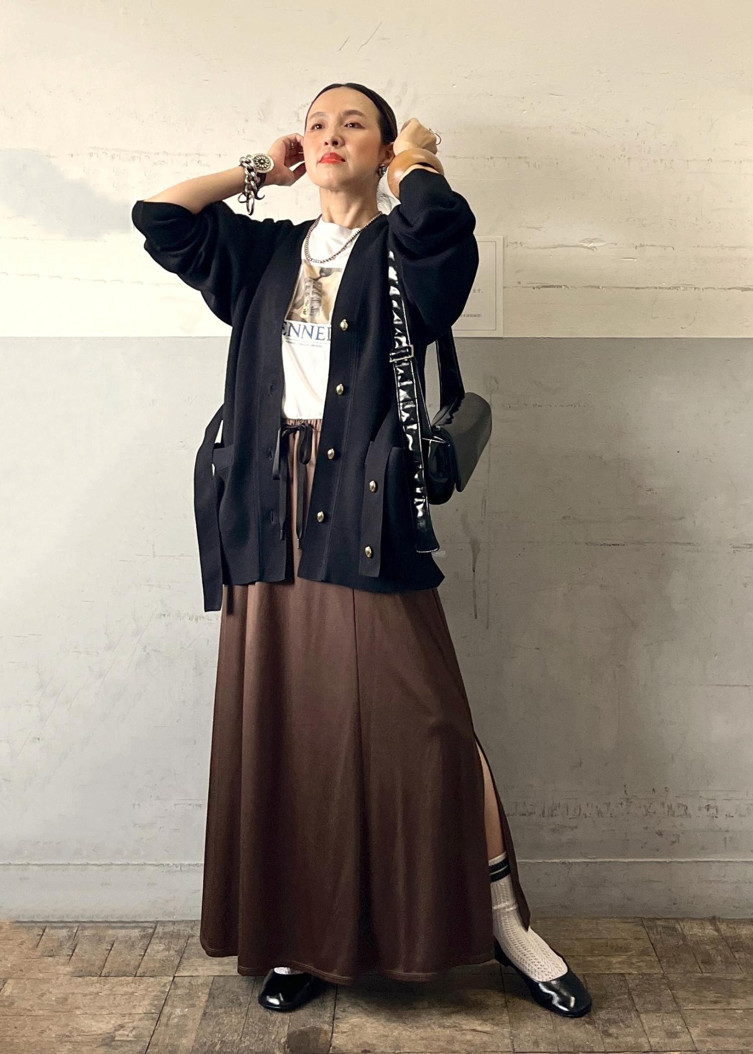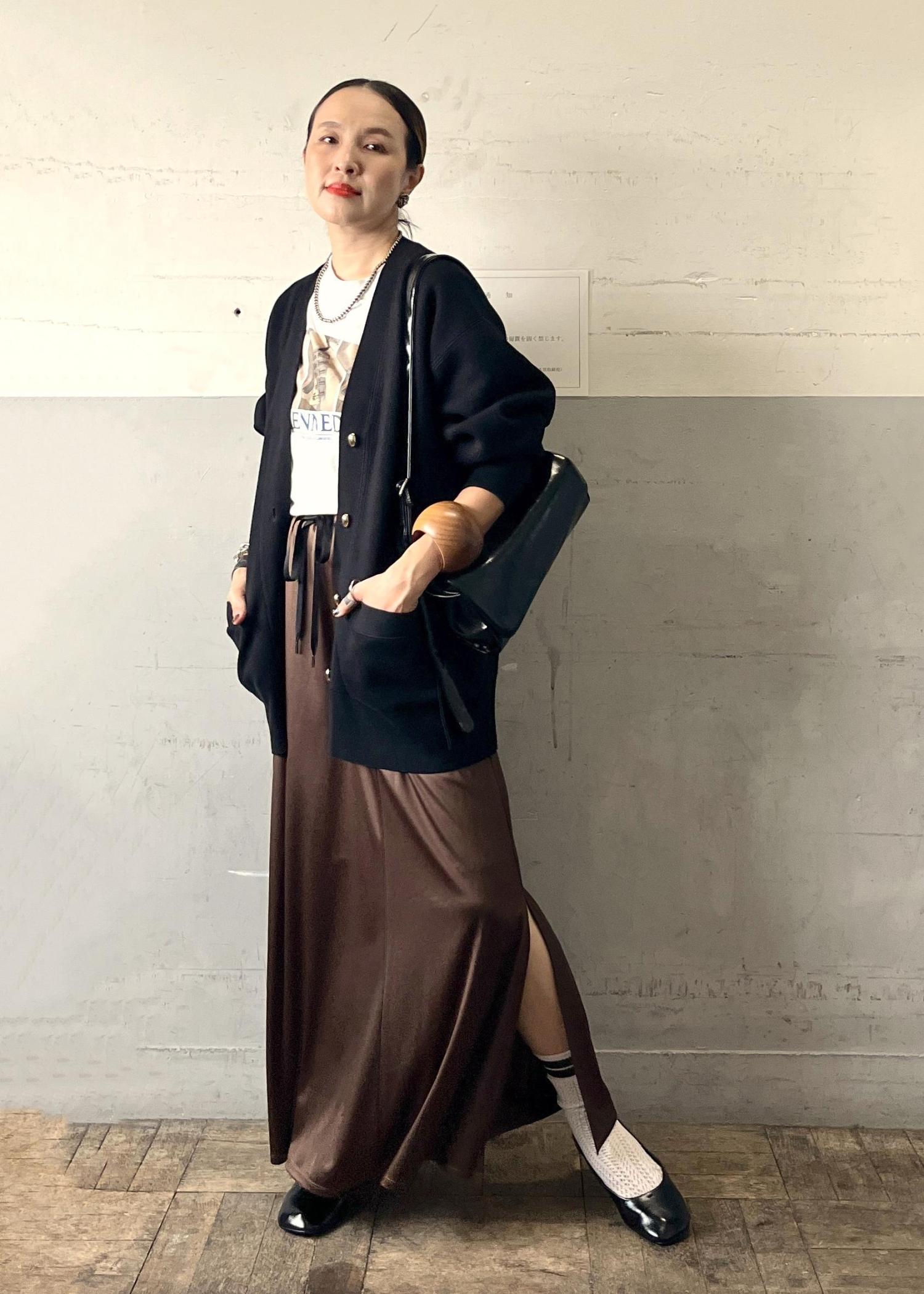 艶のあるスカートをカーディガンでさらりとまとめた大人カジュアル。