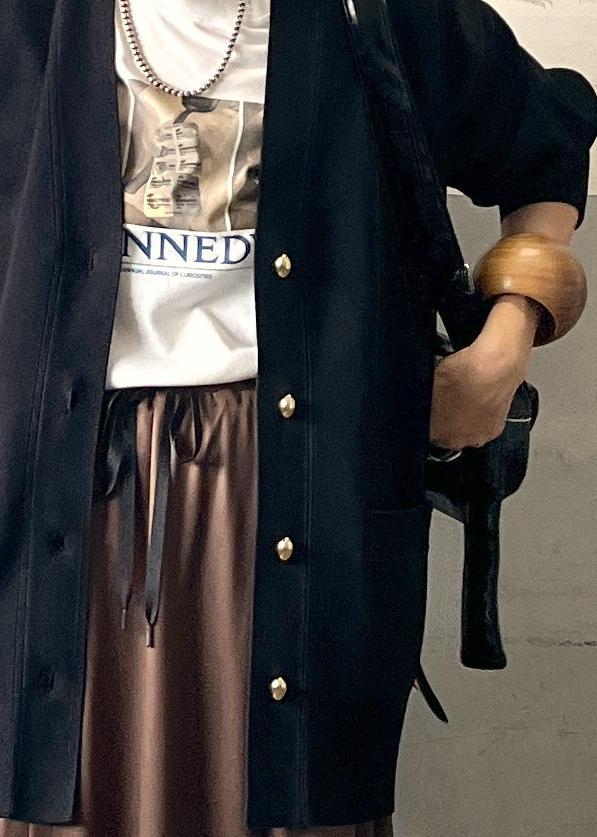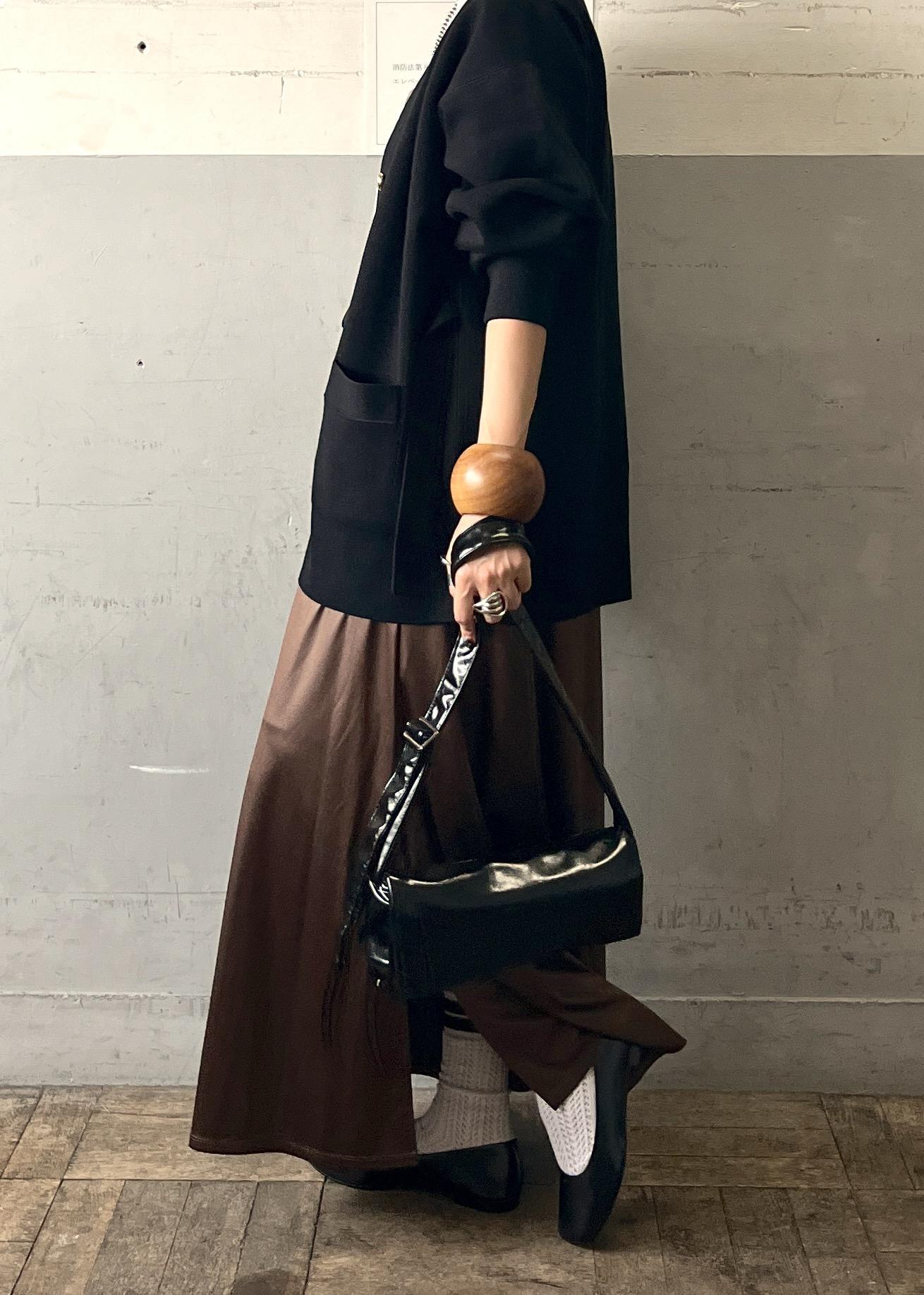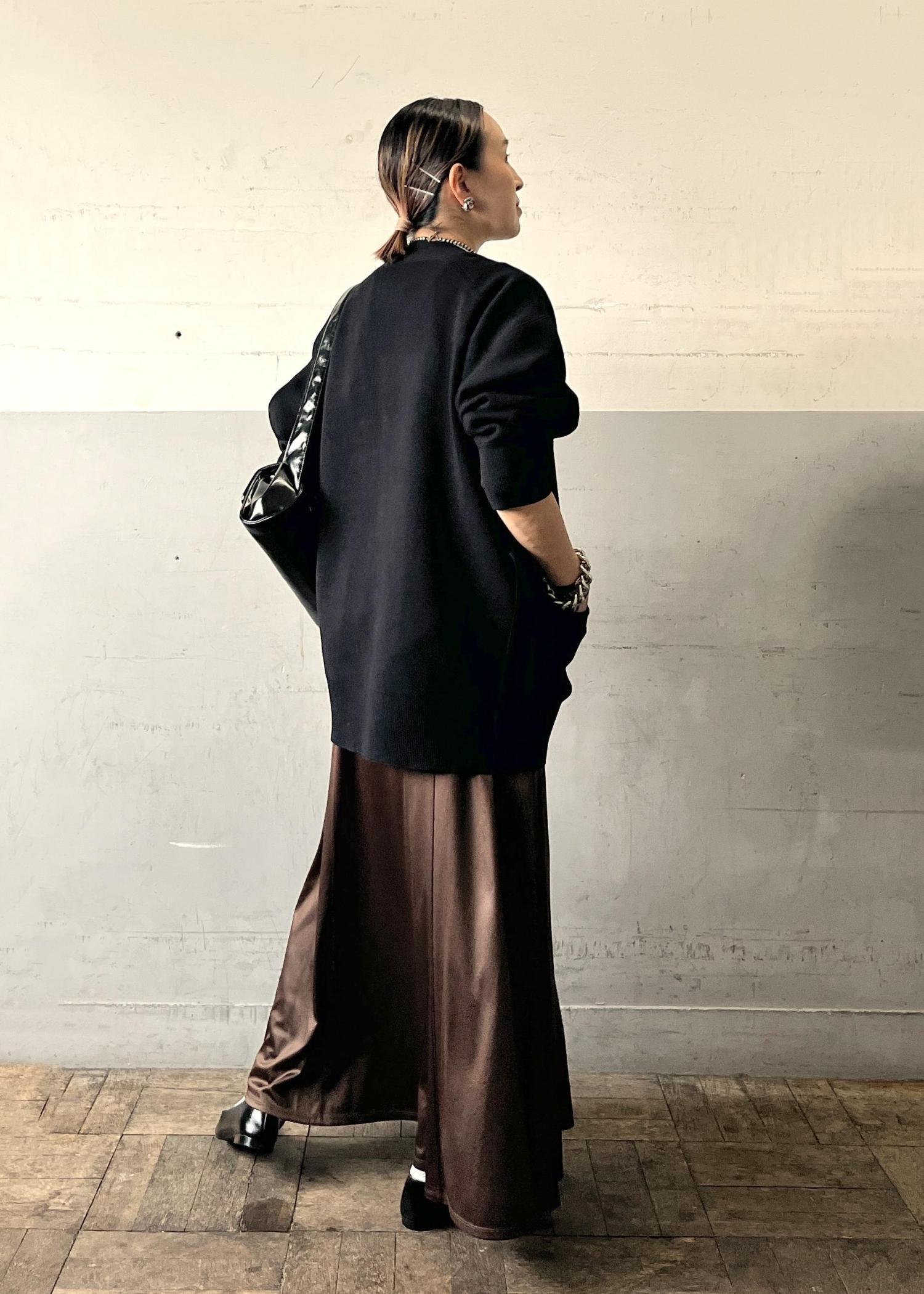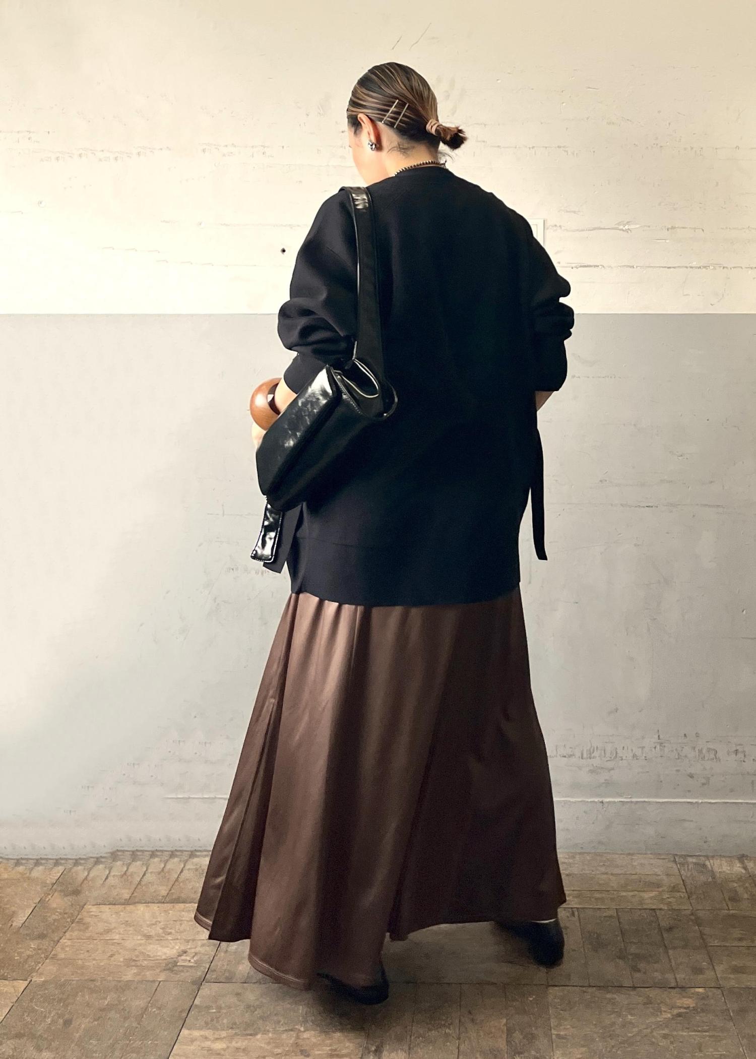 艶のあるスカートをカーディガンでさらりとまとめた大人カジュアル。