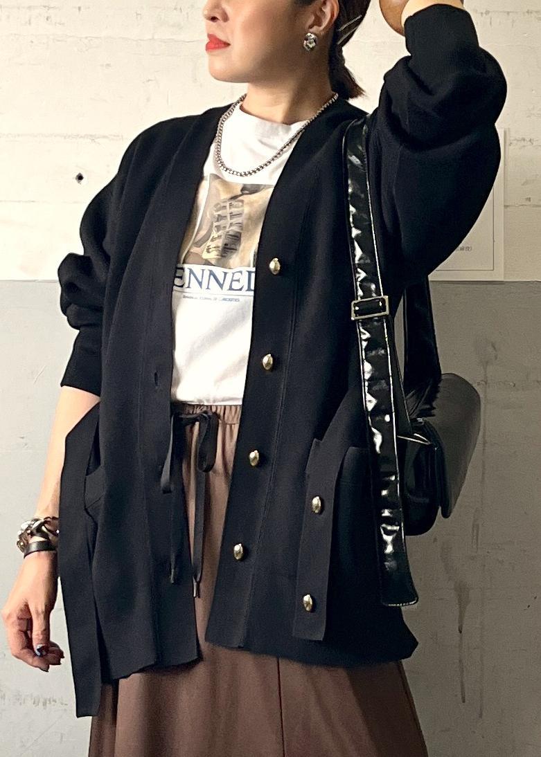 お尻が隠れる長さのベルテッドカーディガン。ウエストのベルトでスタイルアップも◎ ゴールドのボタンがポイントになって綺麗目な印象に。アームがゆったりしているのでインナー選びも簡単です。