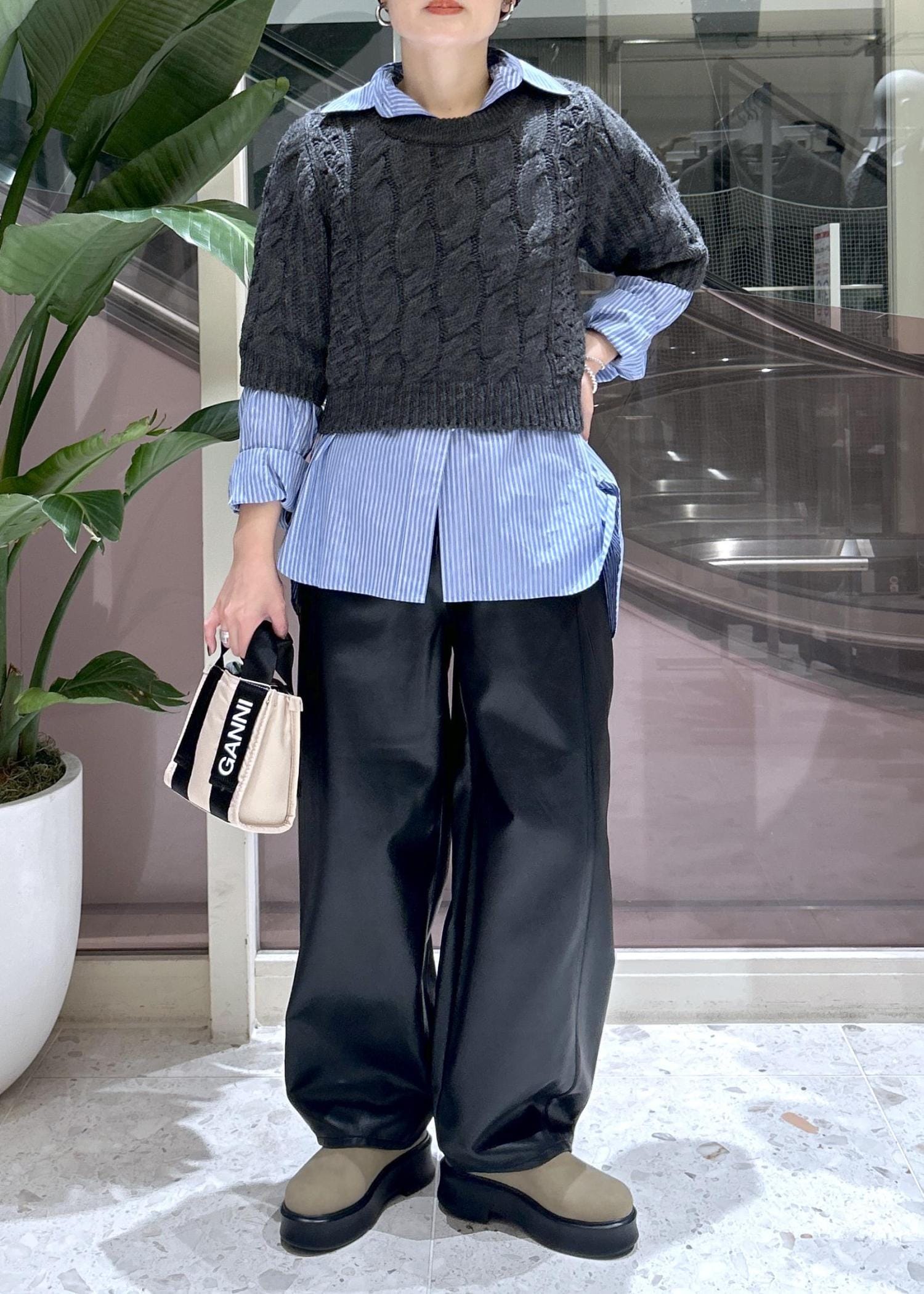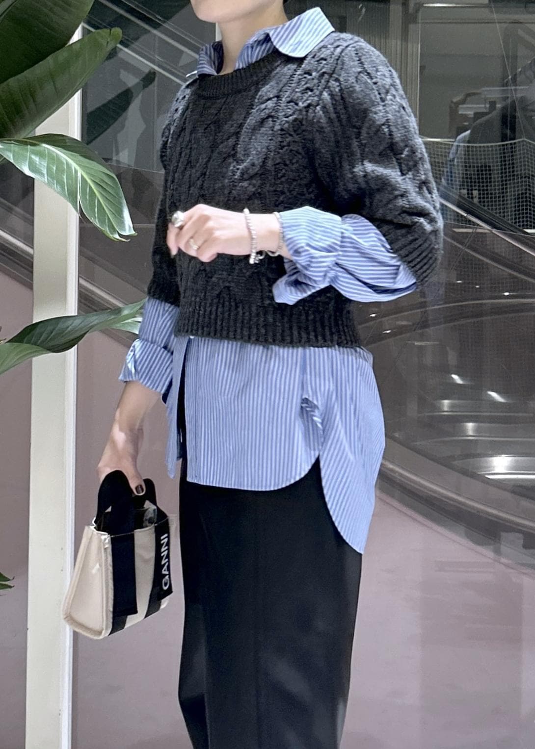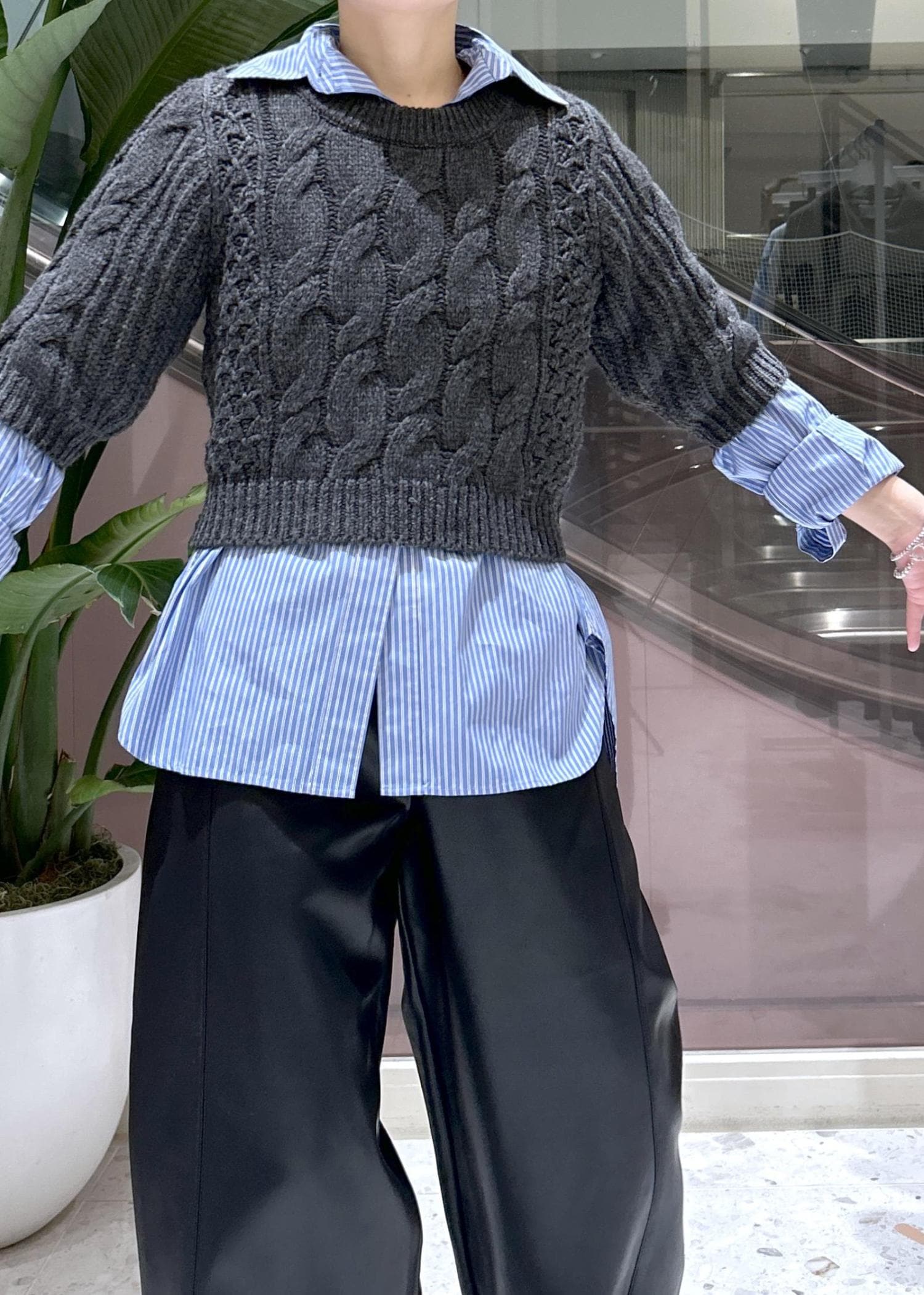 ハーフ丈の袖が可愛いケーブルニットはグレーがお気に入り。