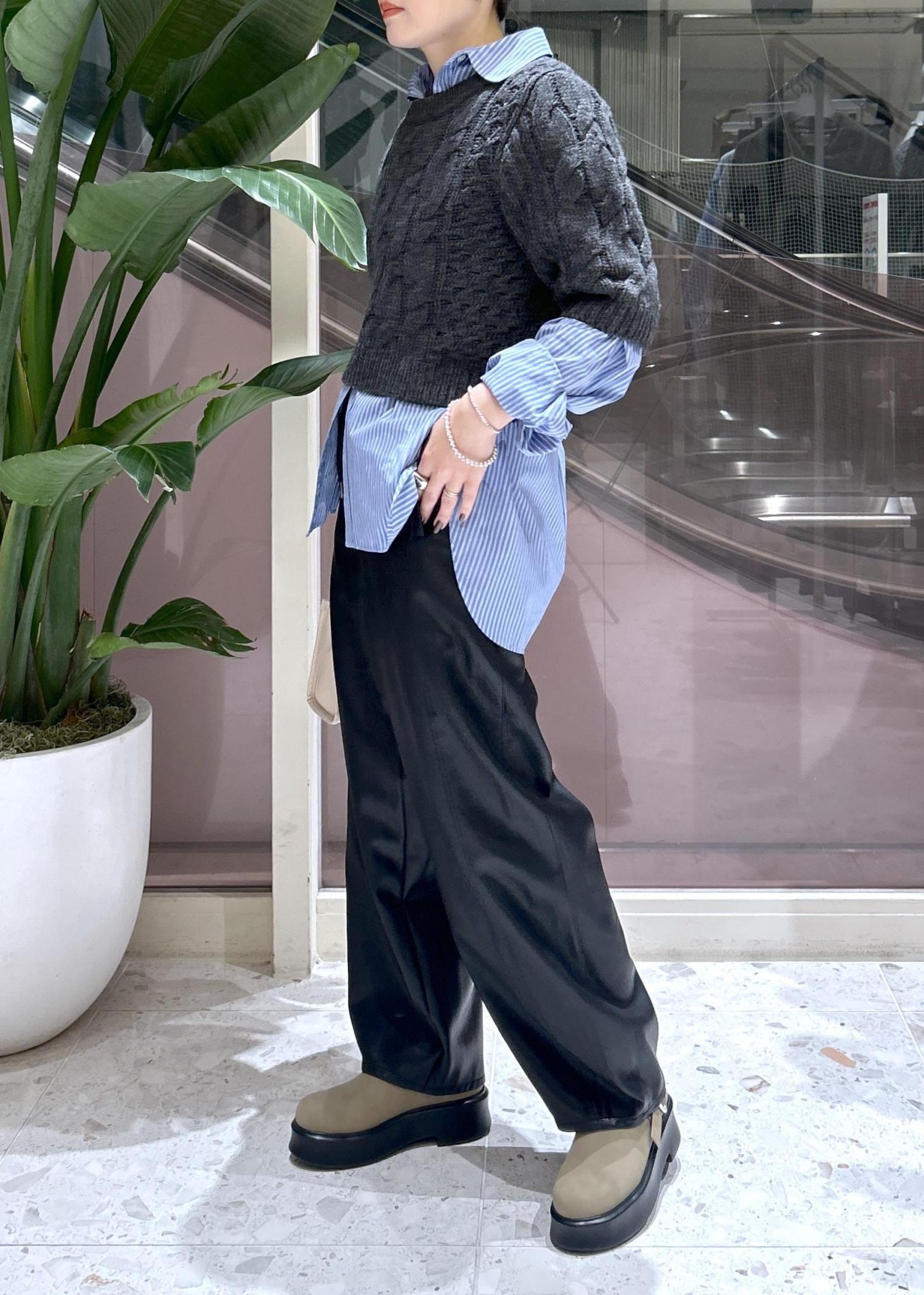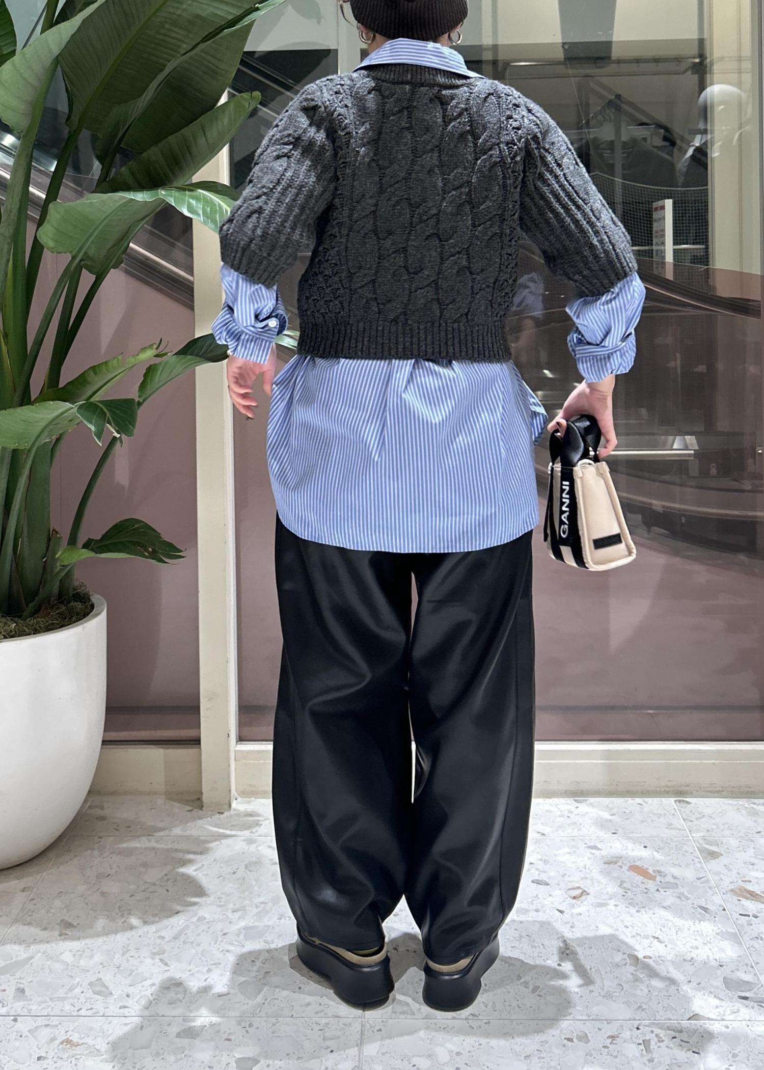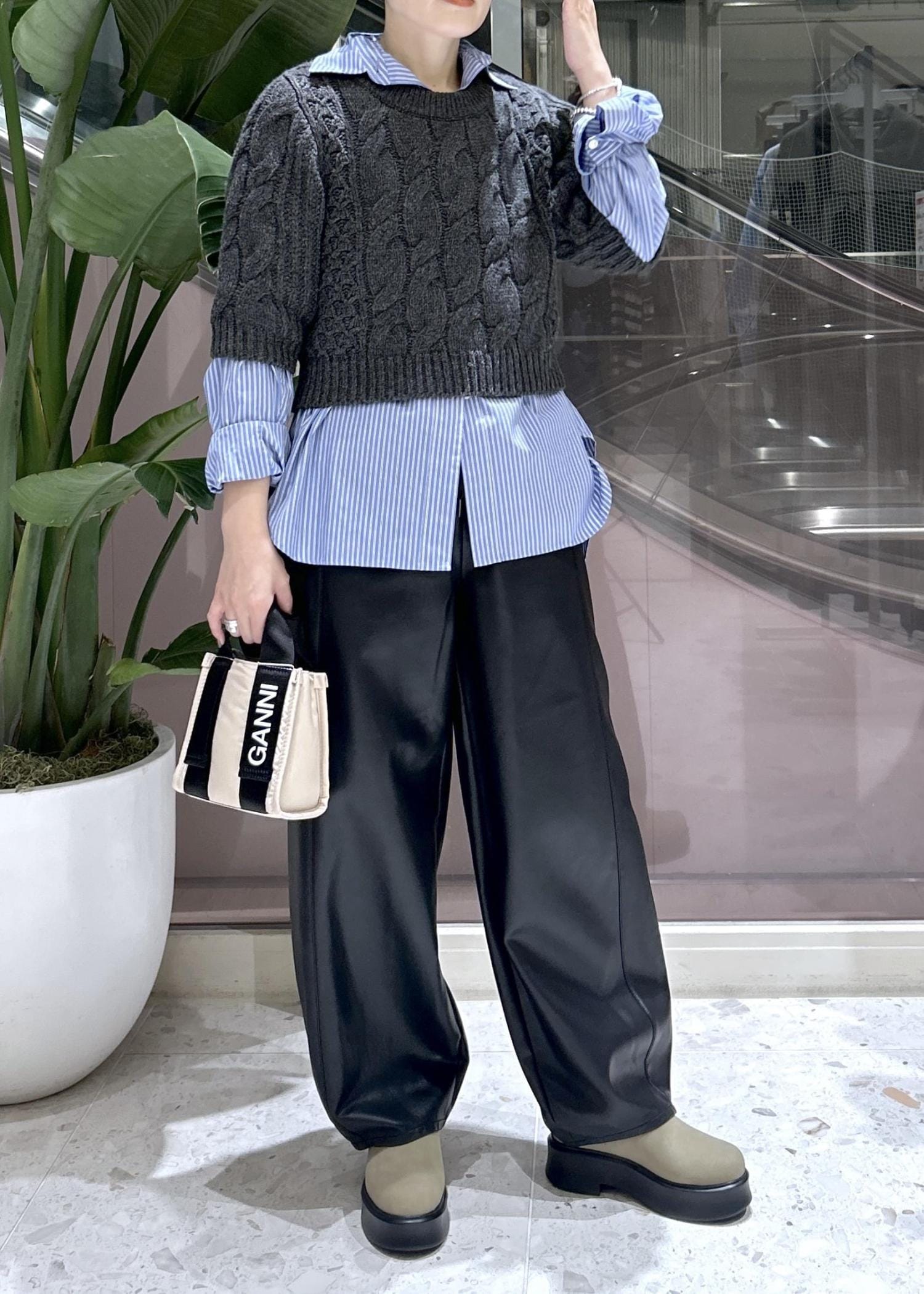 ハーフ丈の袖が可愛いケーブルニットはグレーがお気に入り。