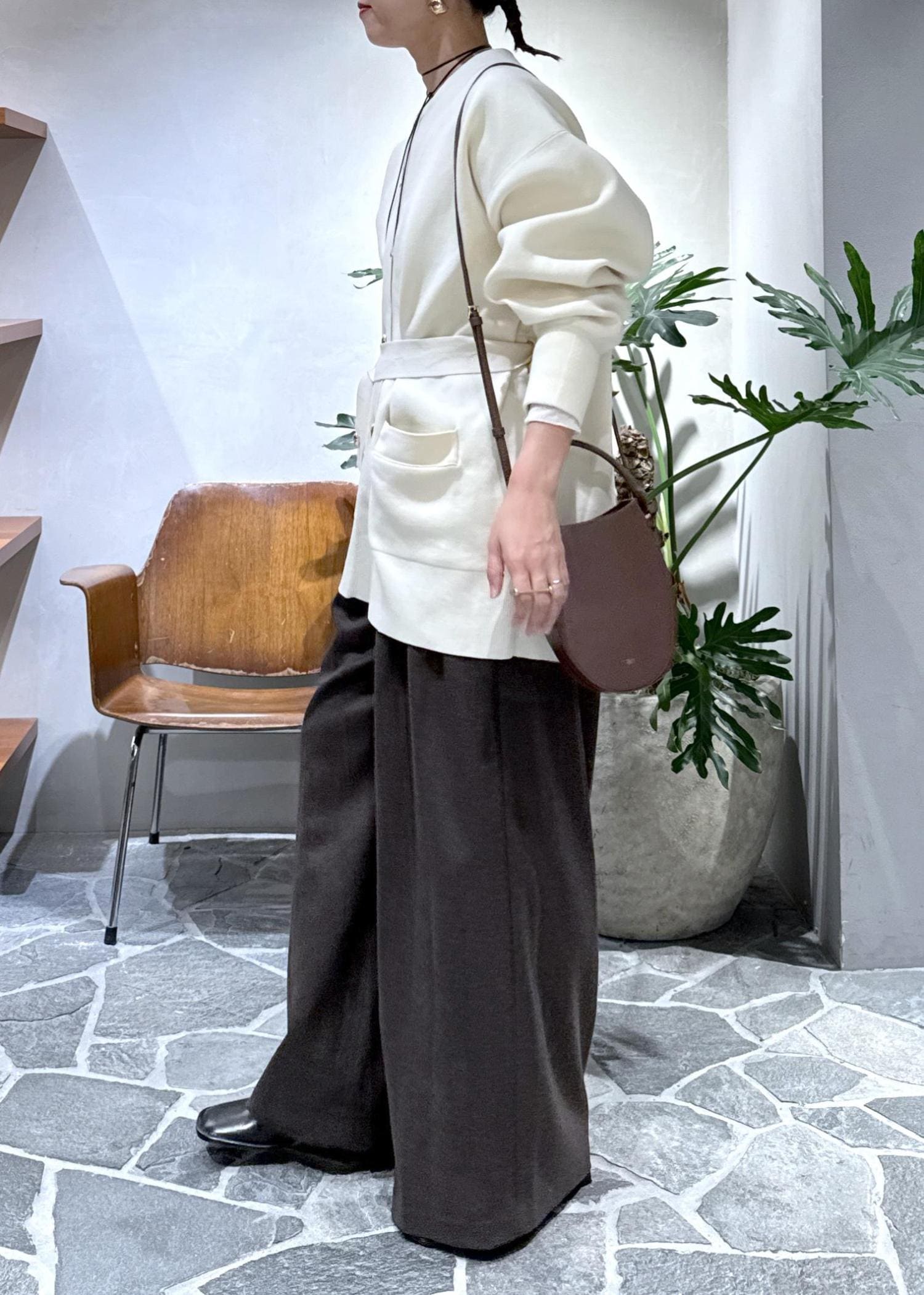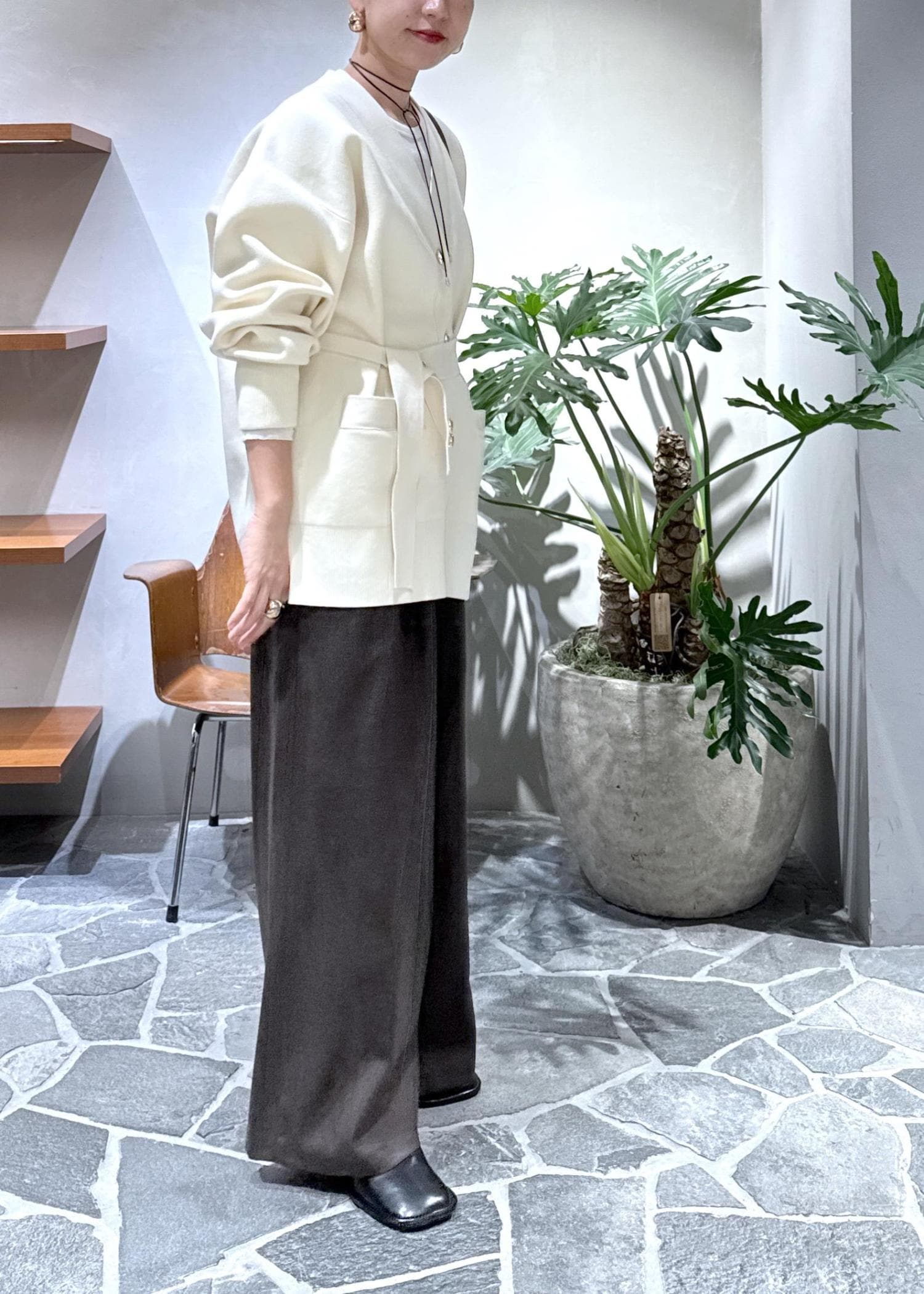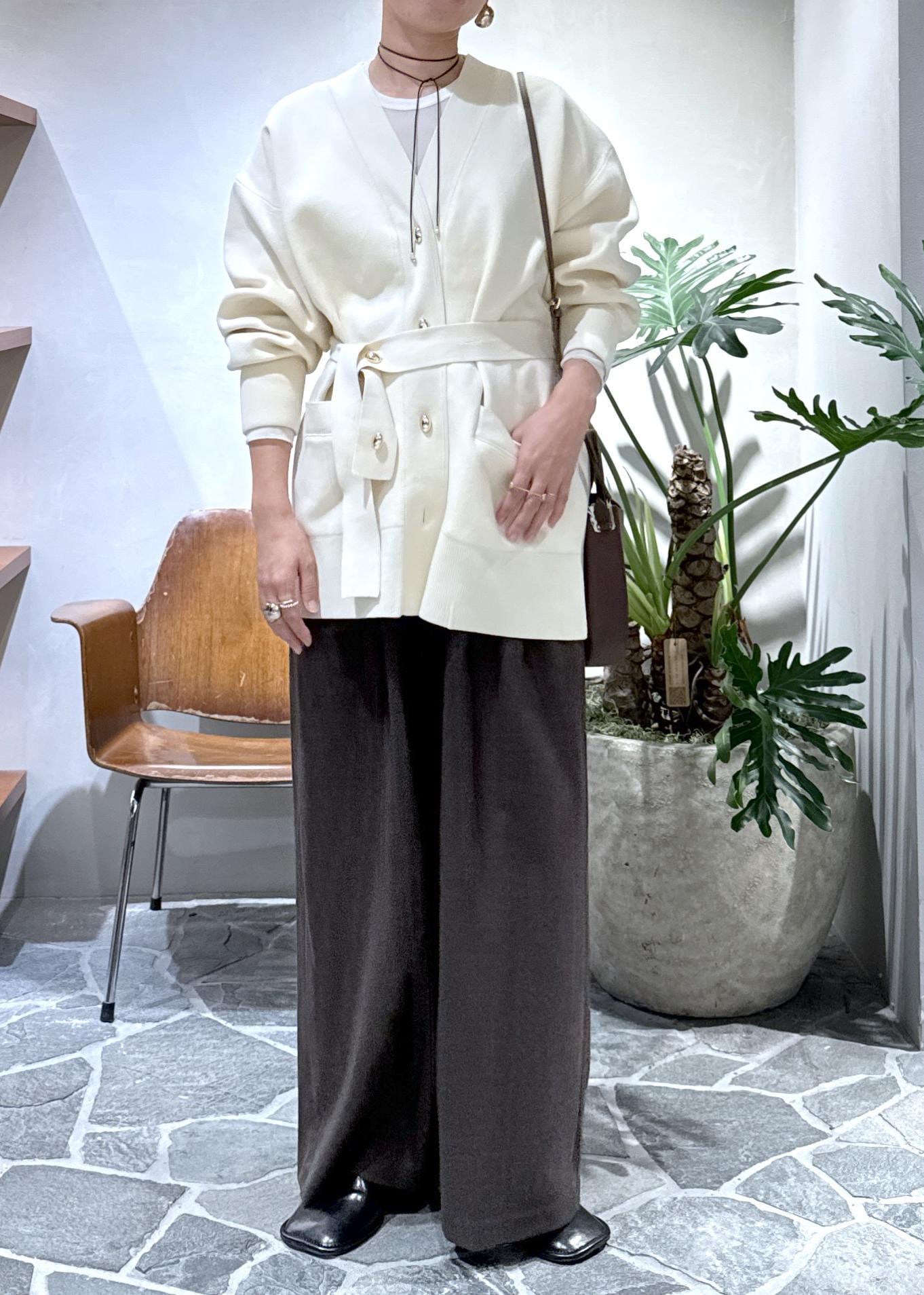 カーディガンのウエストベルトを巻くことでガウン風に大人っぽく着用できます。