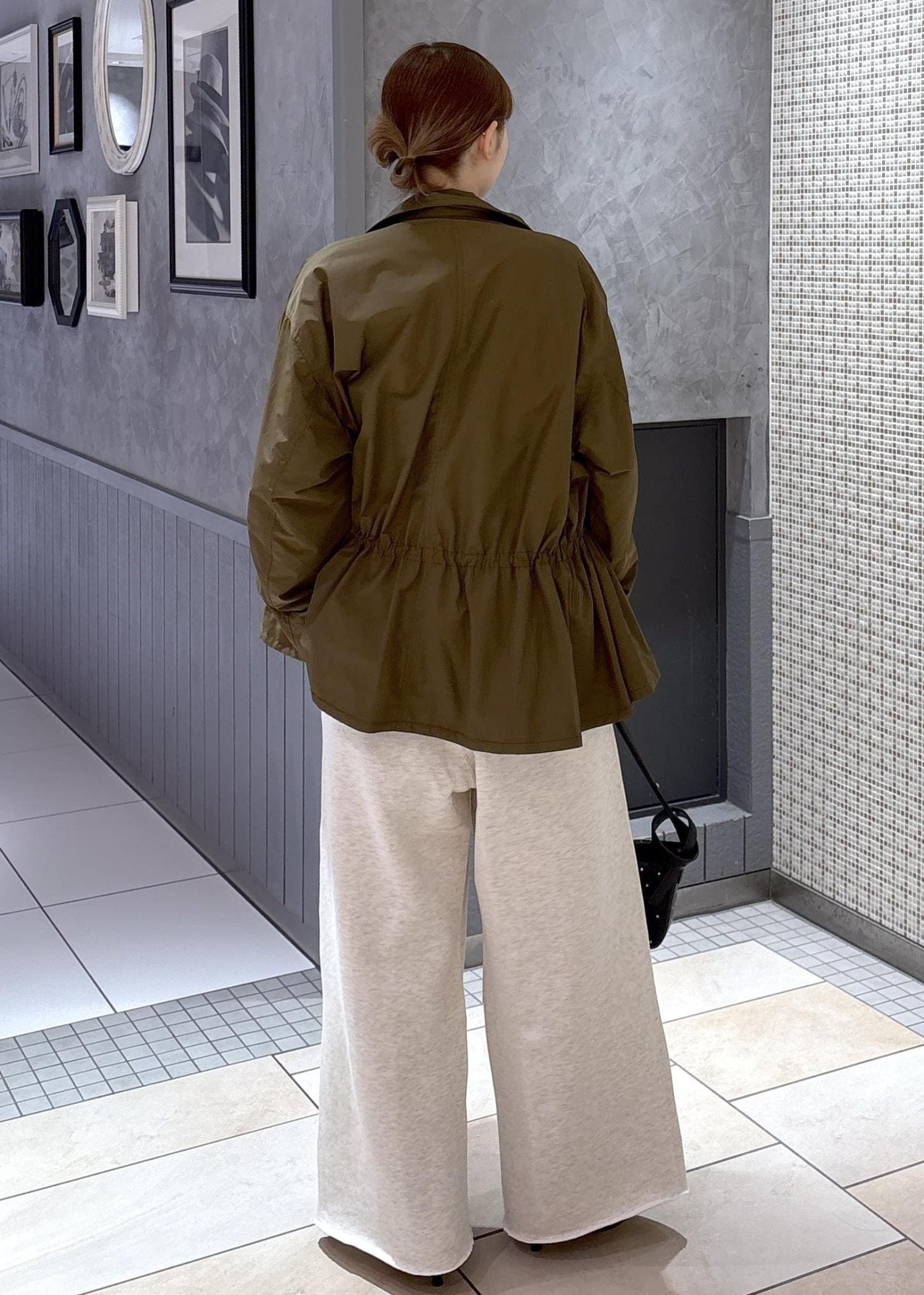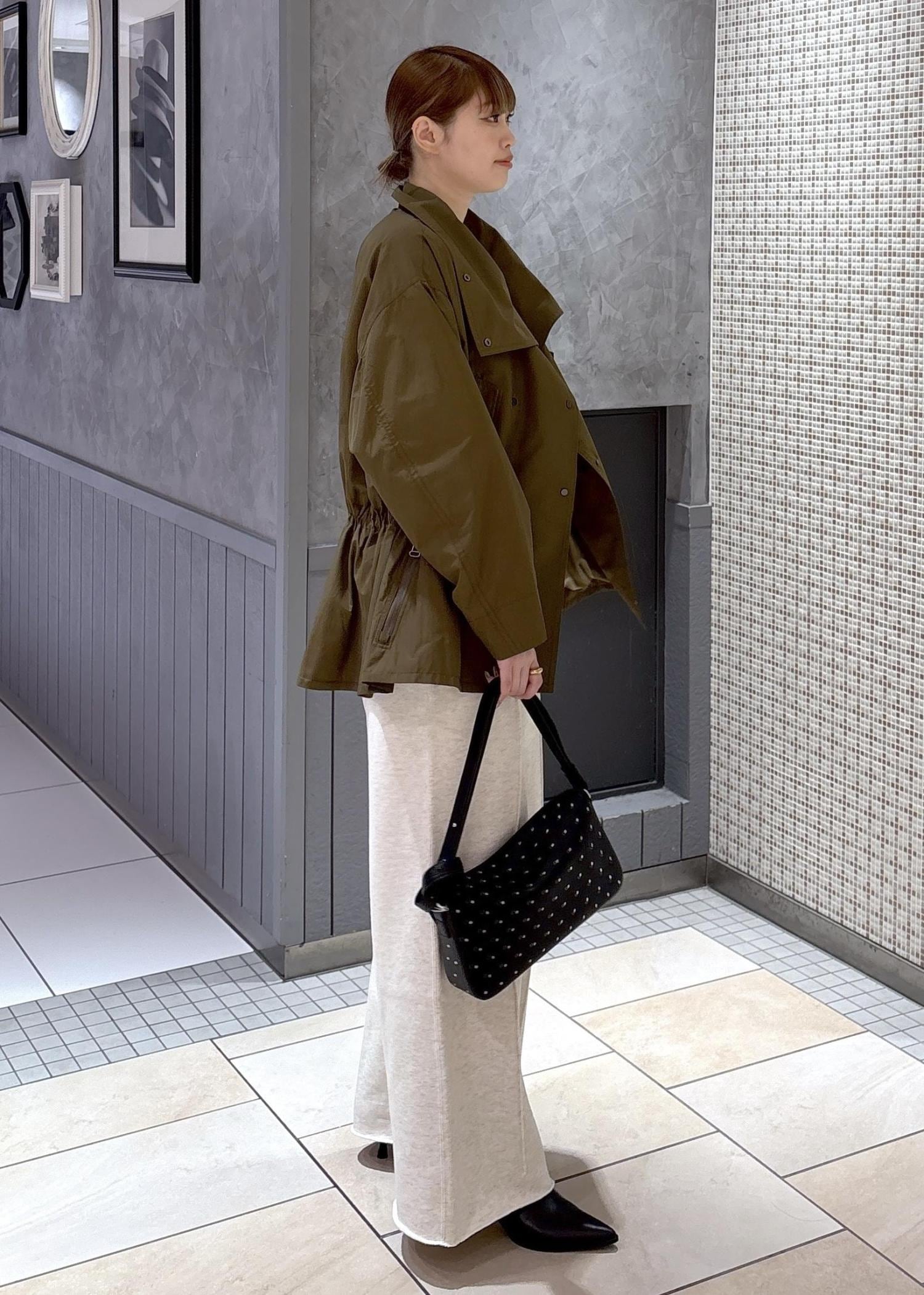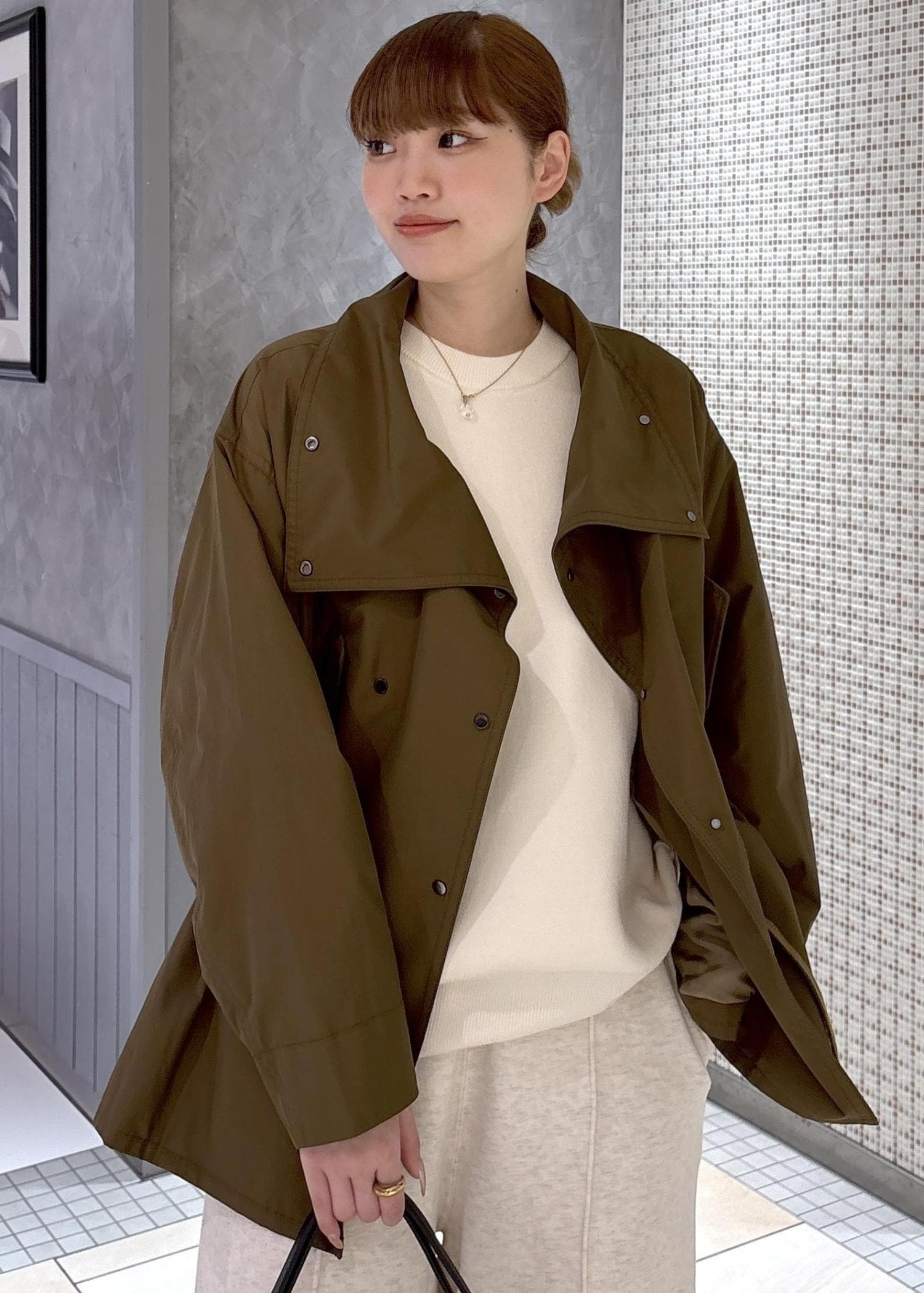 軽めな素材感でドロストしてあげるとより女性らしく、首元を止めてあげるとマニッシュな感じに着られる変化を楽しめるアウターです!