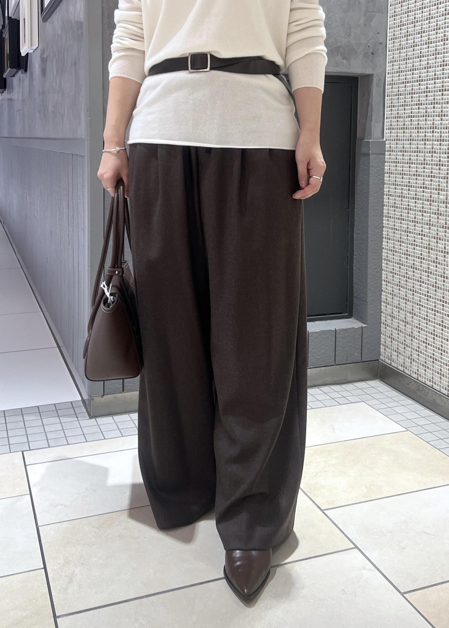 ウエストは紐が通ってるので、楽に着られるのにきちんと見えするパンツです。丈感も程よく、しっかりワイド感のあるデザインです! -