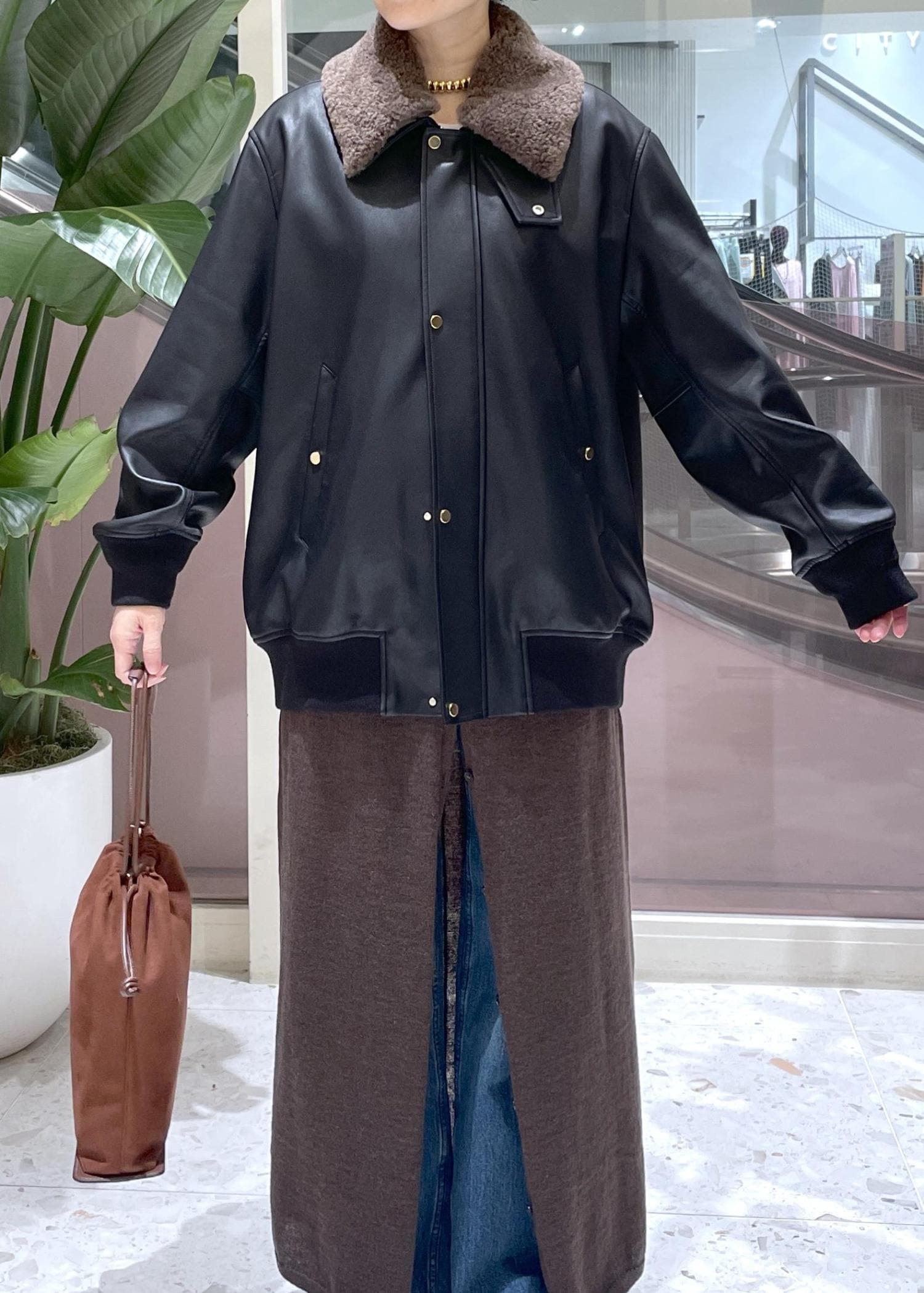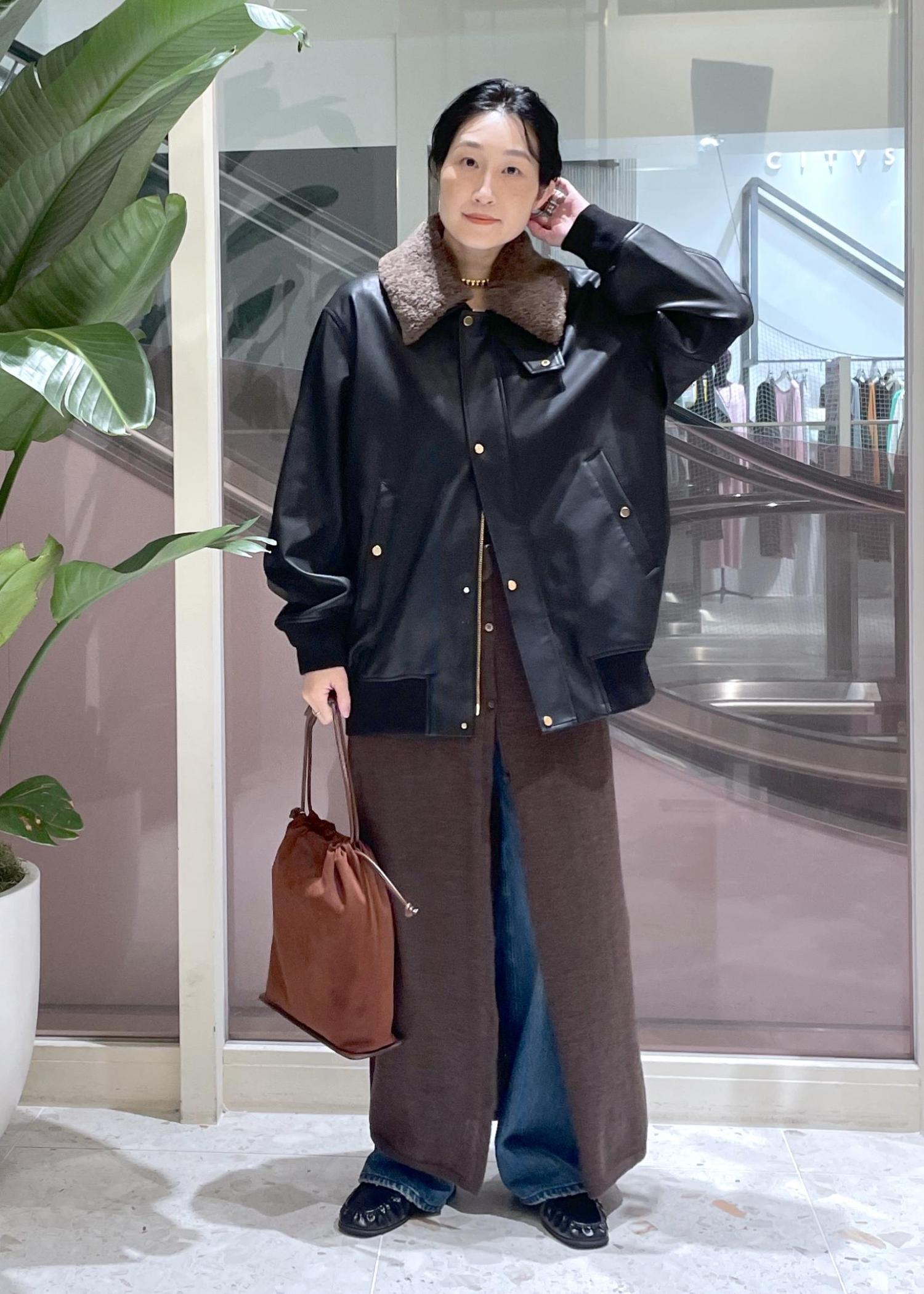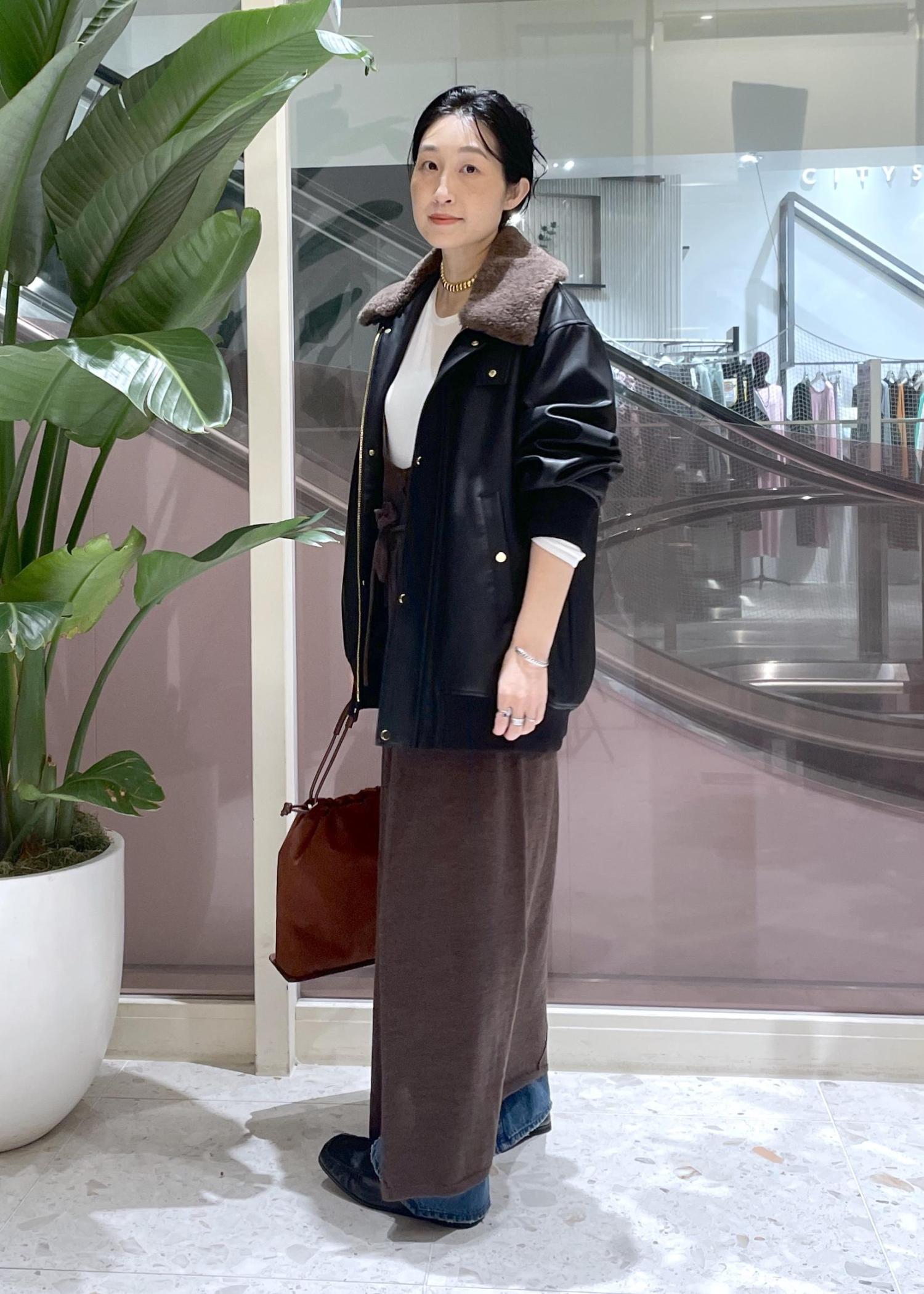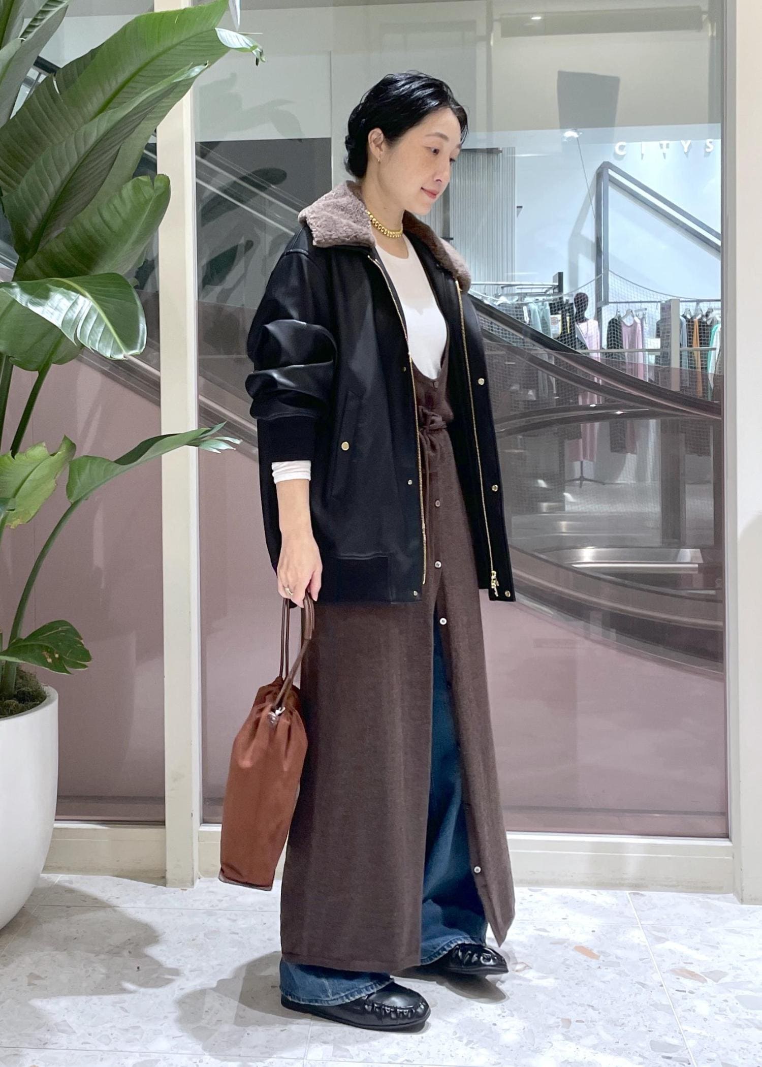 取り外し可能なボア襟もアクセントになり、着丈がやや長めなので何にでも合わせやすいです。