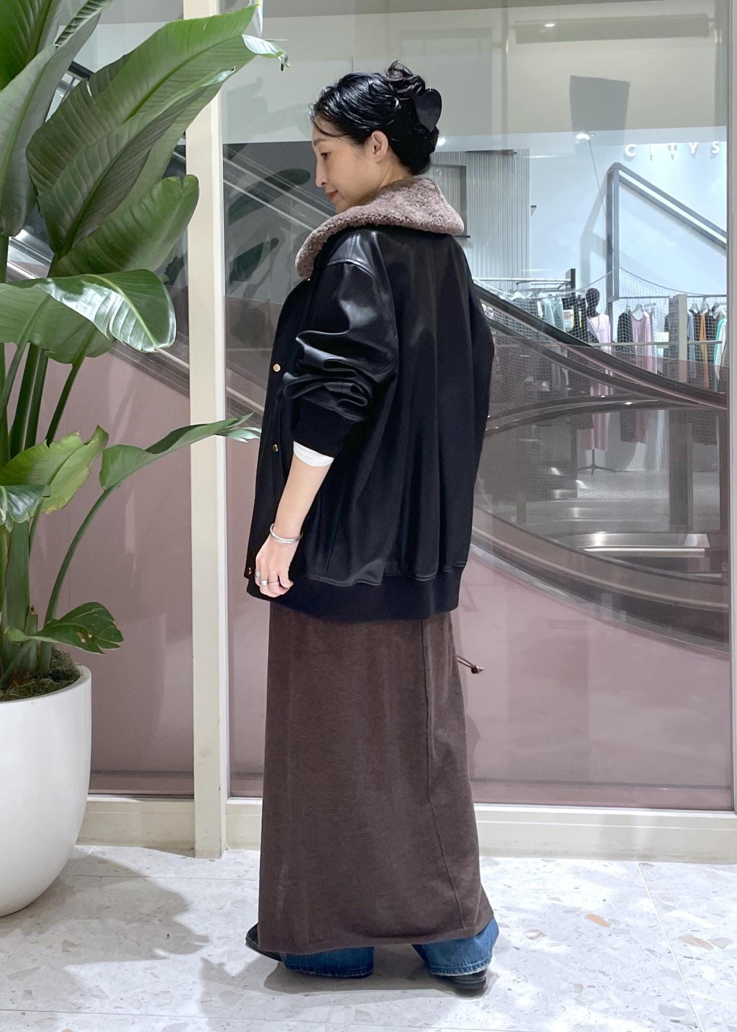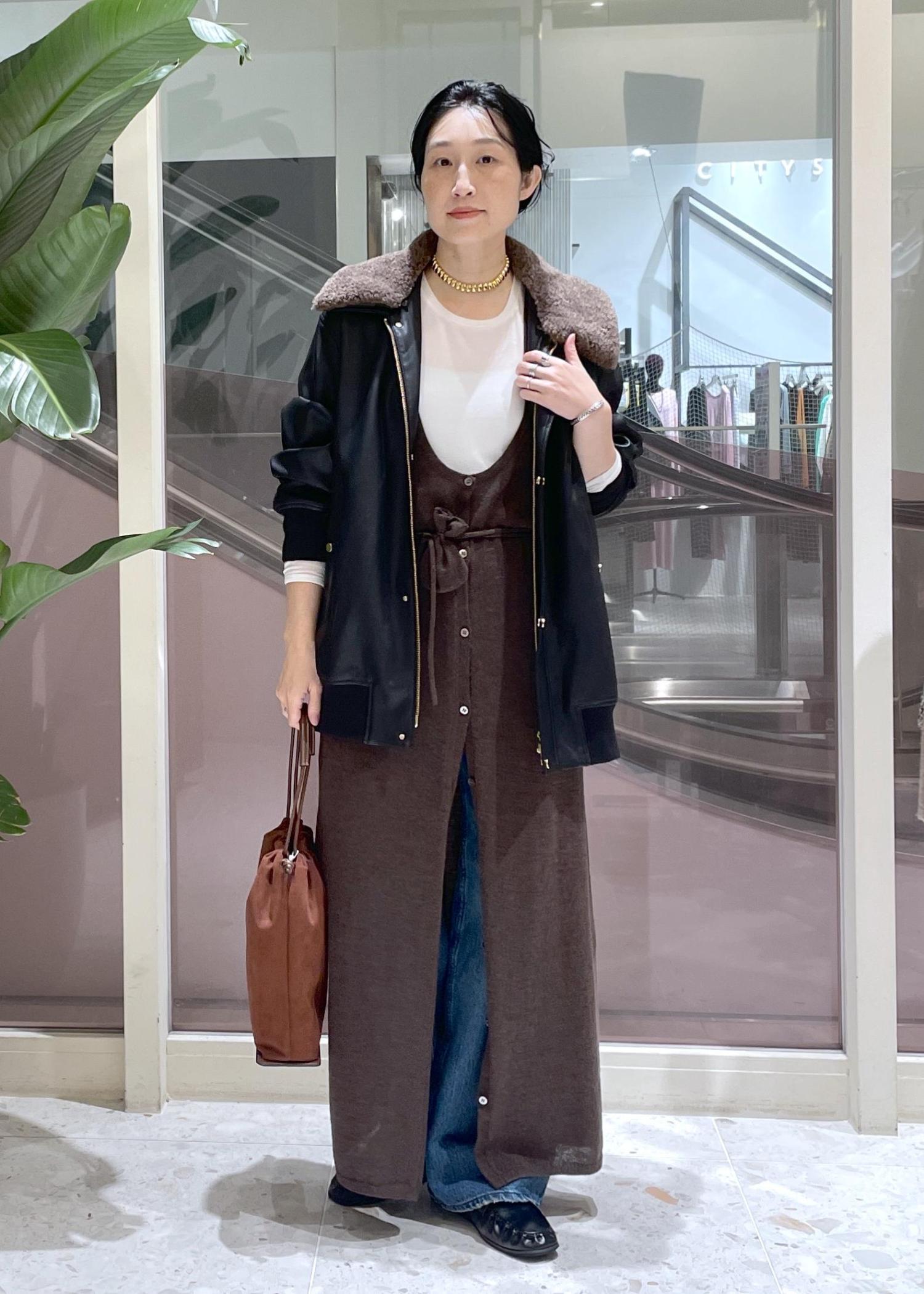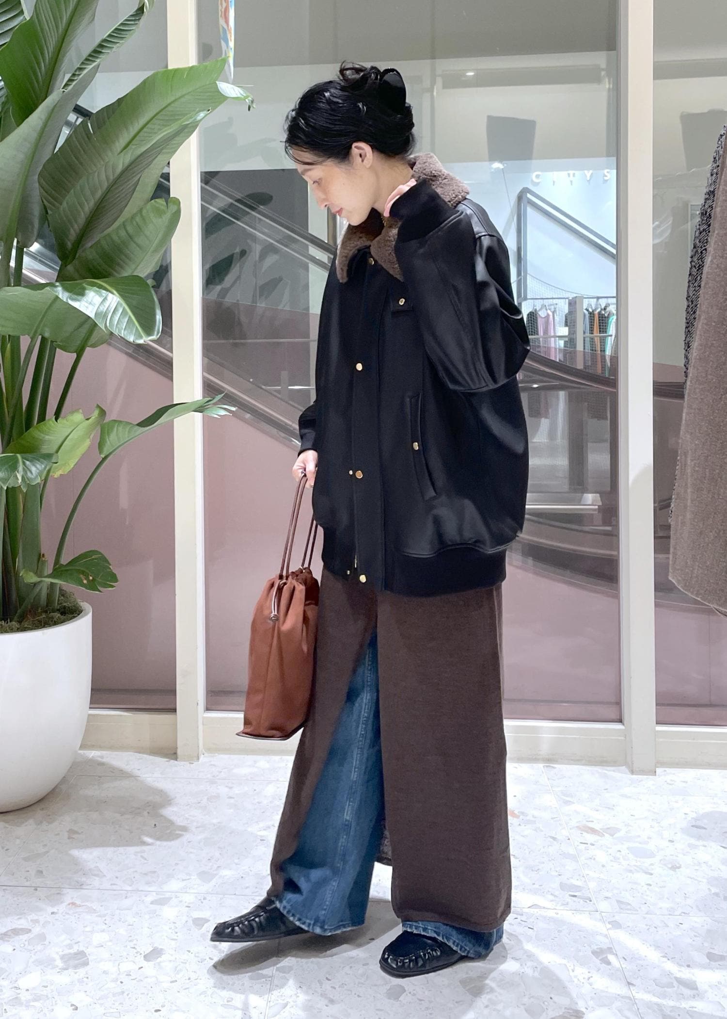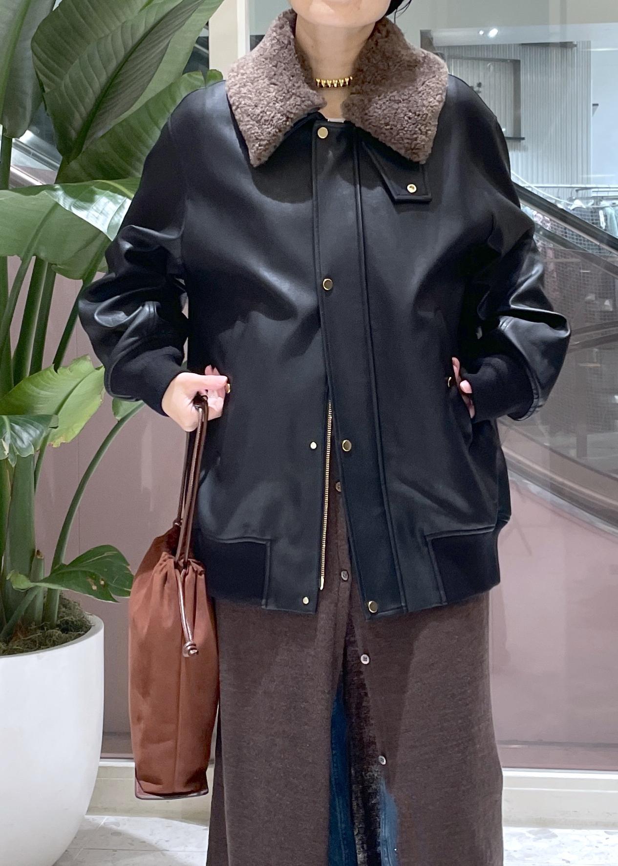 取り外し可能なボア襟もアクセントになり、着丈がやや長めなので何にでも合わせやすいです。