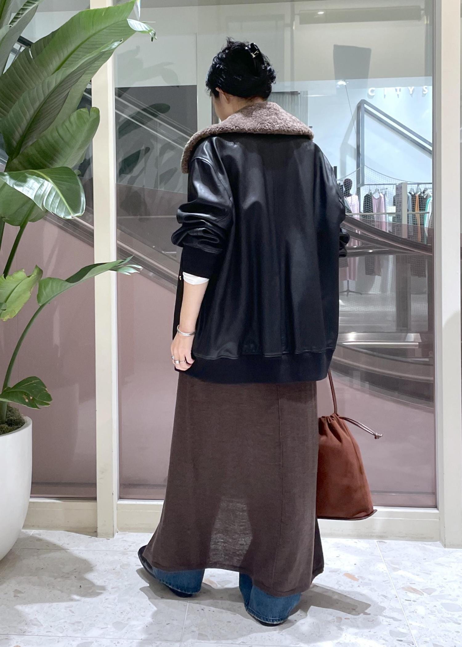 ADAM ET ROPÉ FEMMEシンセティックレザーフライトジャケットブラック / F¥39,600レビューお尻にかかるやや長めの着丈ですが、ストンと落ちるシルエットでボリュームがですぎず、すっきりと着用できます。
