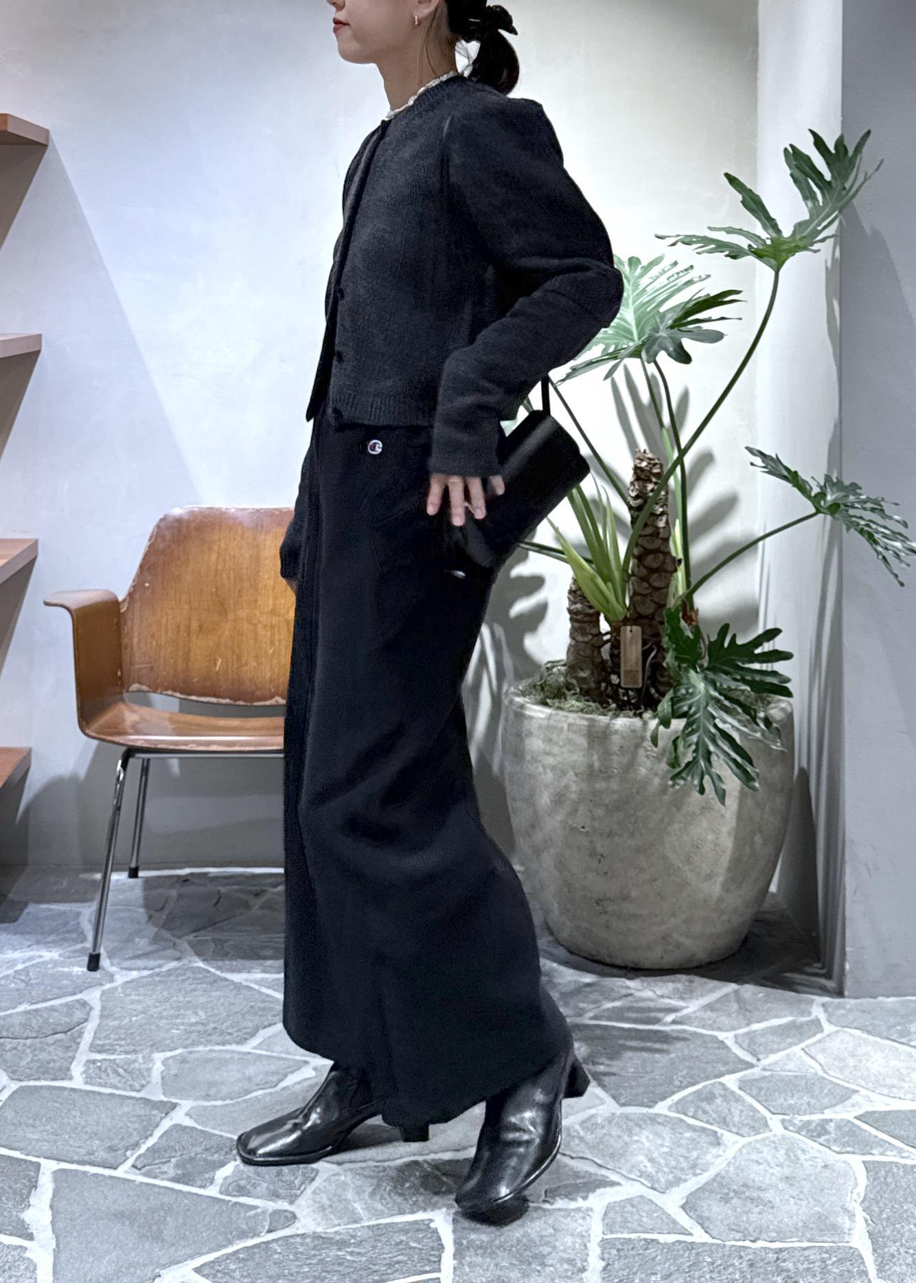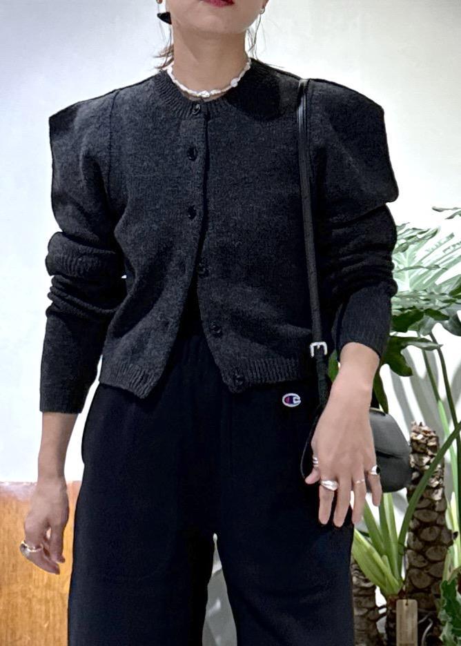 あえて、フェミニンなカーディガンやヘアアクセと合わせました。