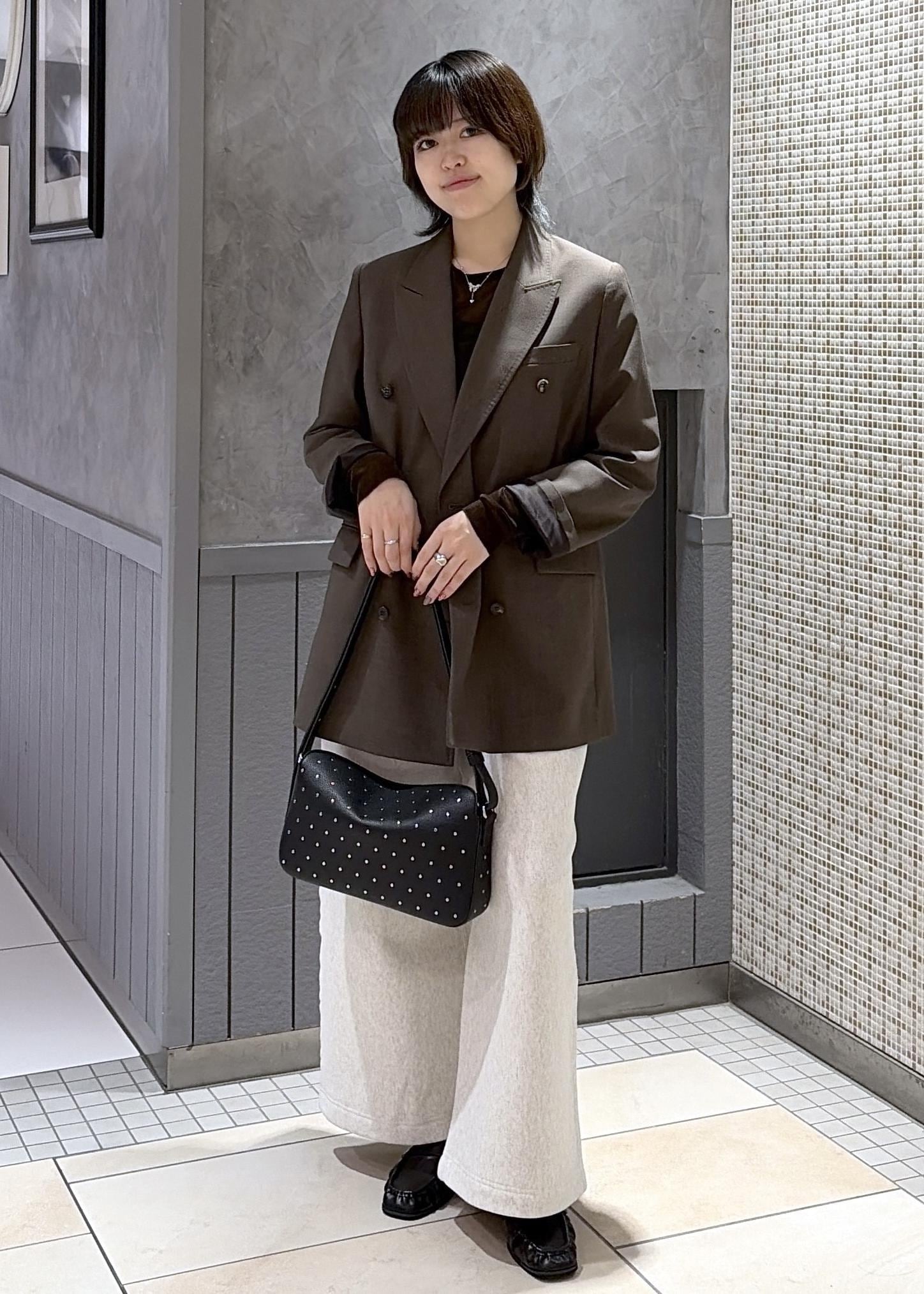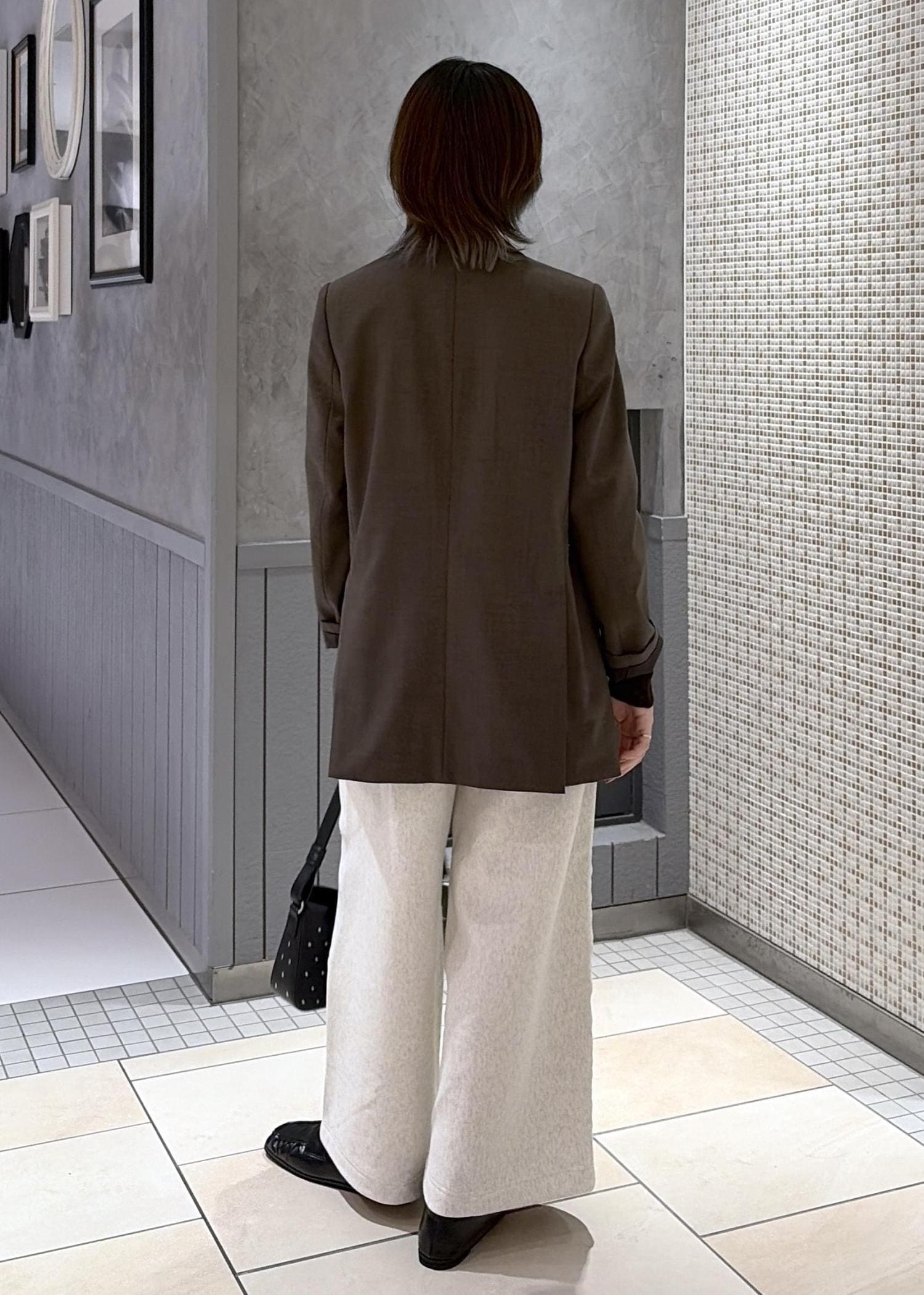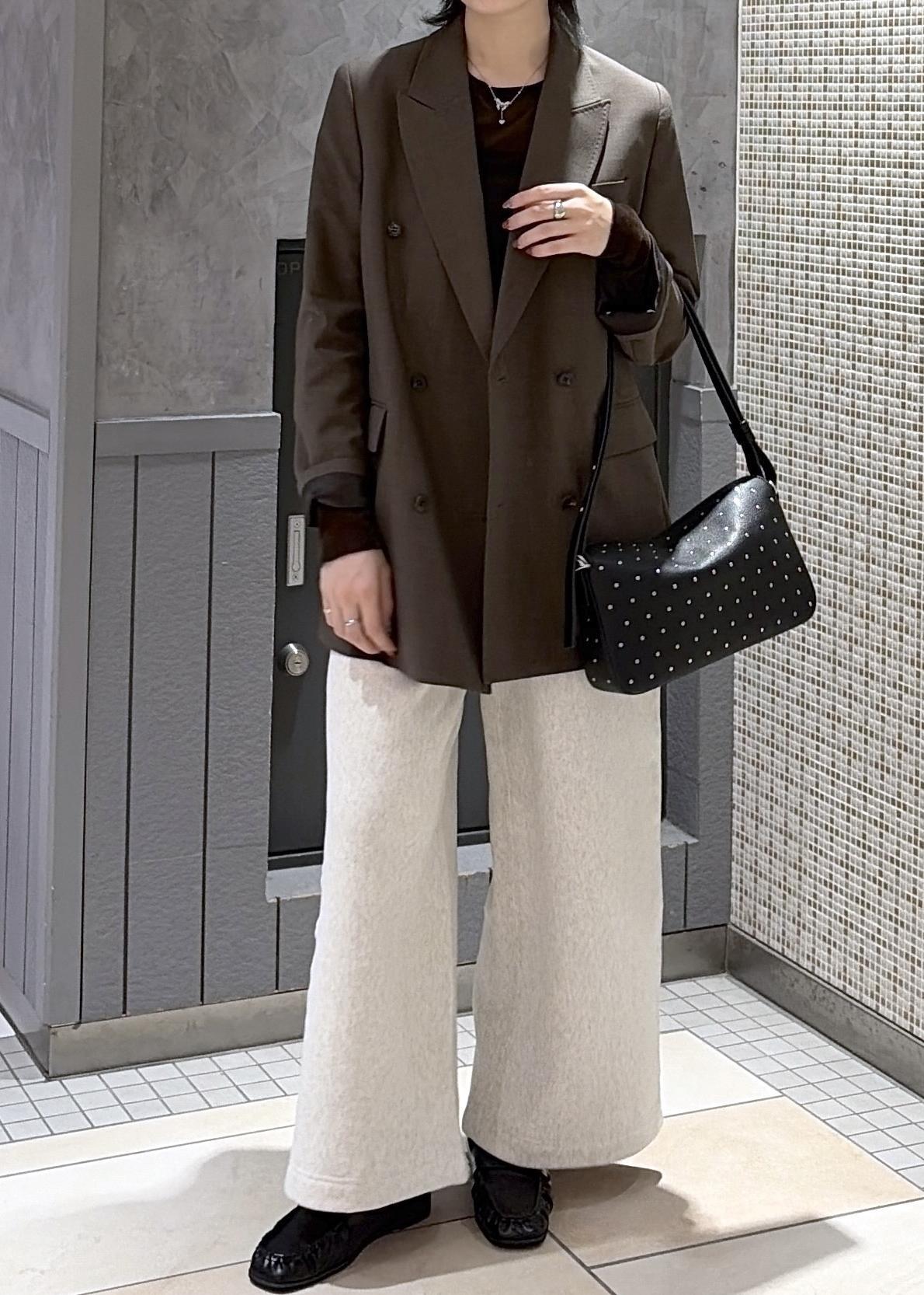 今回はボックスジャケットにスウェットパンツをあわせ、大人カジュアルなコーディネートに仕上げてみました。スウェットパンツは楽ちんだけど、カジュアルすぎてしまう とお悩みの方にもおすすめです⭐︎
