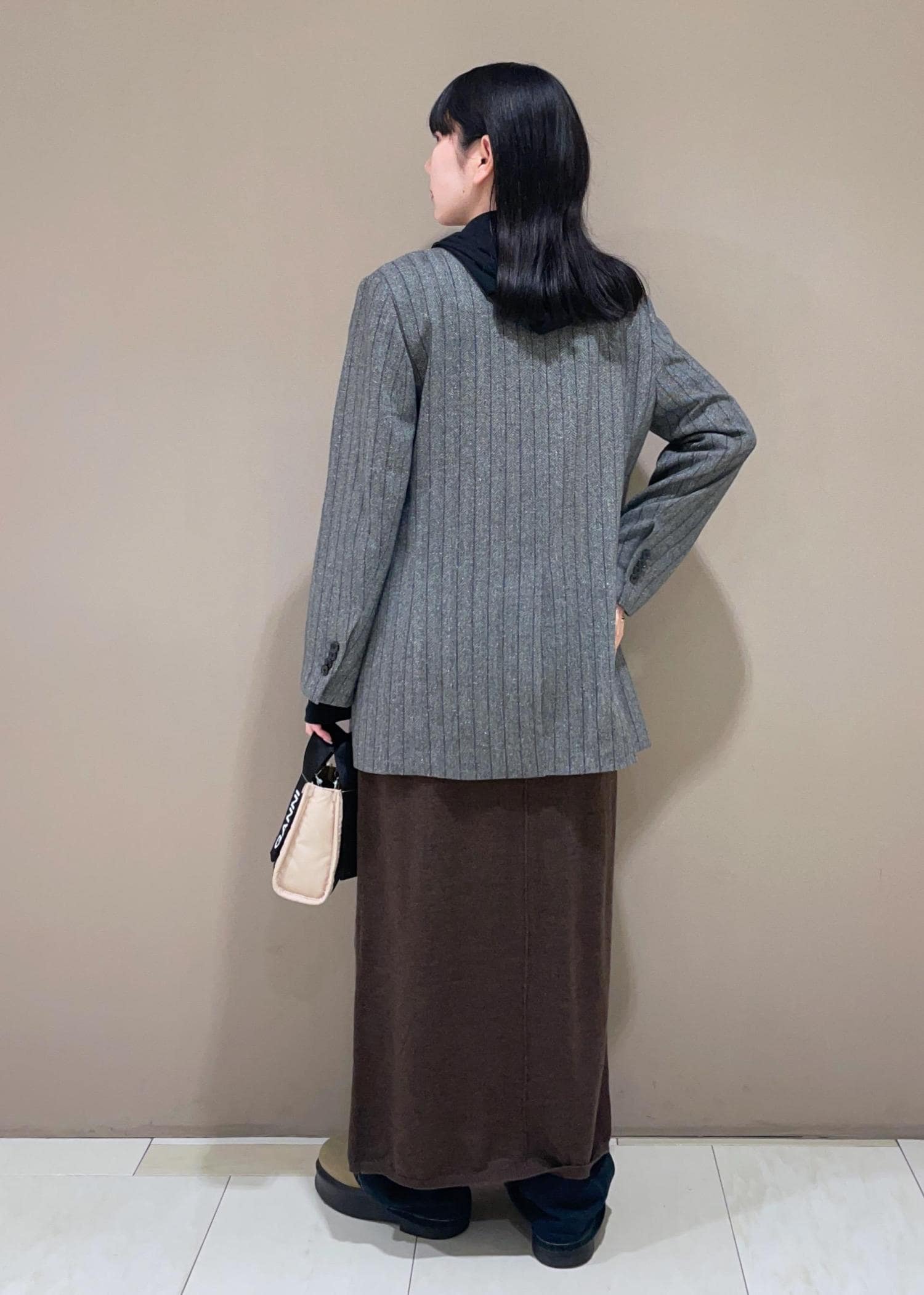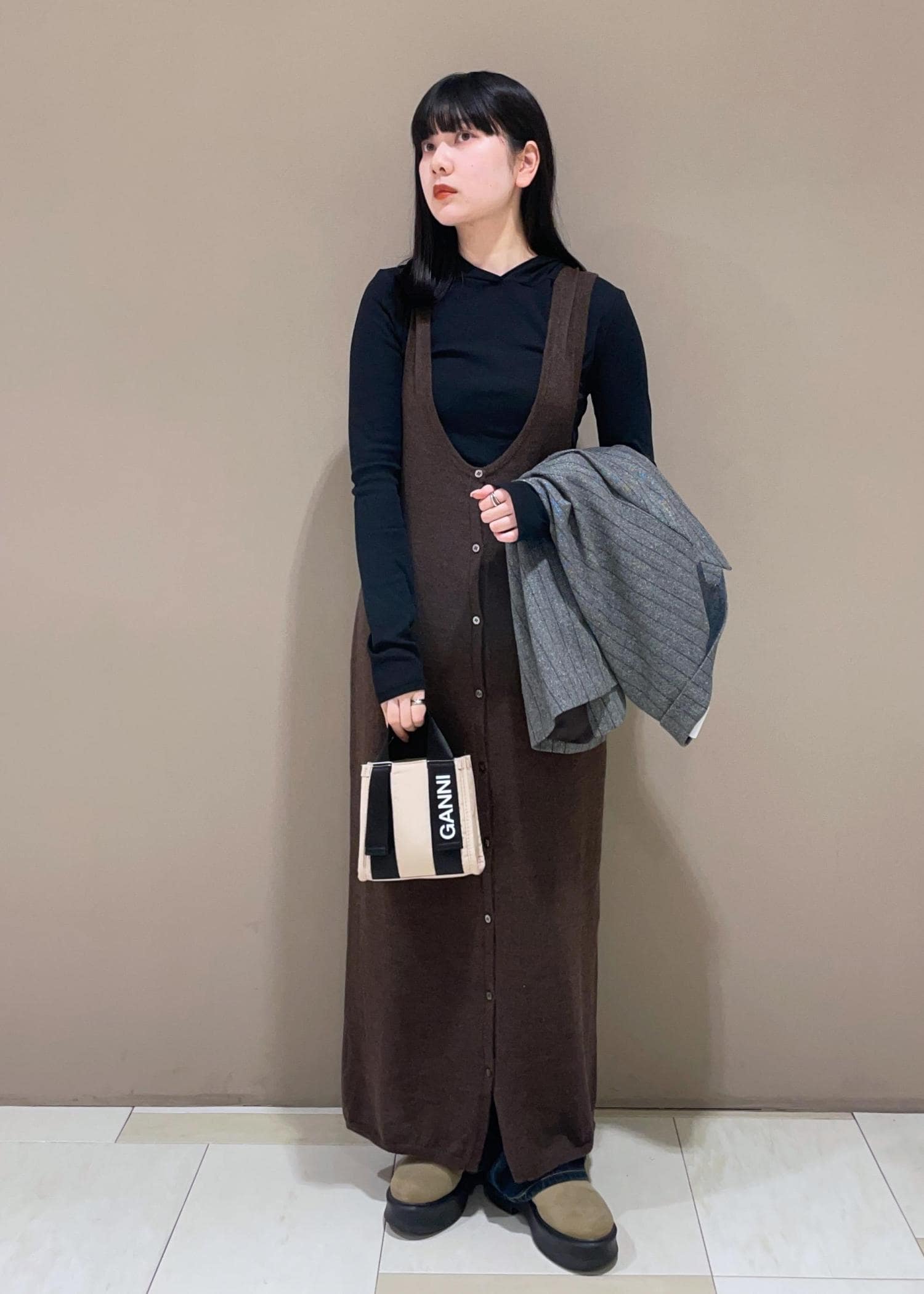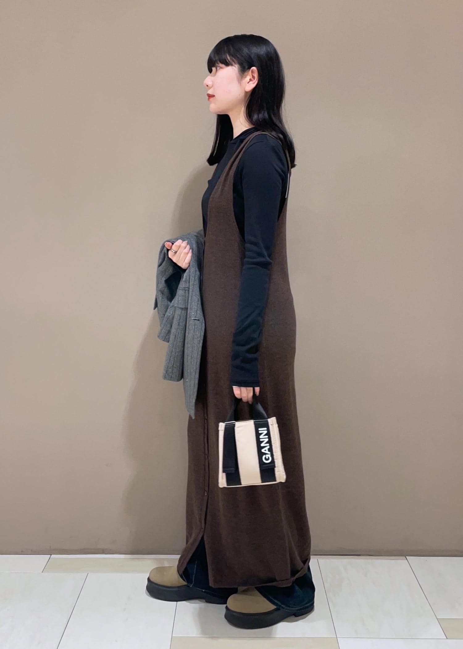 モヘアミックスUネックワンピースをデニムと合わせて着用いたしました!秋の定番ジャケット+デニムのスタイリング飽きますよね、、、ワンピを一枚レイヤードするだけで、一気にスタイリングが格上げします◎!