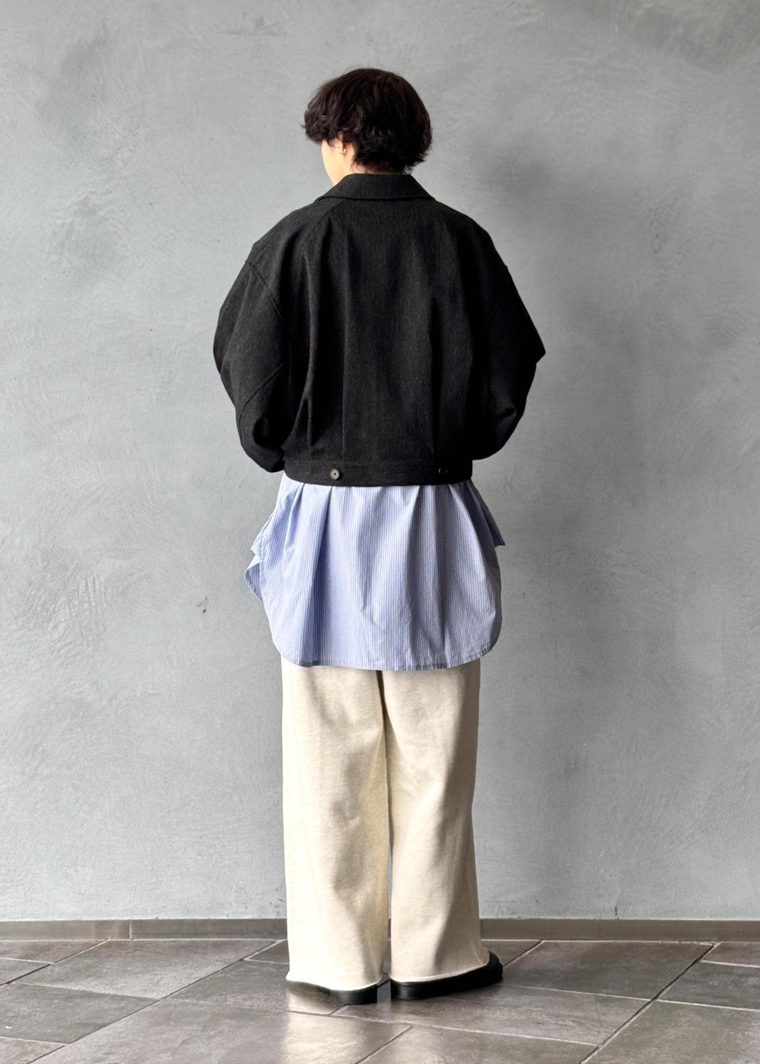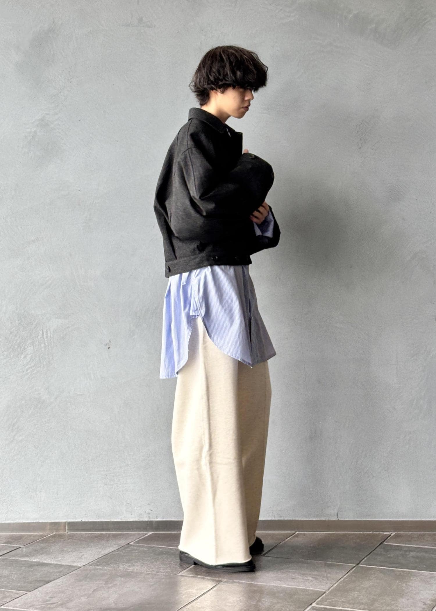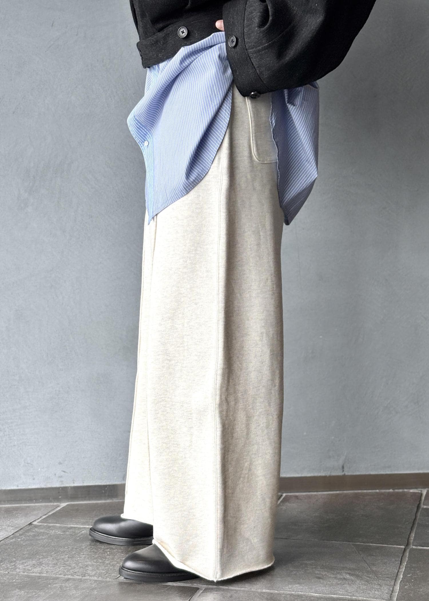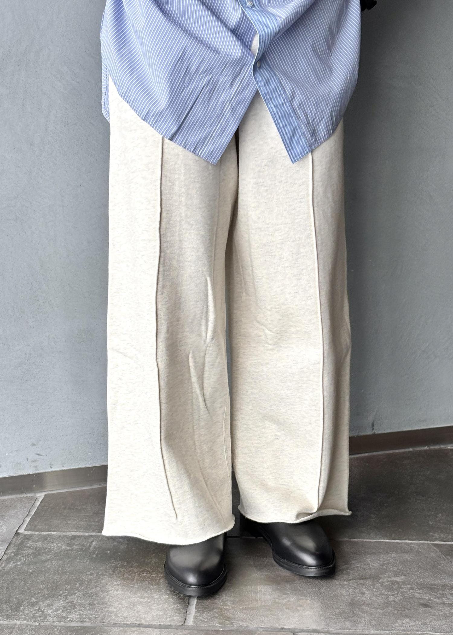 裾まで落ちる特徴的なワイドシルエットに品の良さを演出するセンタークリースのステッチが、スラックスを連想させるこだわりのポイントです。