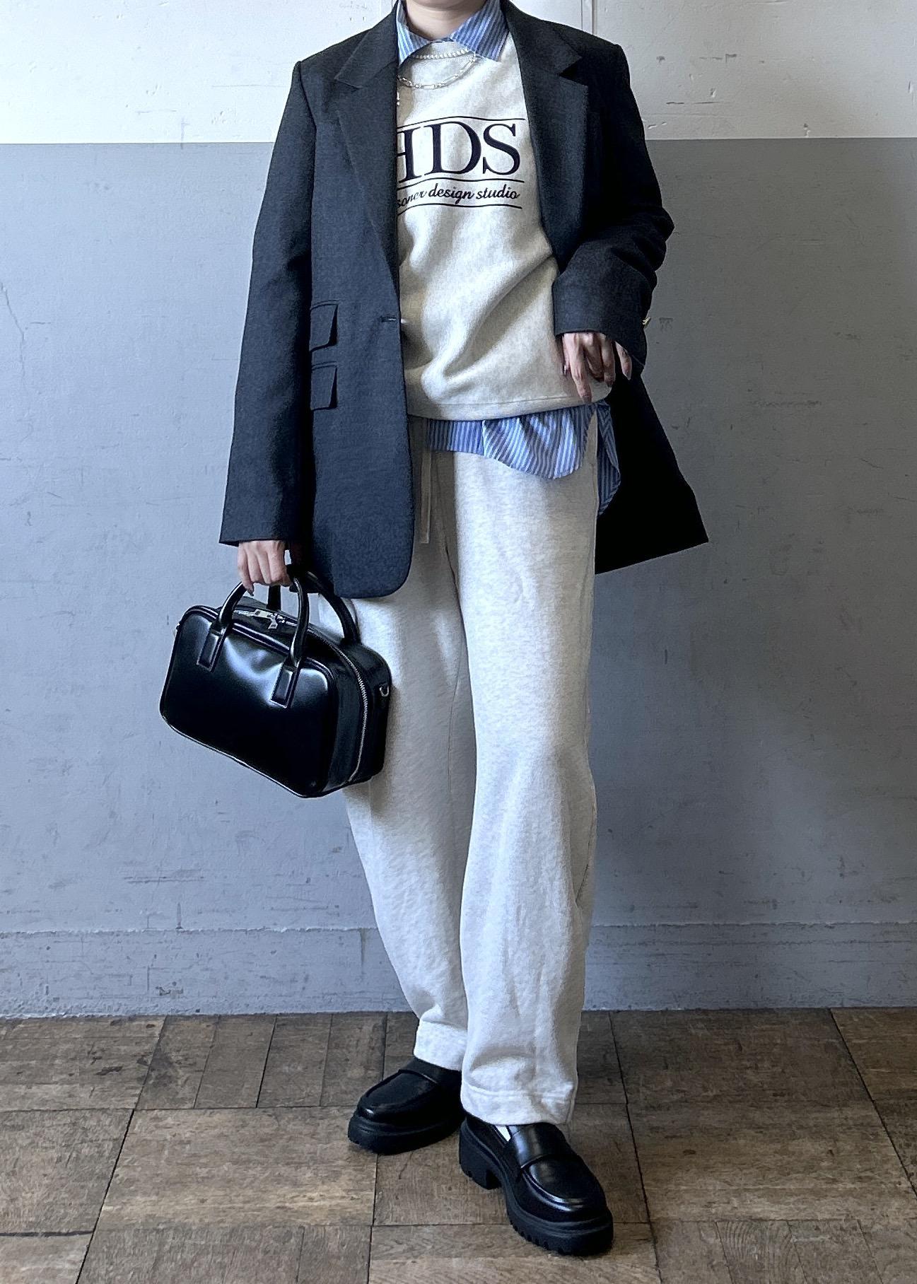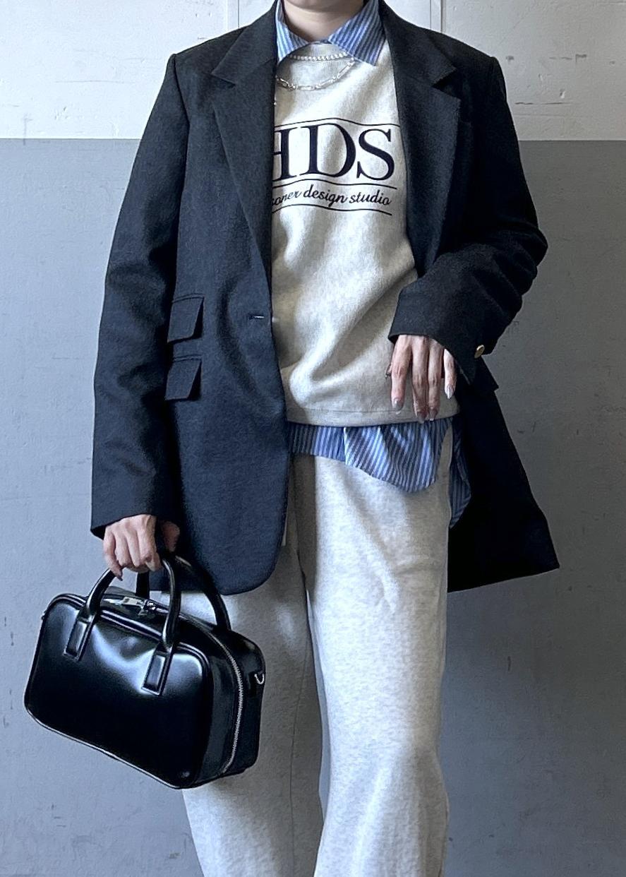 スウェットを上下着ていますが、シャツをレイヤード+ジャケットでラフ過ぎないきちんと感をプラスしています♡