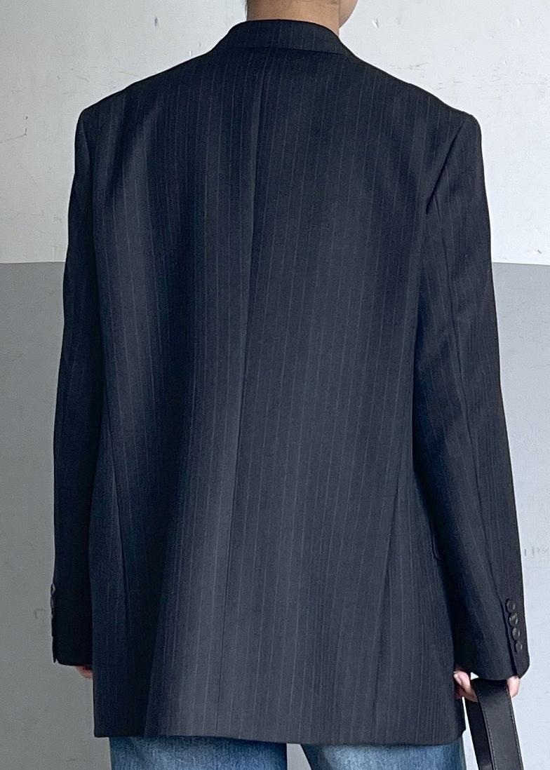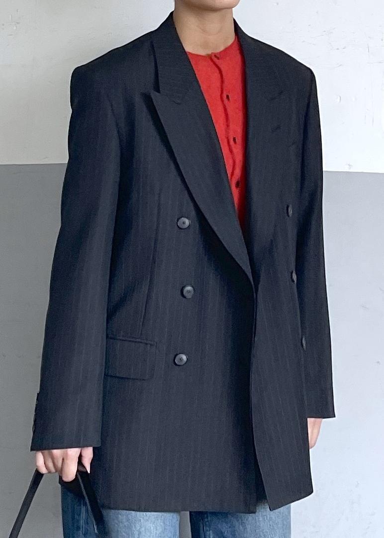 チャコールネイビーのストライプジャケットに、鮮やかな赤のカーディガンを差し色として合わせることで、シンプルながらも存在感のある印象に仕上げました。