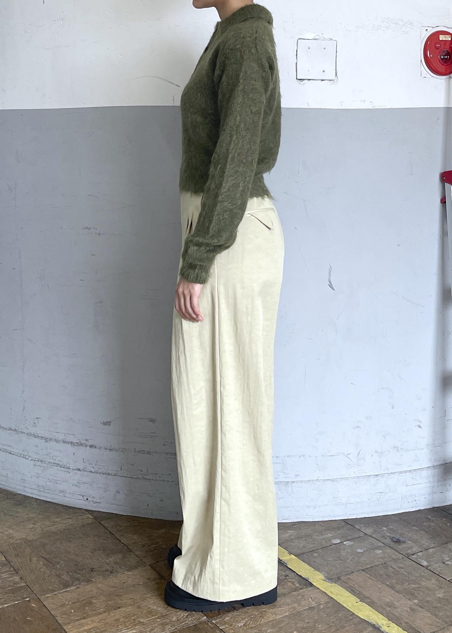 このコーディネートは今年のトレンドカラーであるオリーブ色のニットに、やわらかなトーンのワイドパンツを合わせた、シーズンムードたっぷりのコーディネートです。