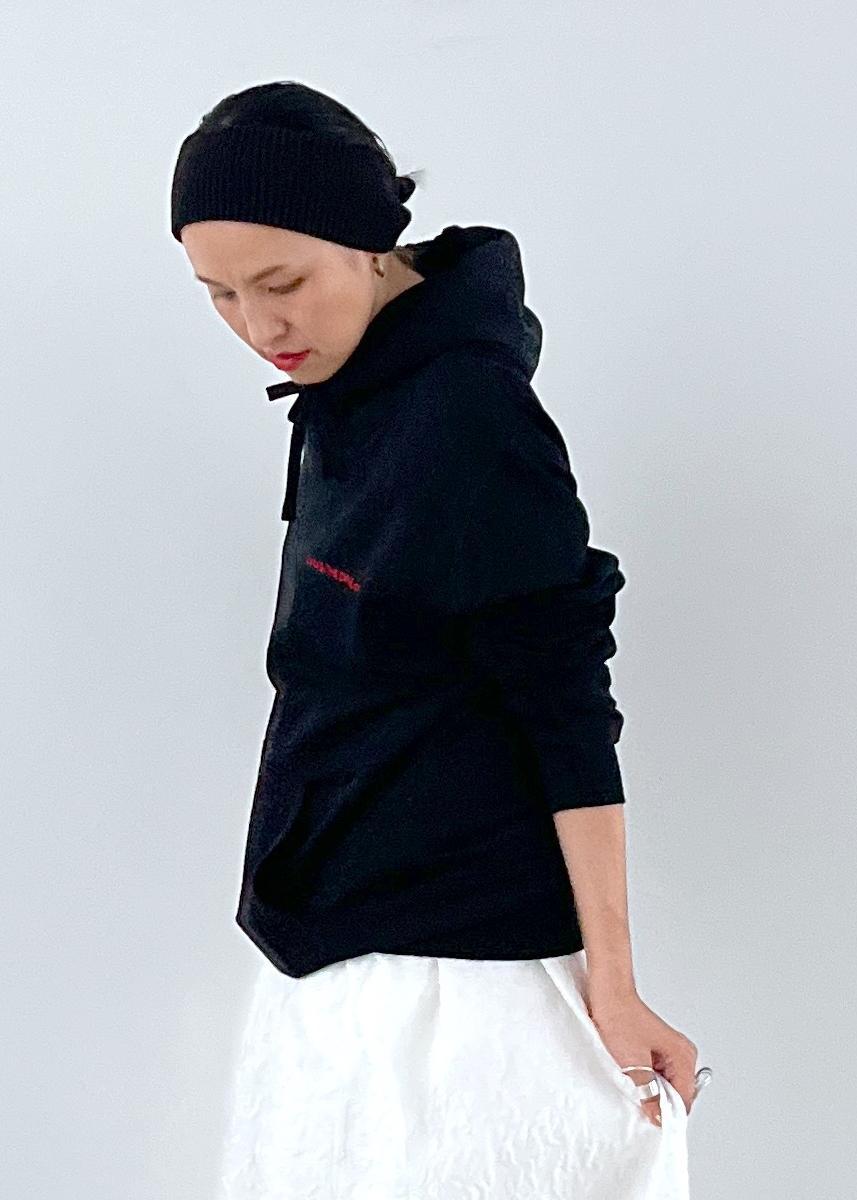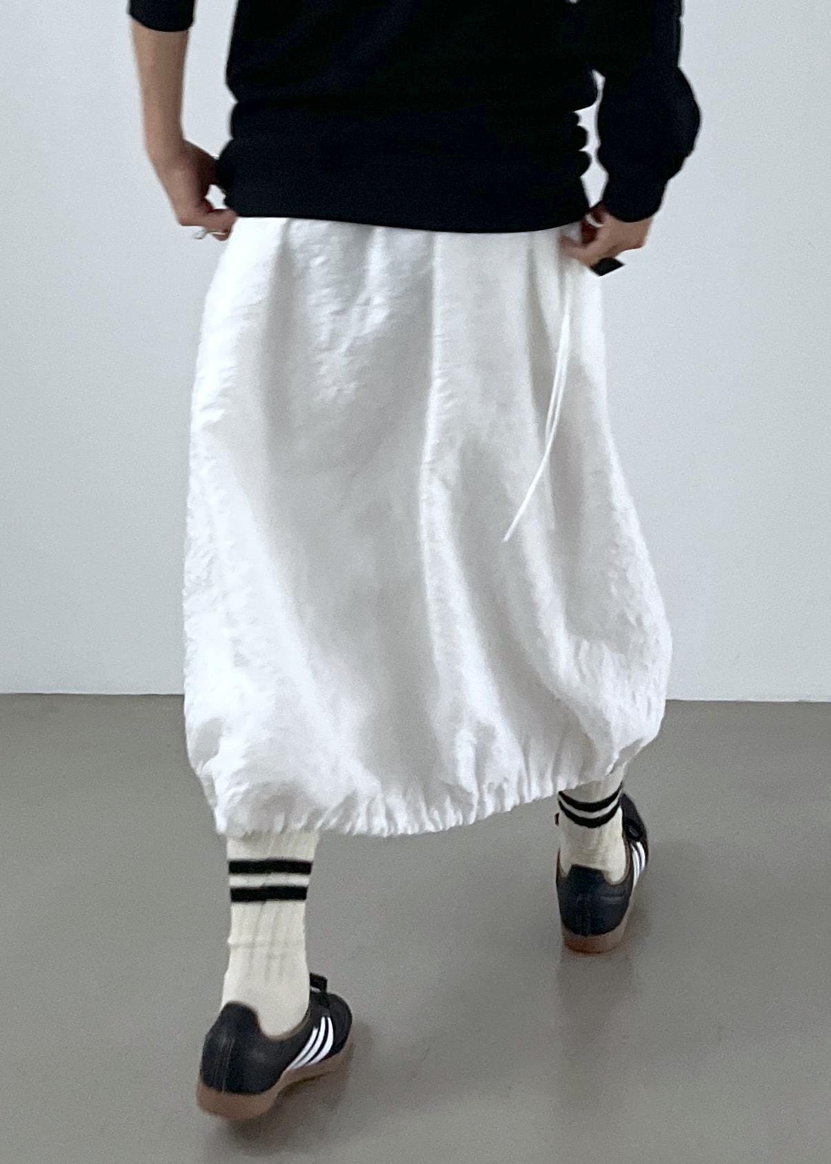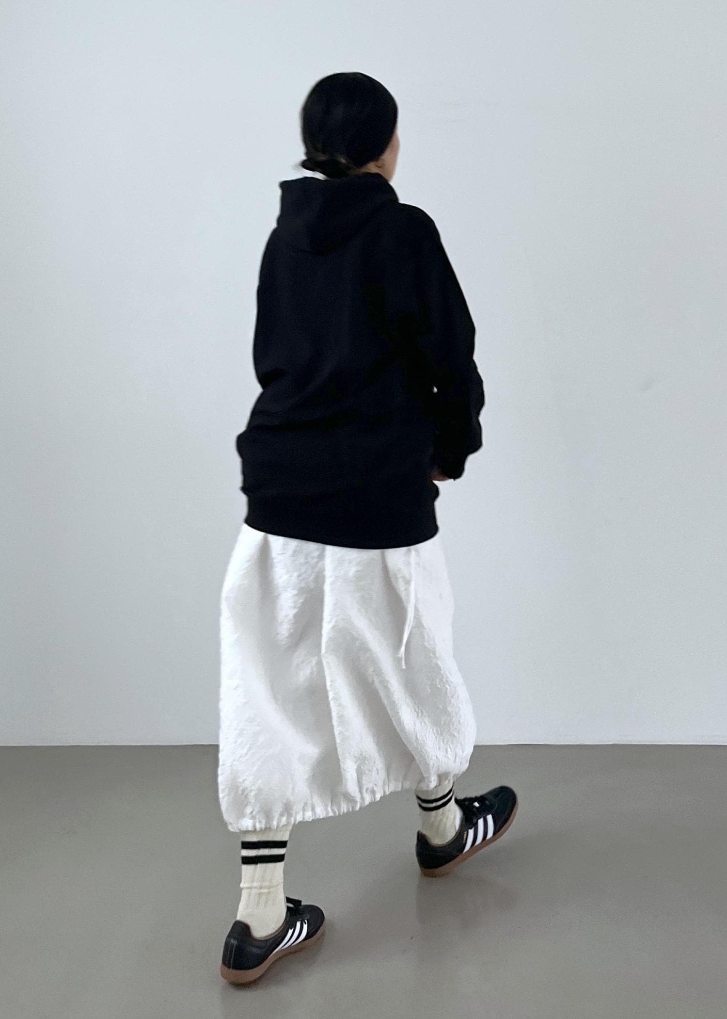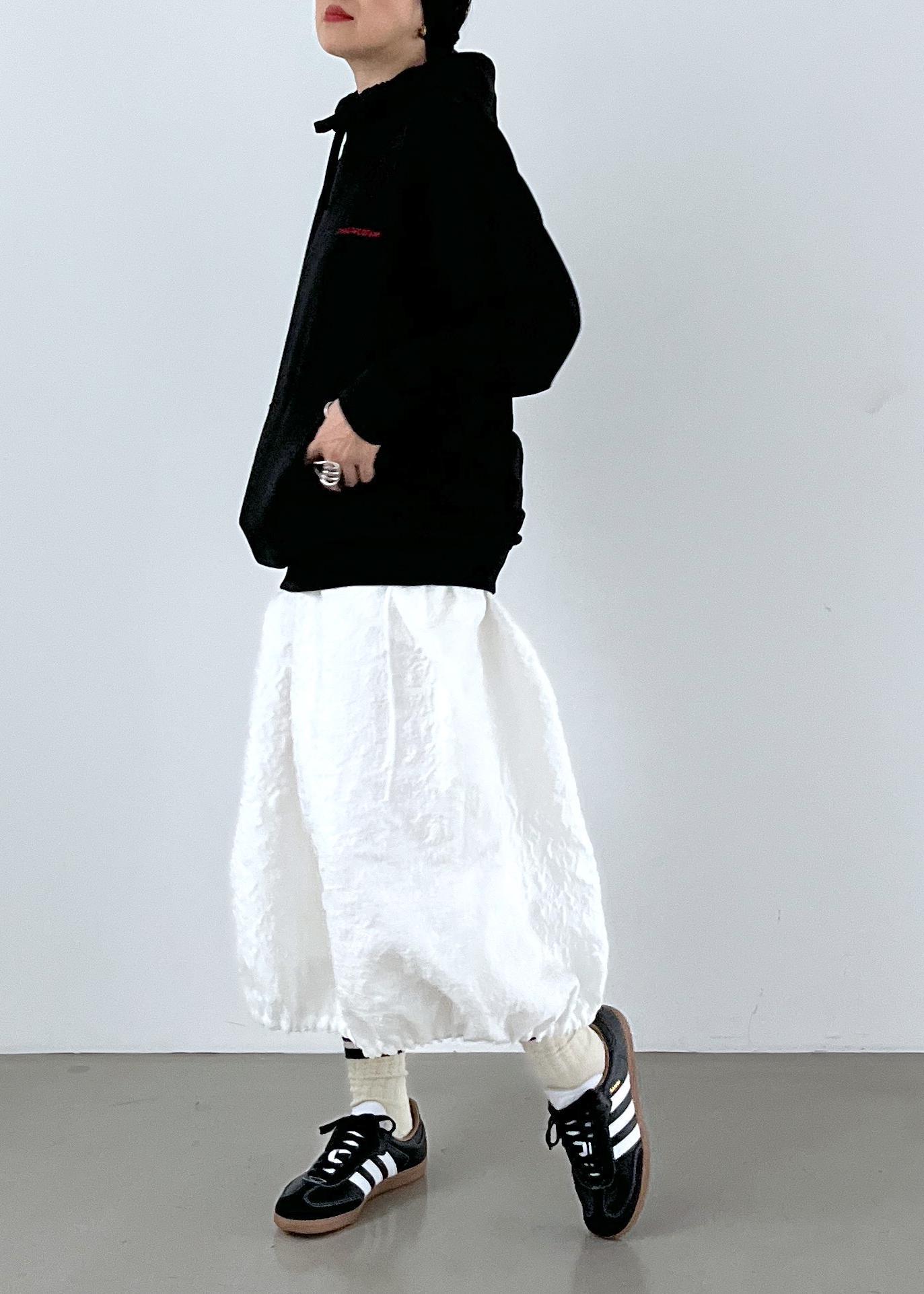 ふんわりと丸みのあるシルエットが女性らしさを引き立てつつ、ウエストや裾の絶妙なボリュームで動くたびに表情が変わります。カジュアルなパーカーと合わせても品よくまとまり、
