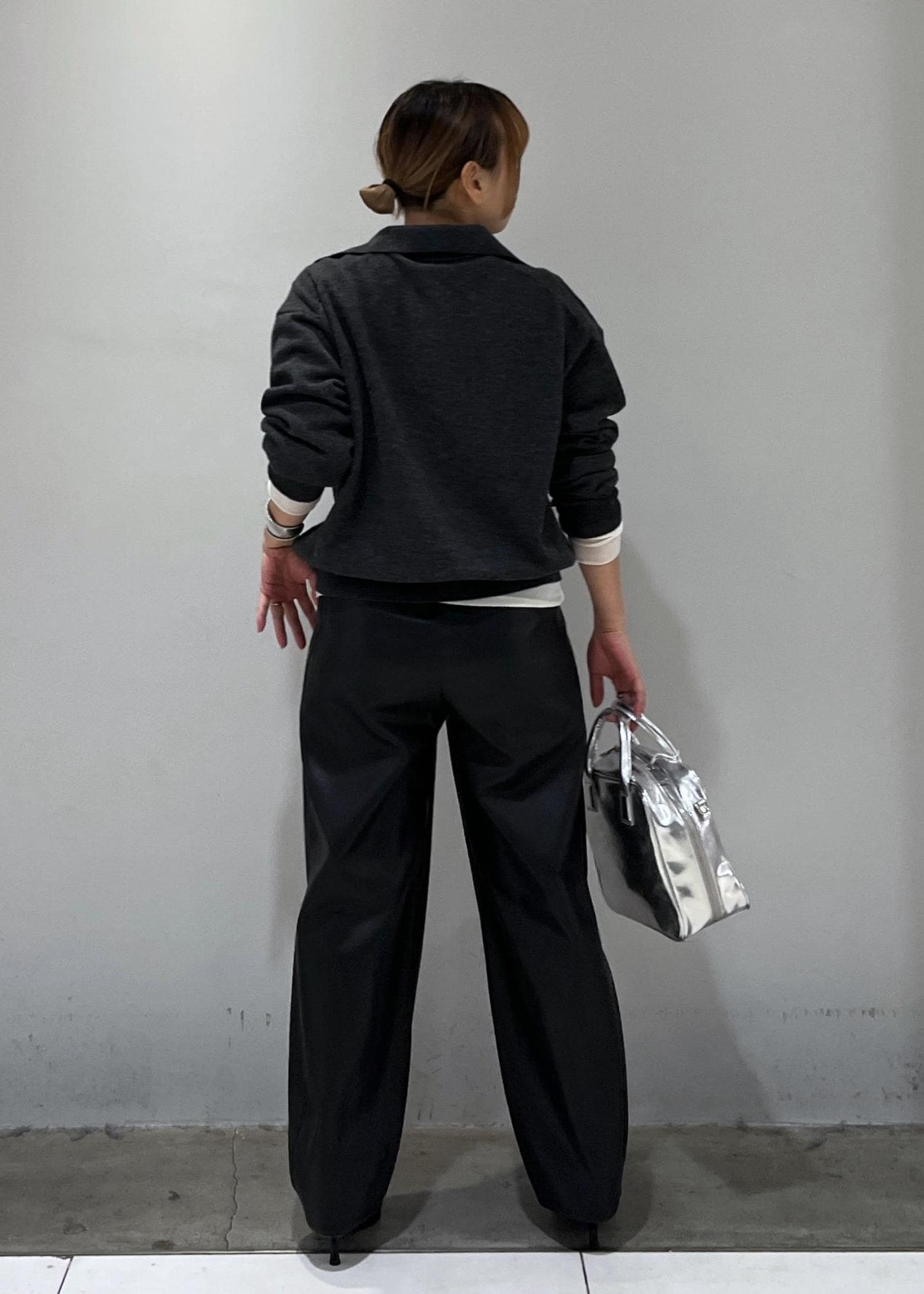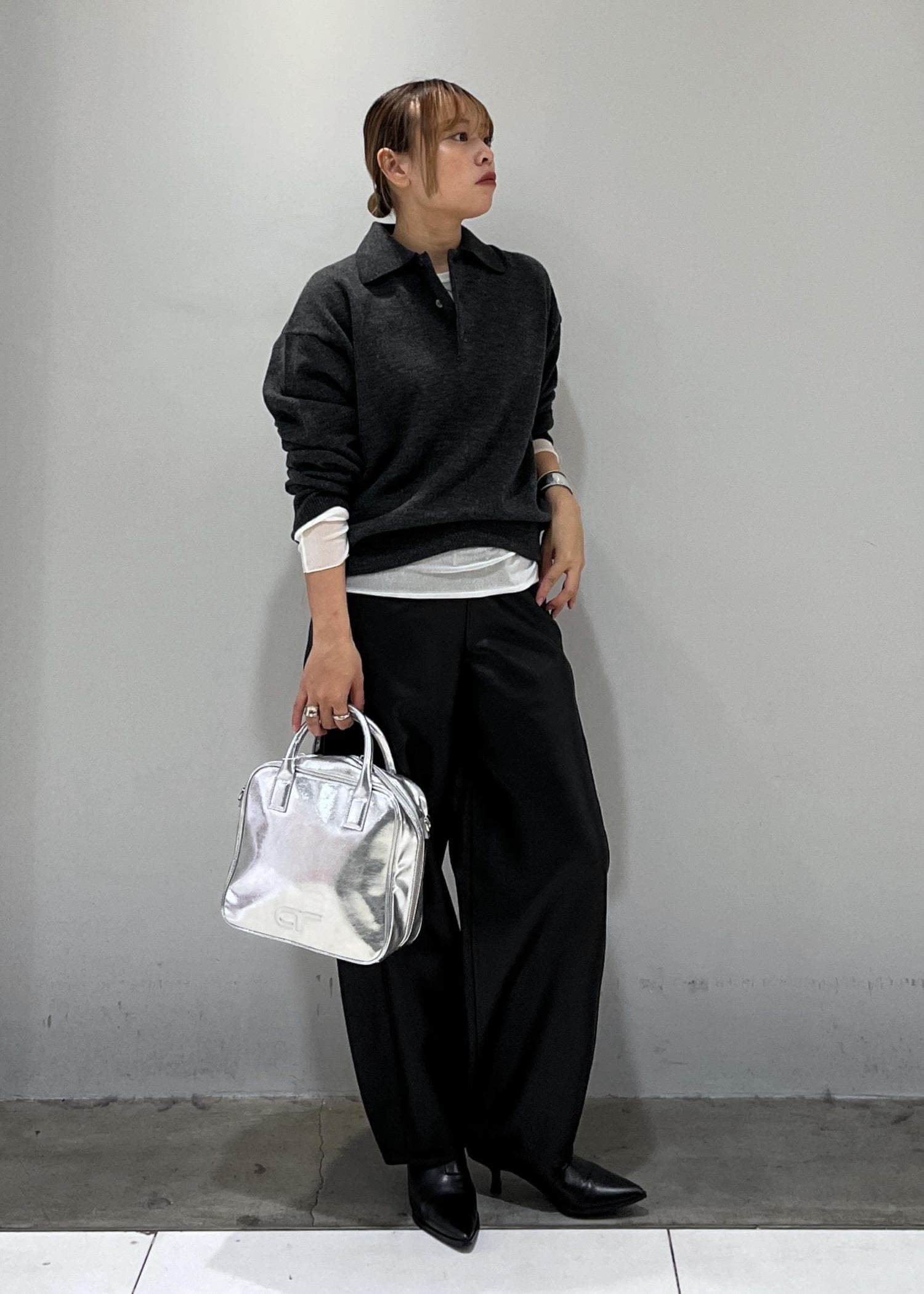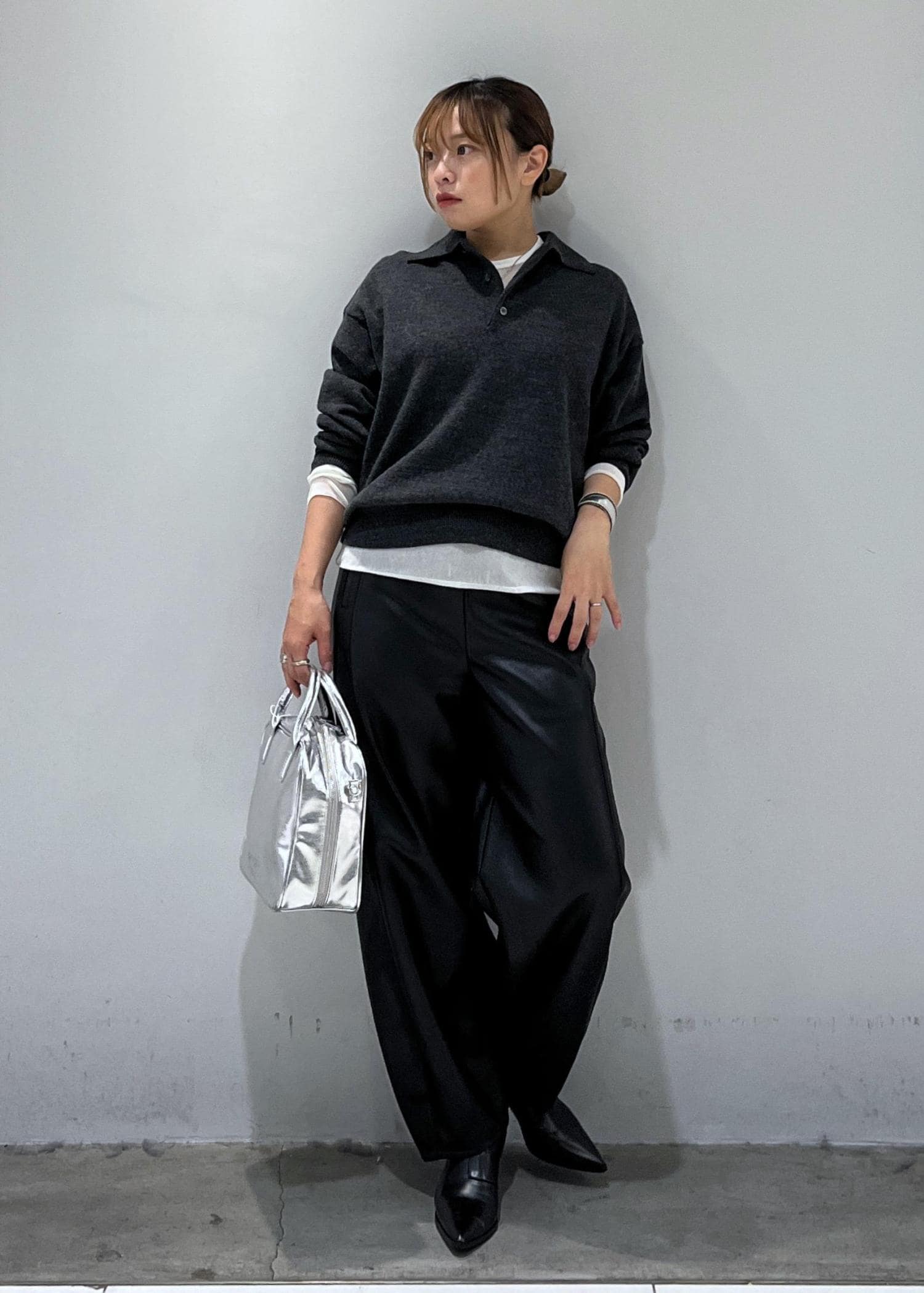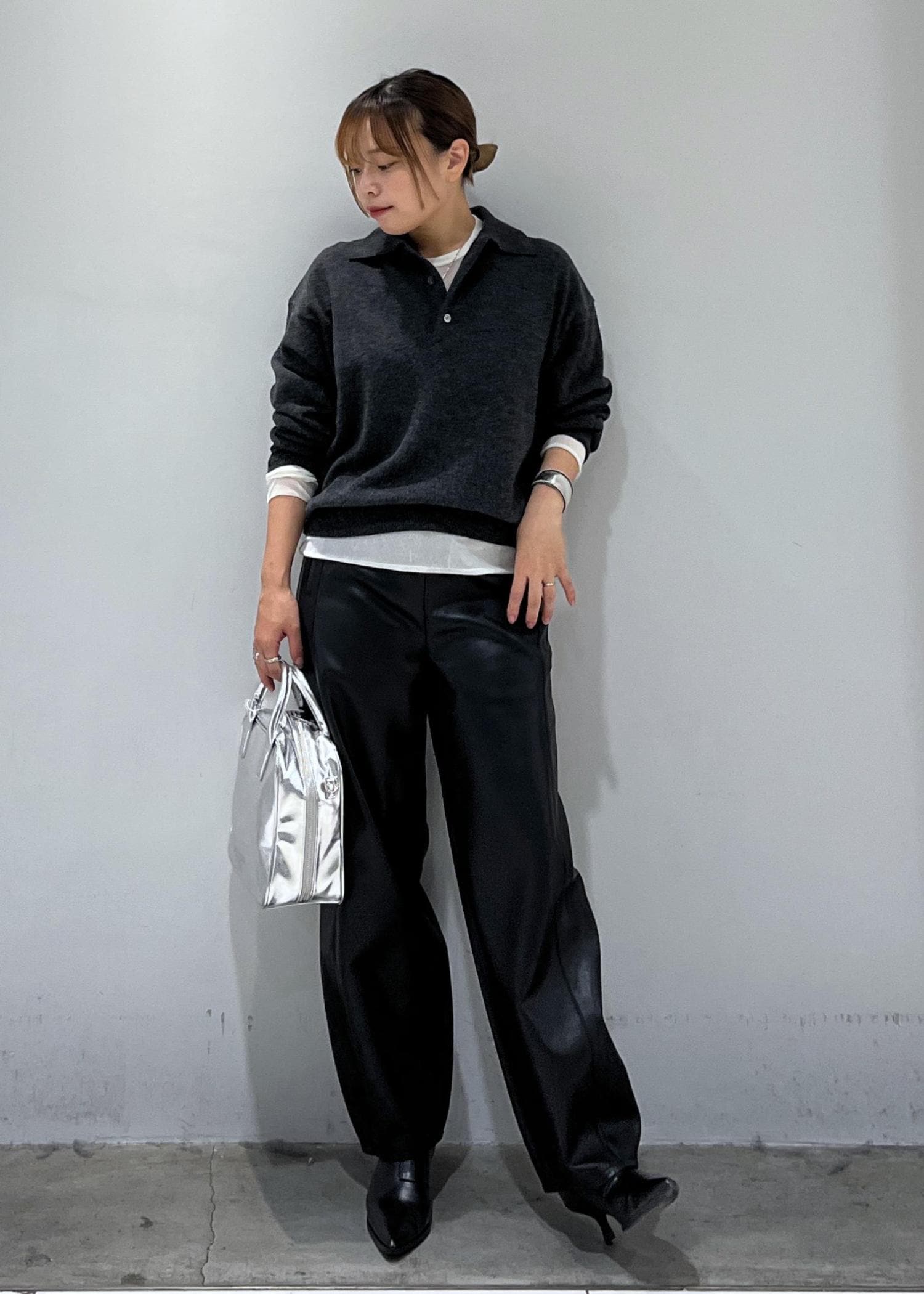 ポロニットとレザーパンツだけだとおじ感が強くなりすぎるので、シアートップスを挟んで女性らしさをプラスしました♩