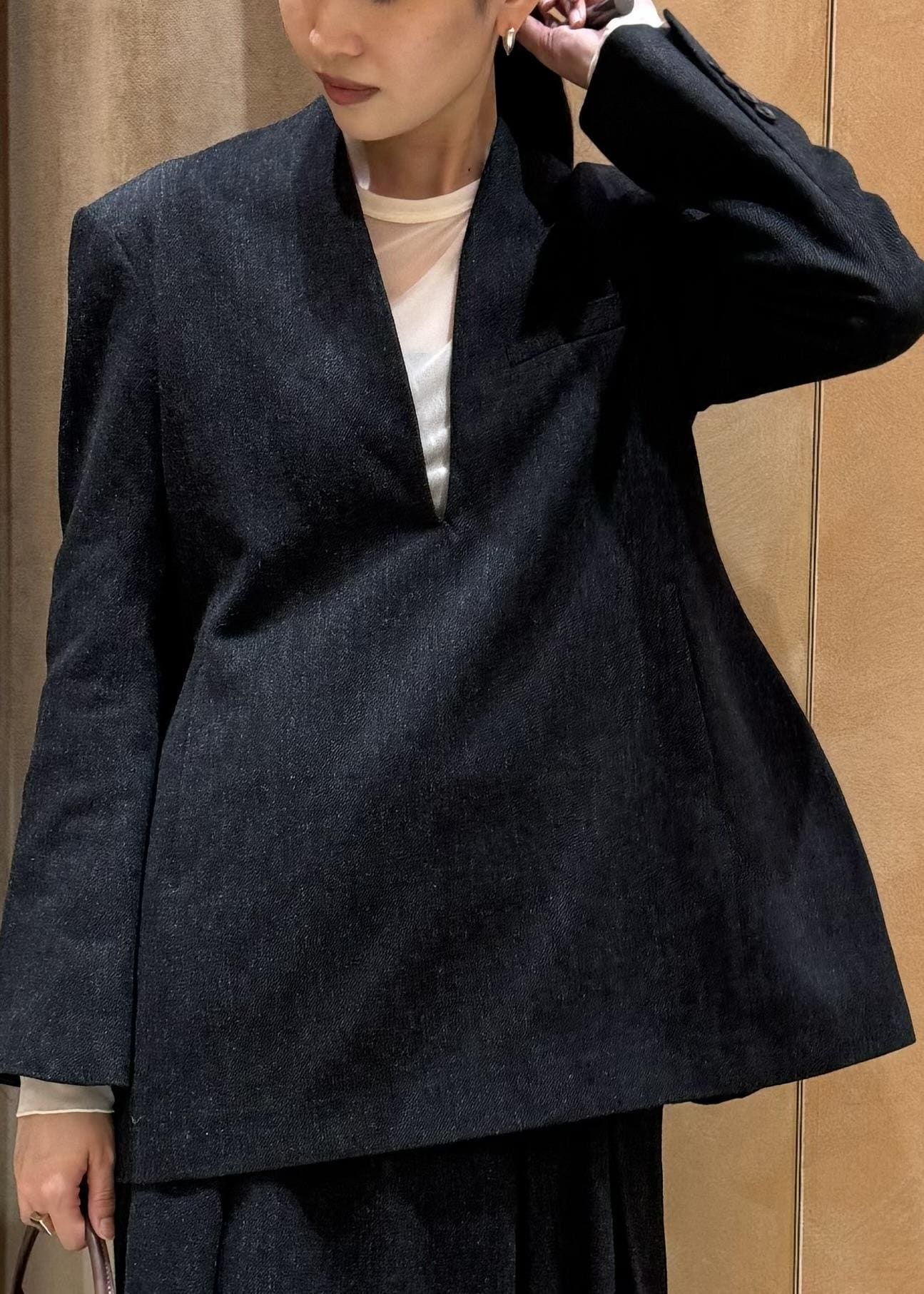 シンプルな中にも、分量感やストンとしたシルエットの実現にこだわった1着です。
