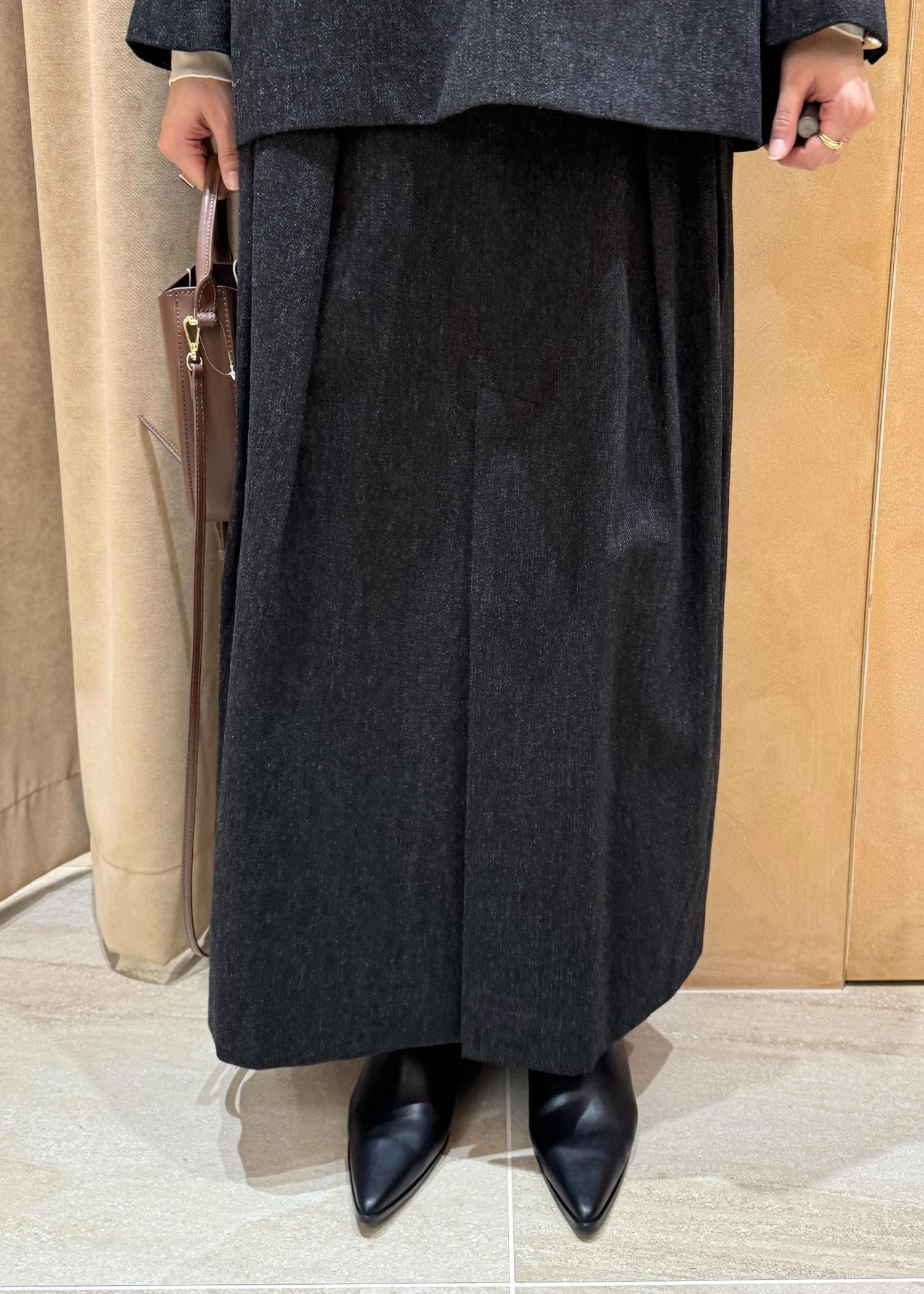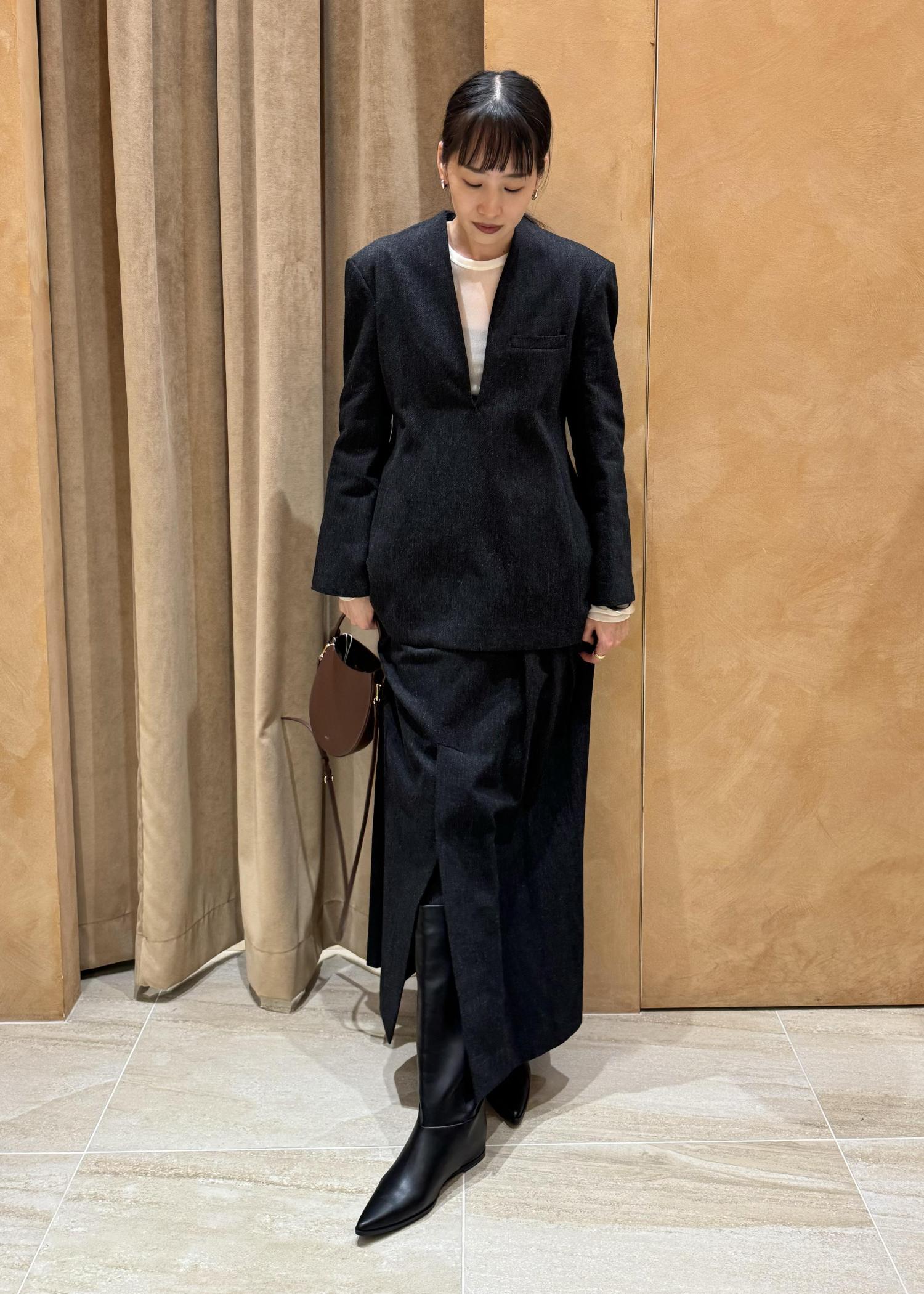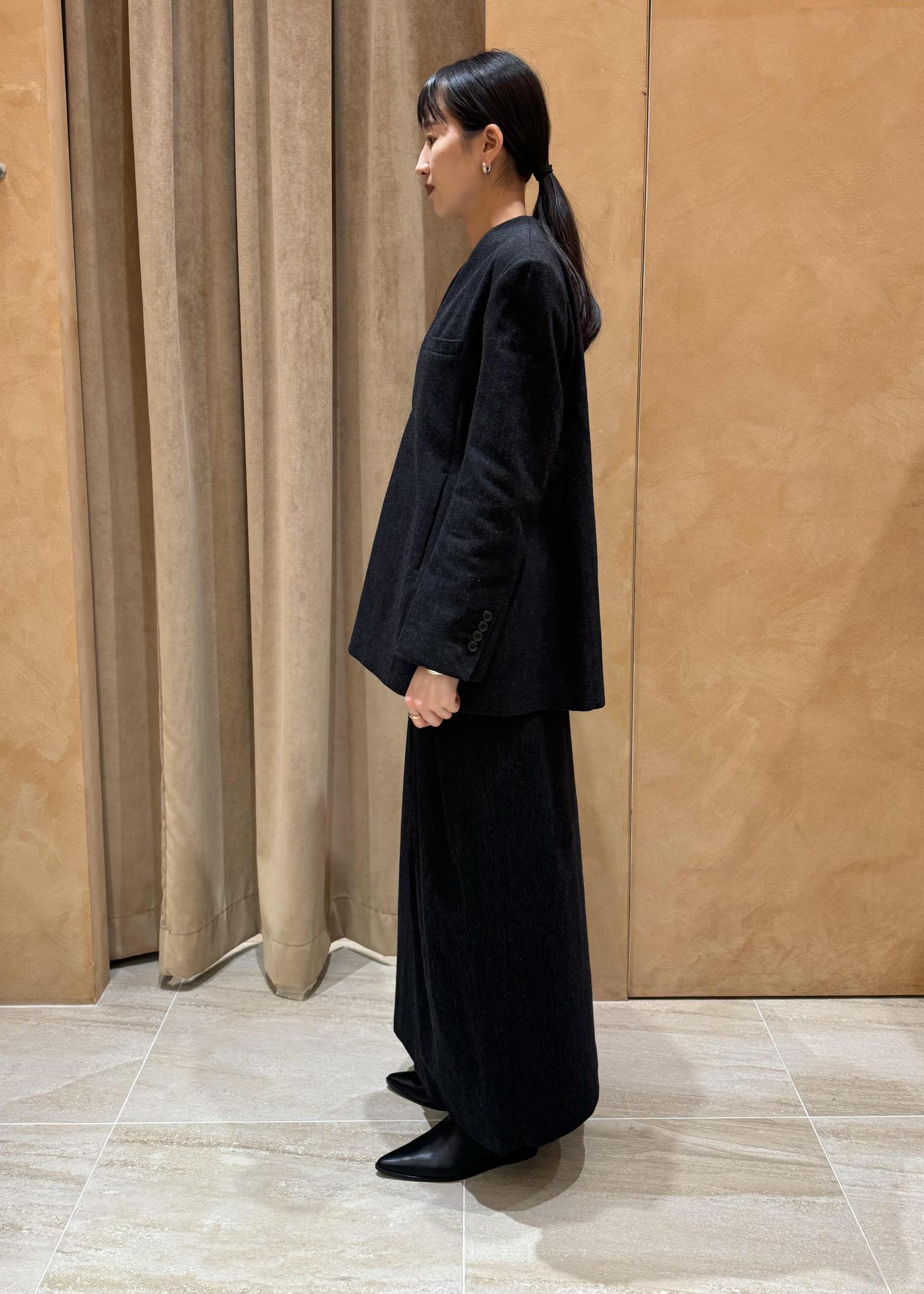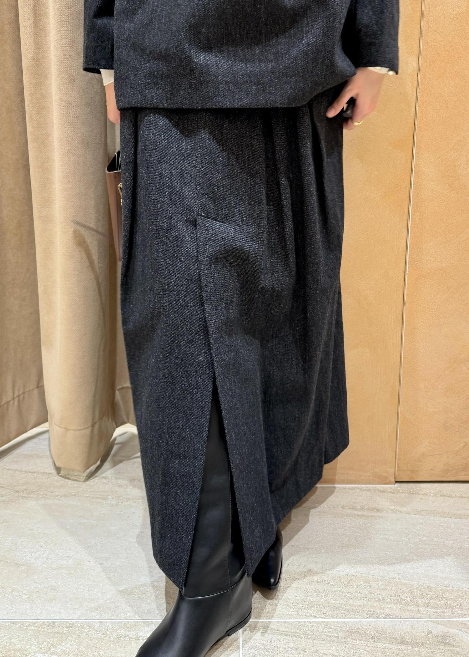 EMOELLE【EMOELLE】ウールコットン2タックスカートチャコール / 38¥29,700レビュー38サイズの着用で、ウエストはジャストでした。丈は足首がしっかり隠れる長さですが、前の開きが深めなので足捌きよく履けます。