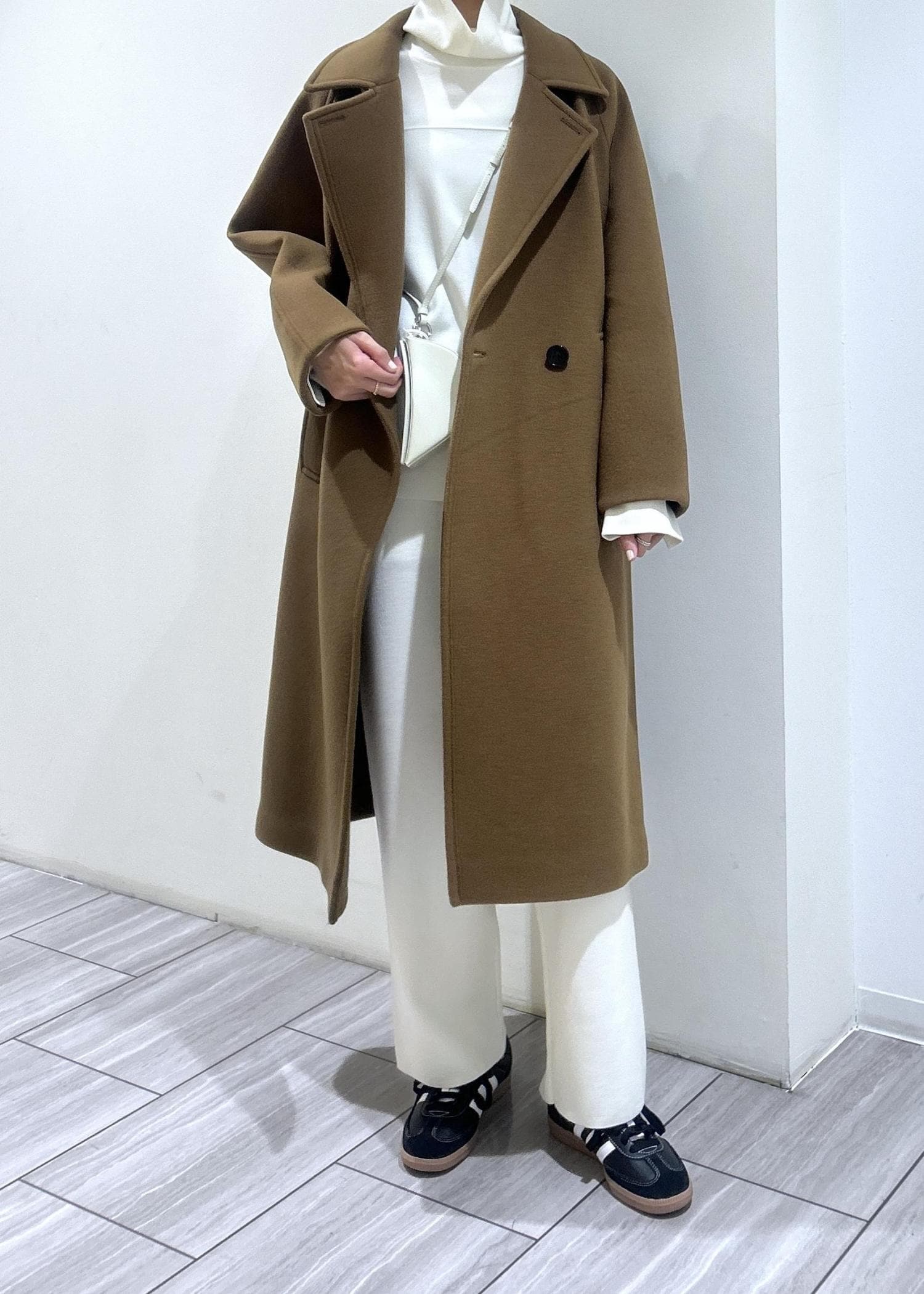 きれいめなニットセットアップに、ロングコートをさらっと羽織って足元は別注のSAMBAでカジュアルに◎