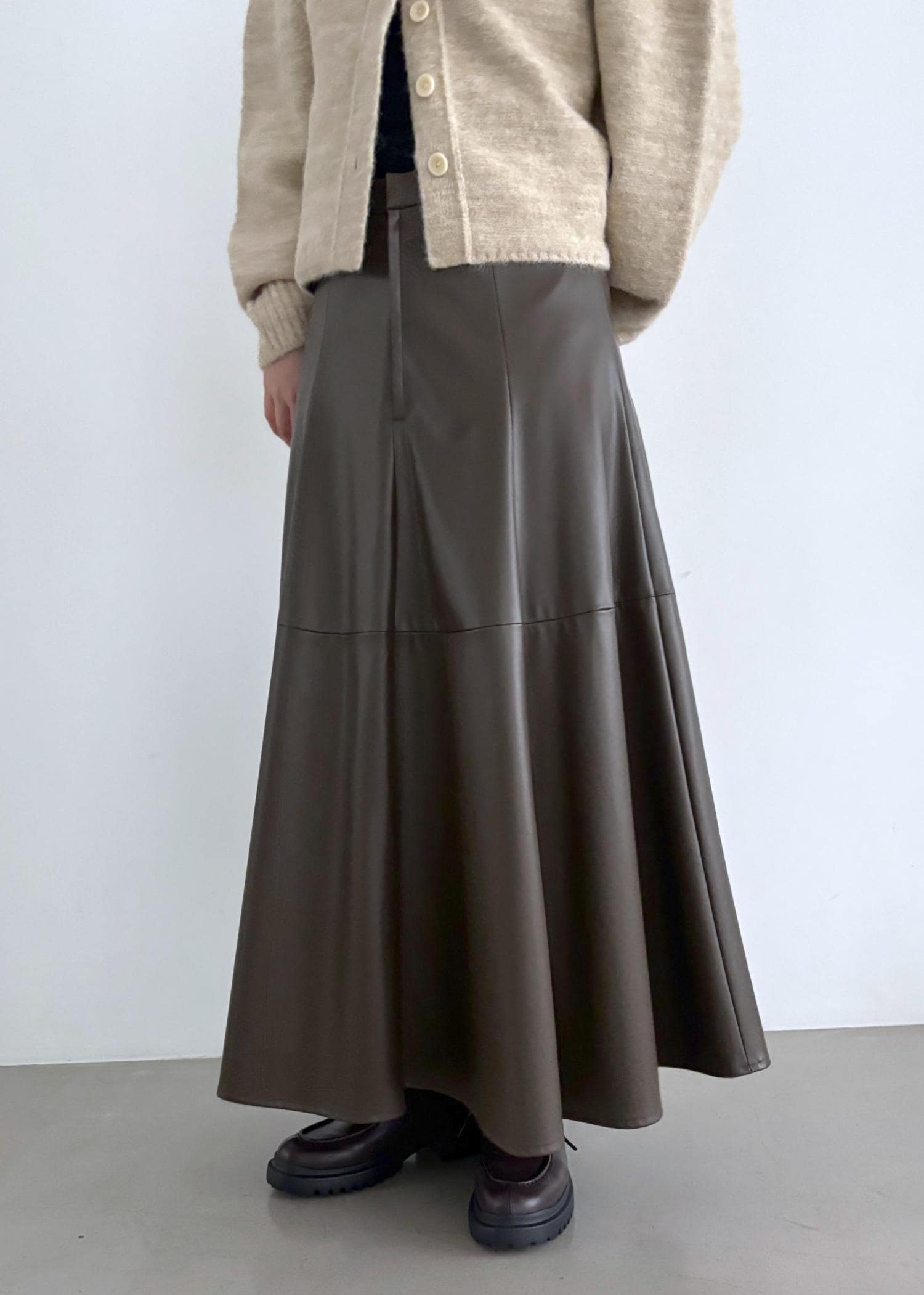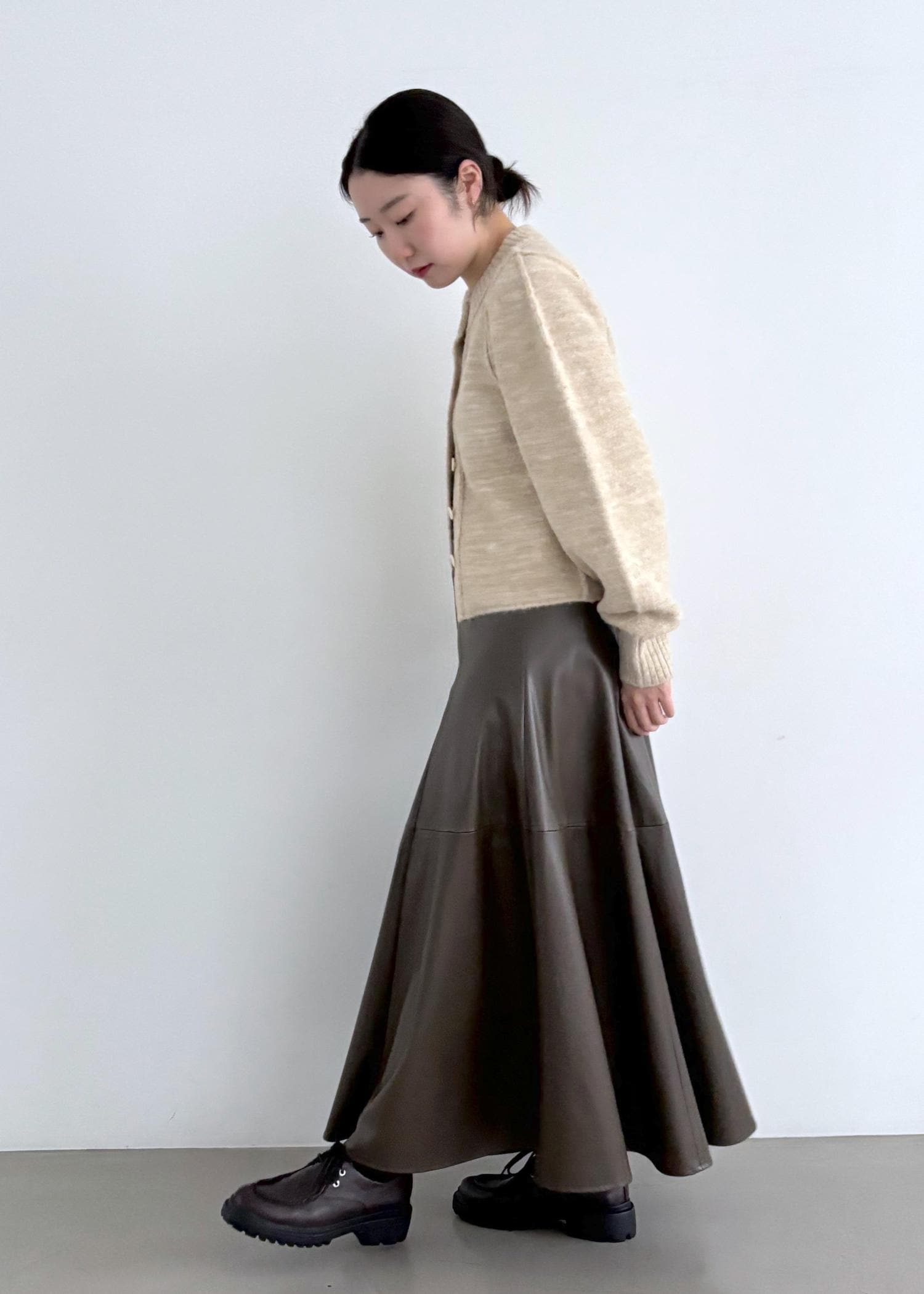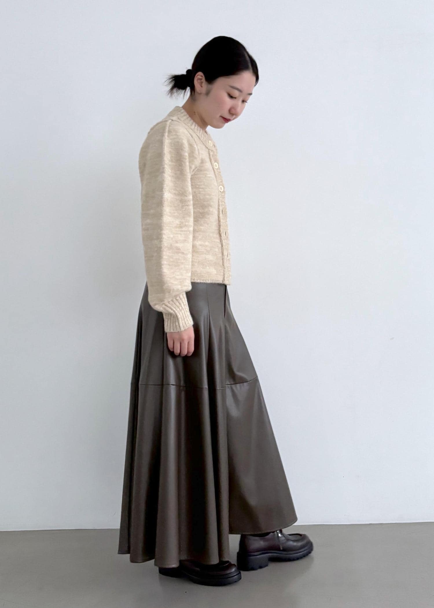 形はAラインでフェミニンだけど、レザー調で甘すぎないのがよい。 -