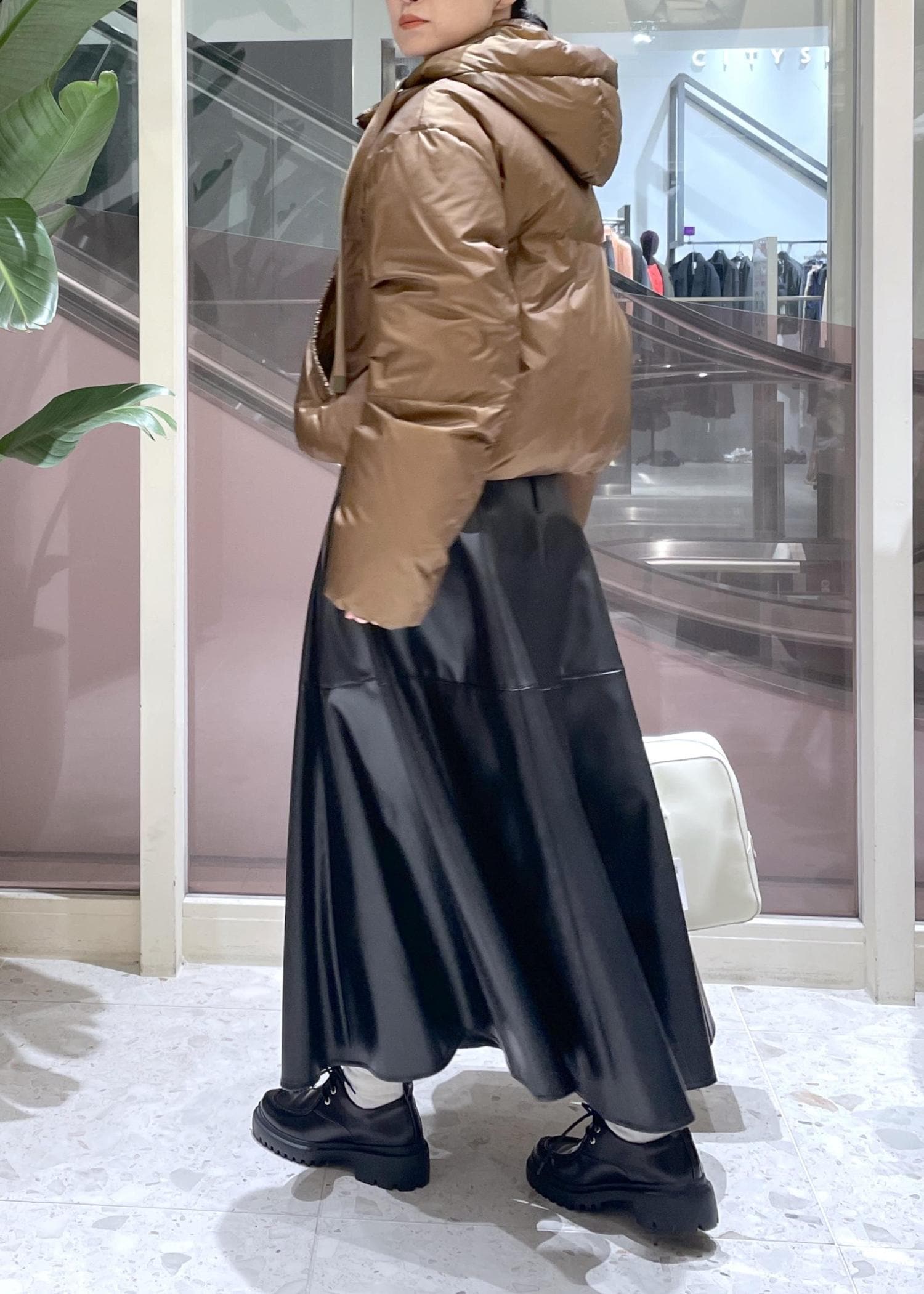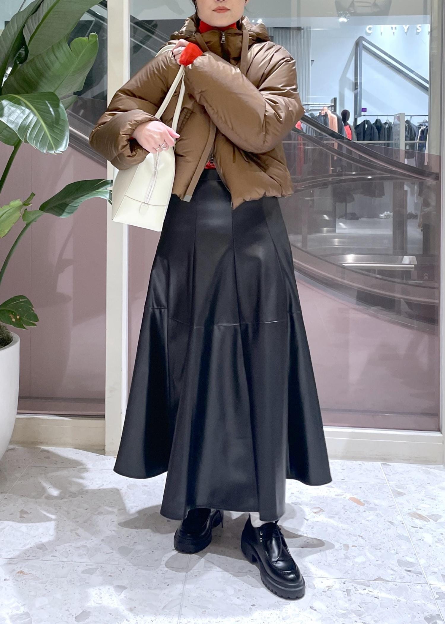 裾にかけてのフレアなシルエットがとても綺麗で女性的ですが、レザーの質感がモードな雰囲気なので、甘くなりすぎません。
