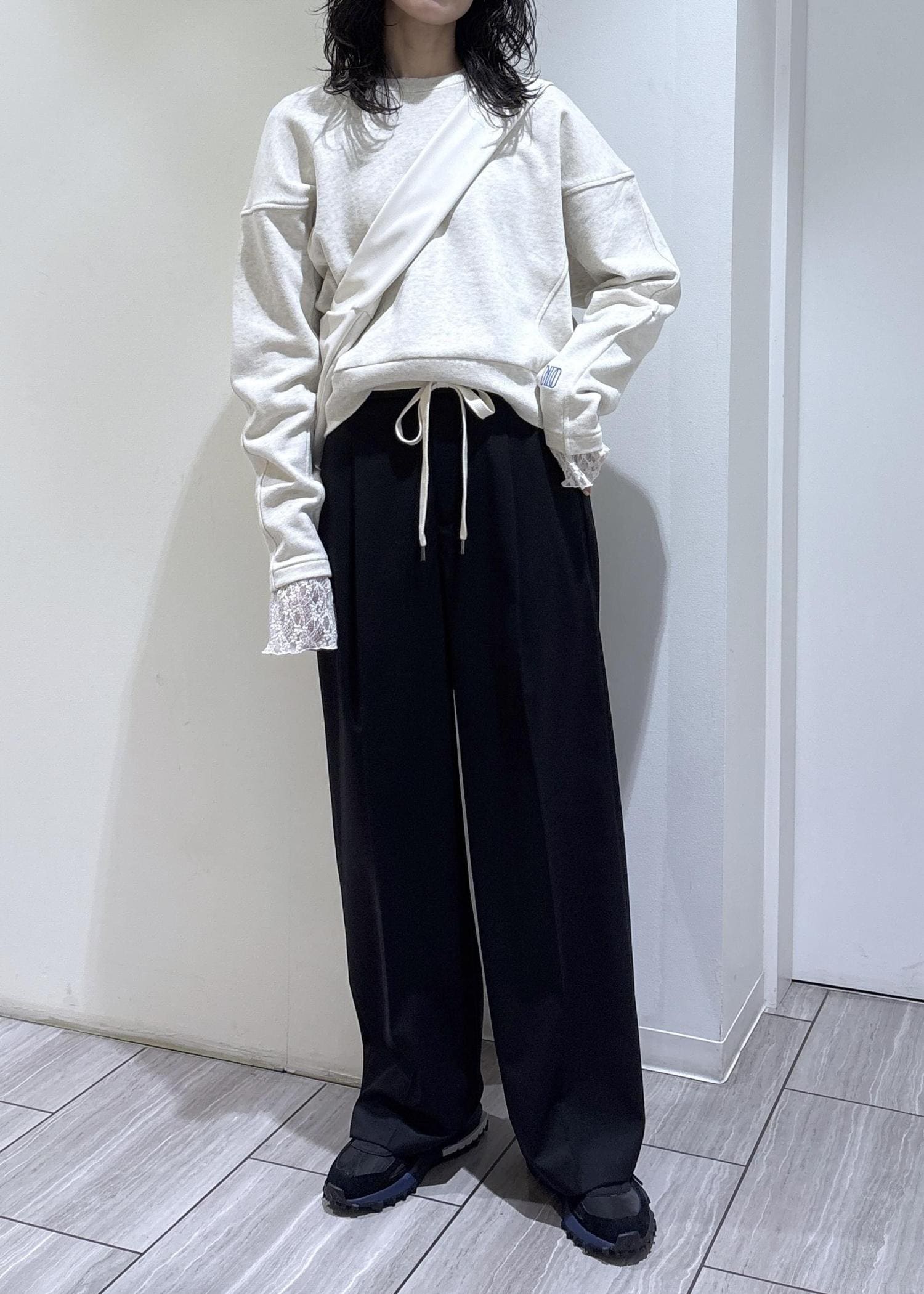 今年らしいレースジレをポイントにゆるめのパンツと合わせてみました。