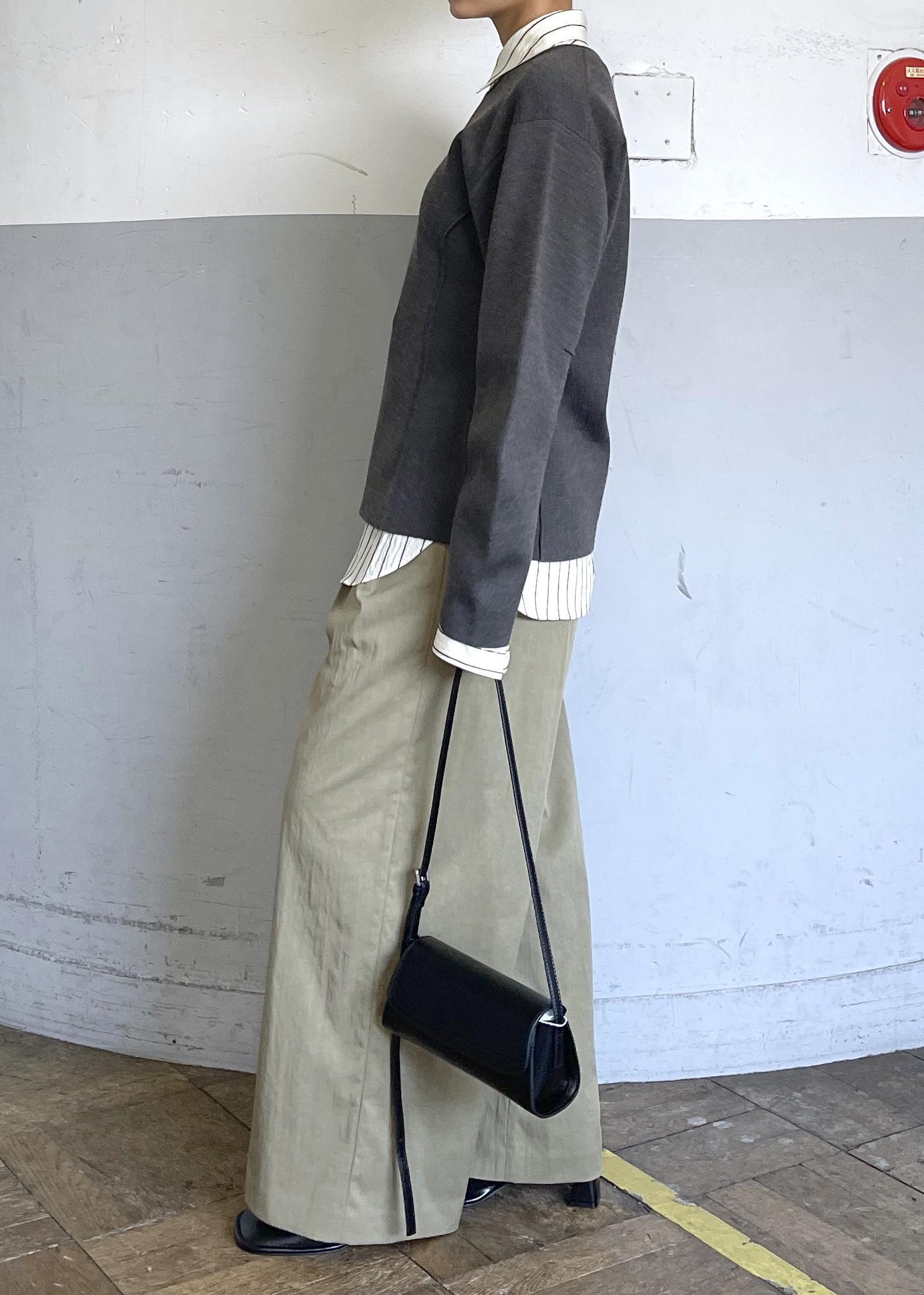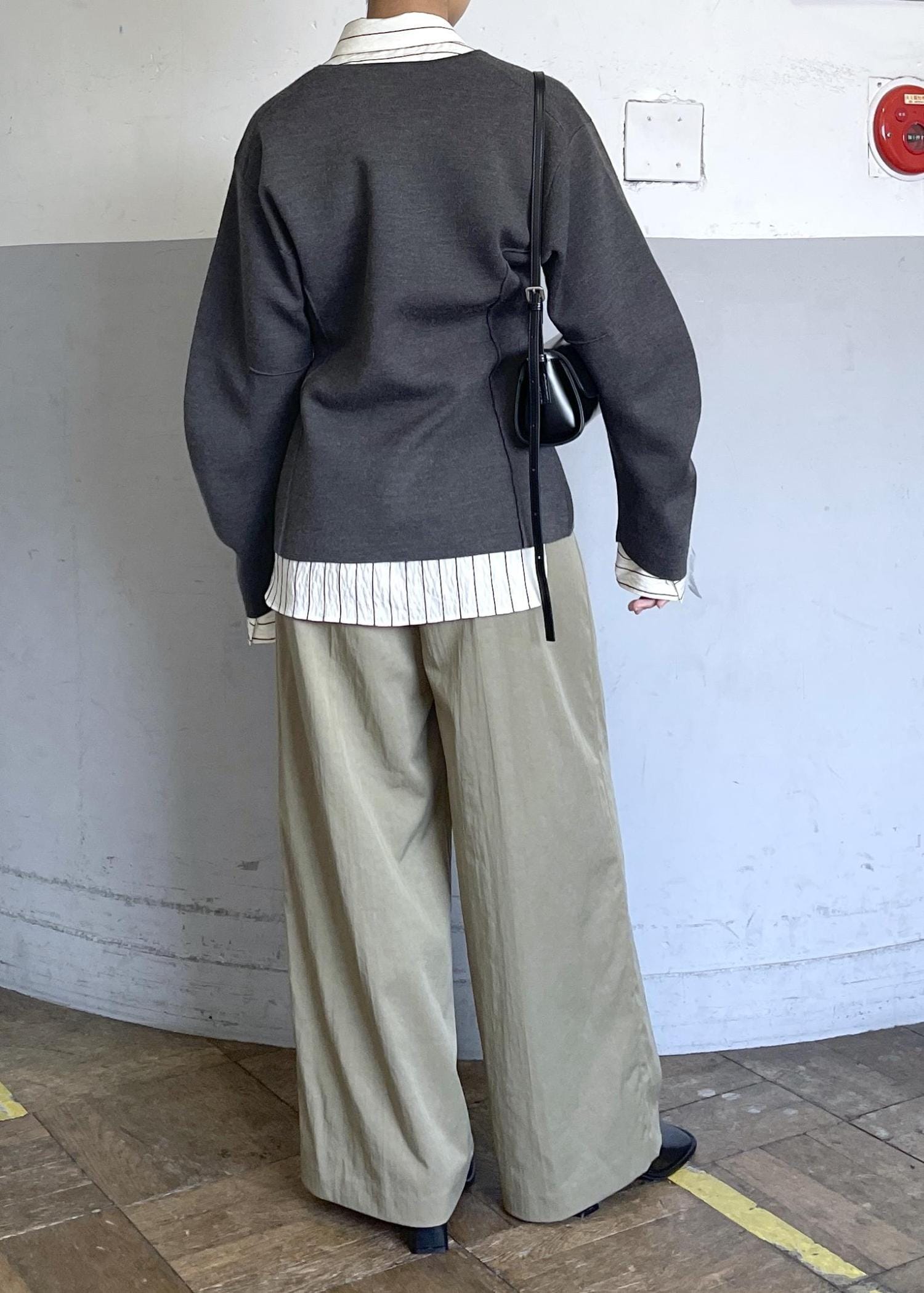 ゆったりとしたシルエットのパンツを合わせることで、リラックスした雰囲気の中にも上品さが感じられるスタイルになっていると思います。