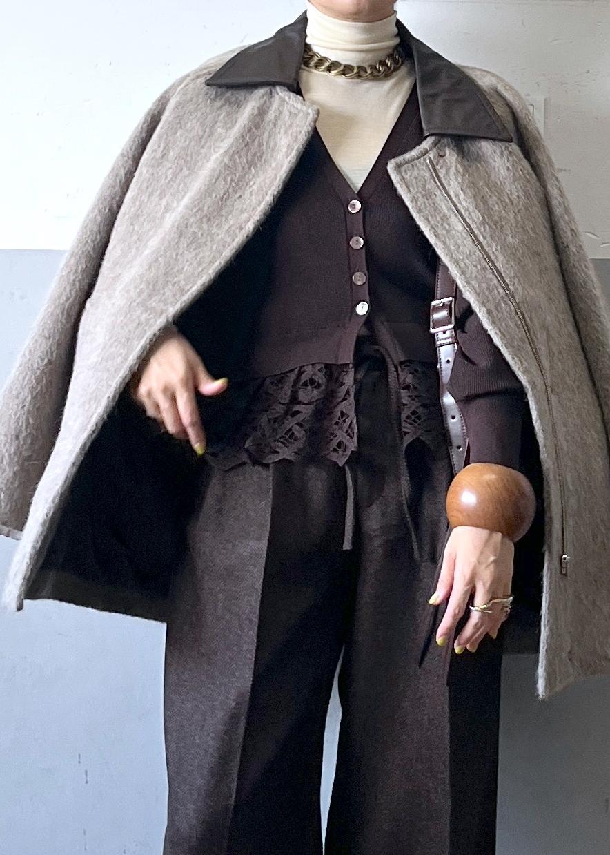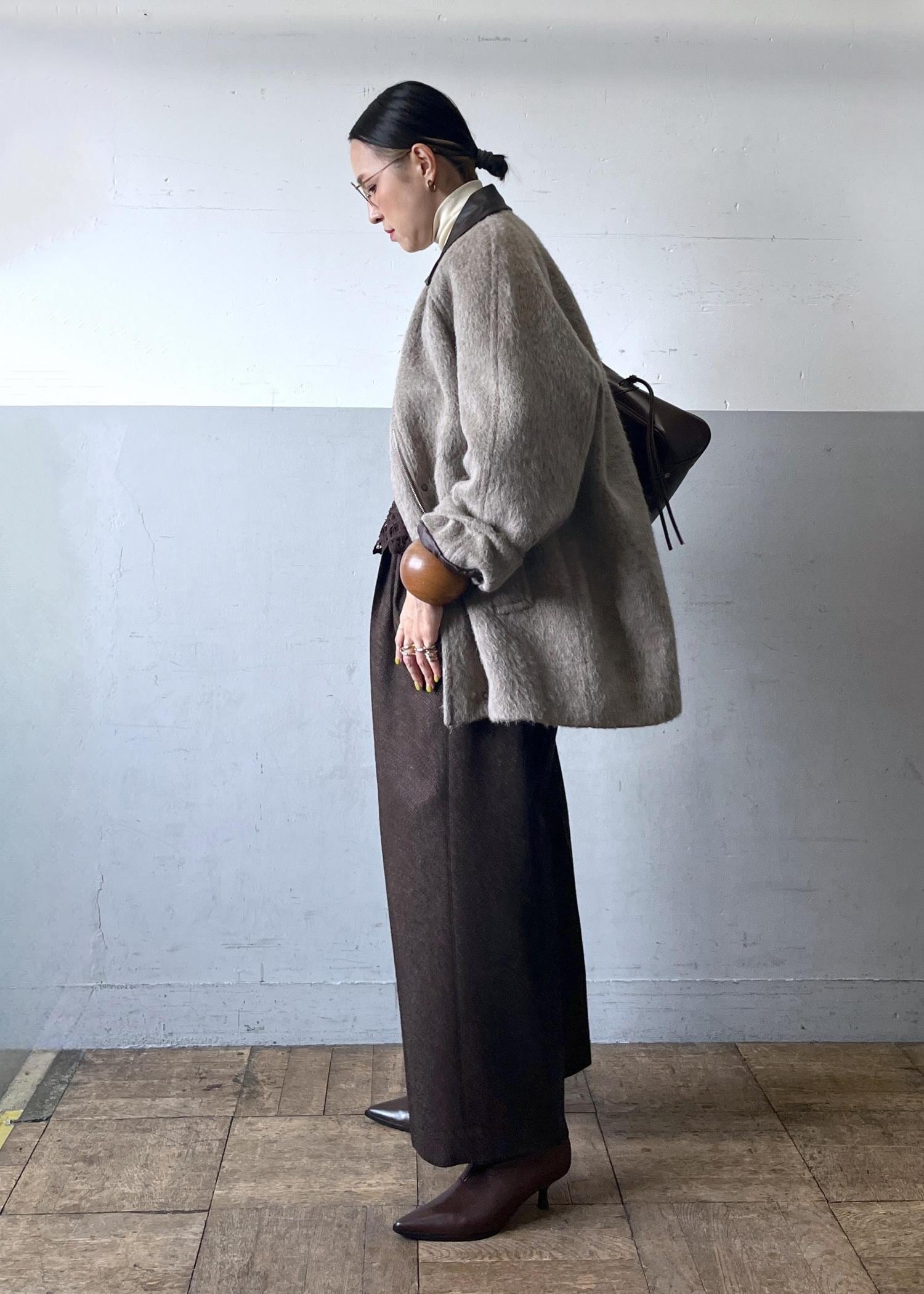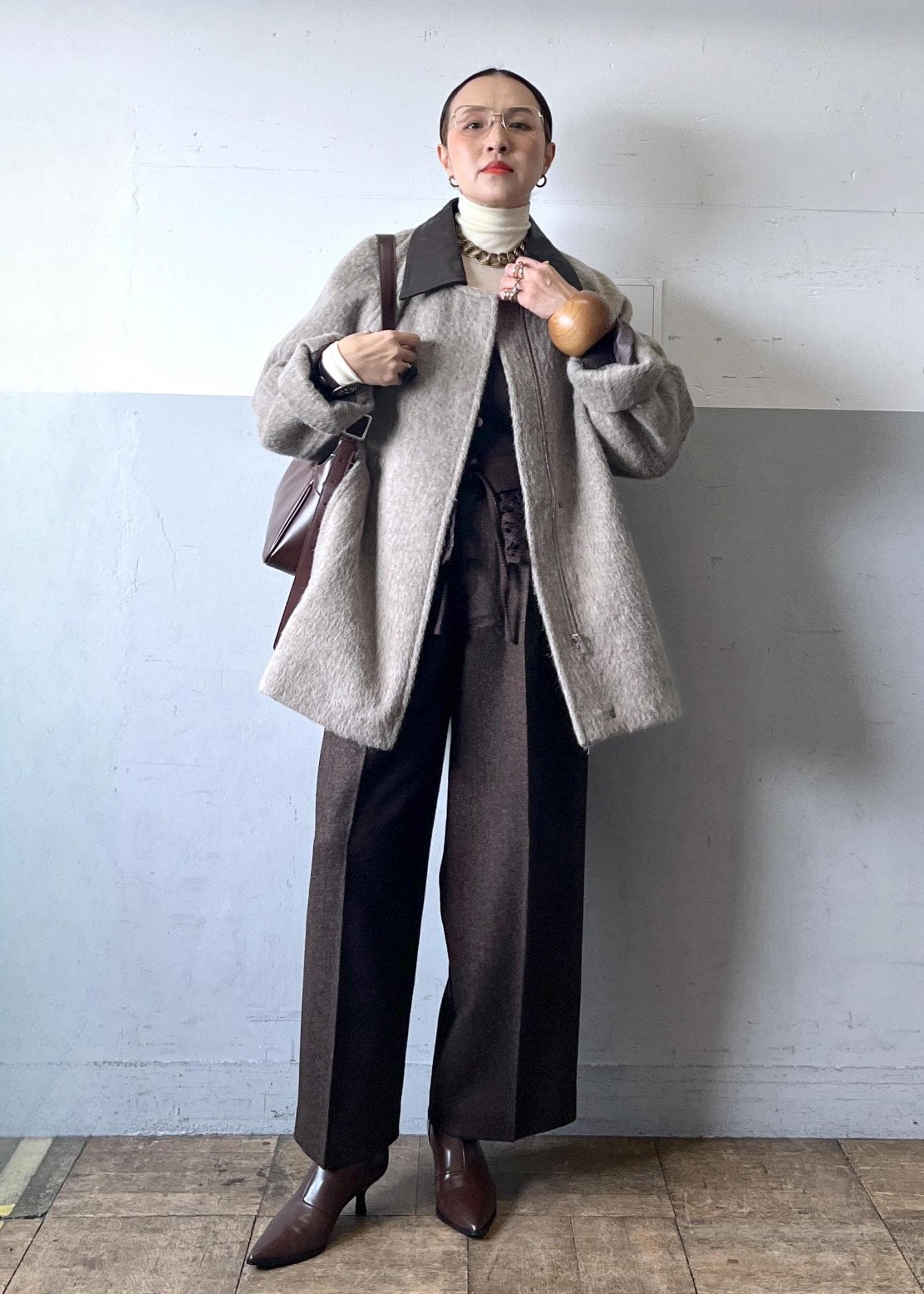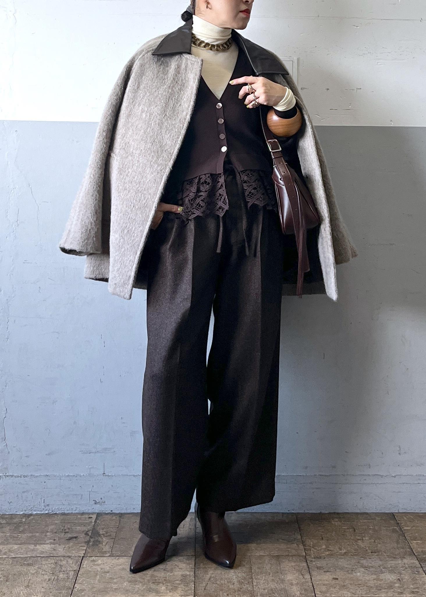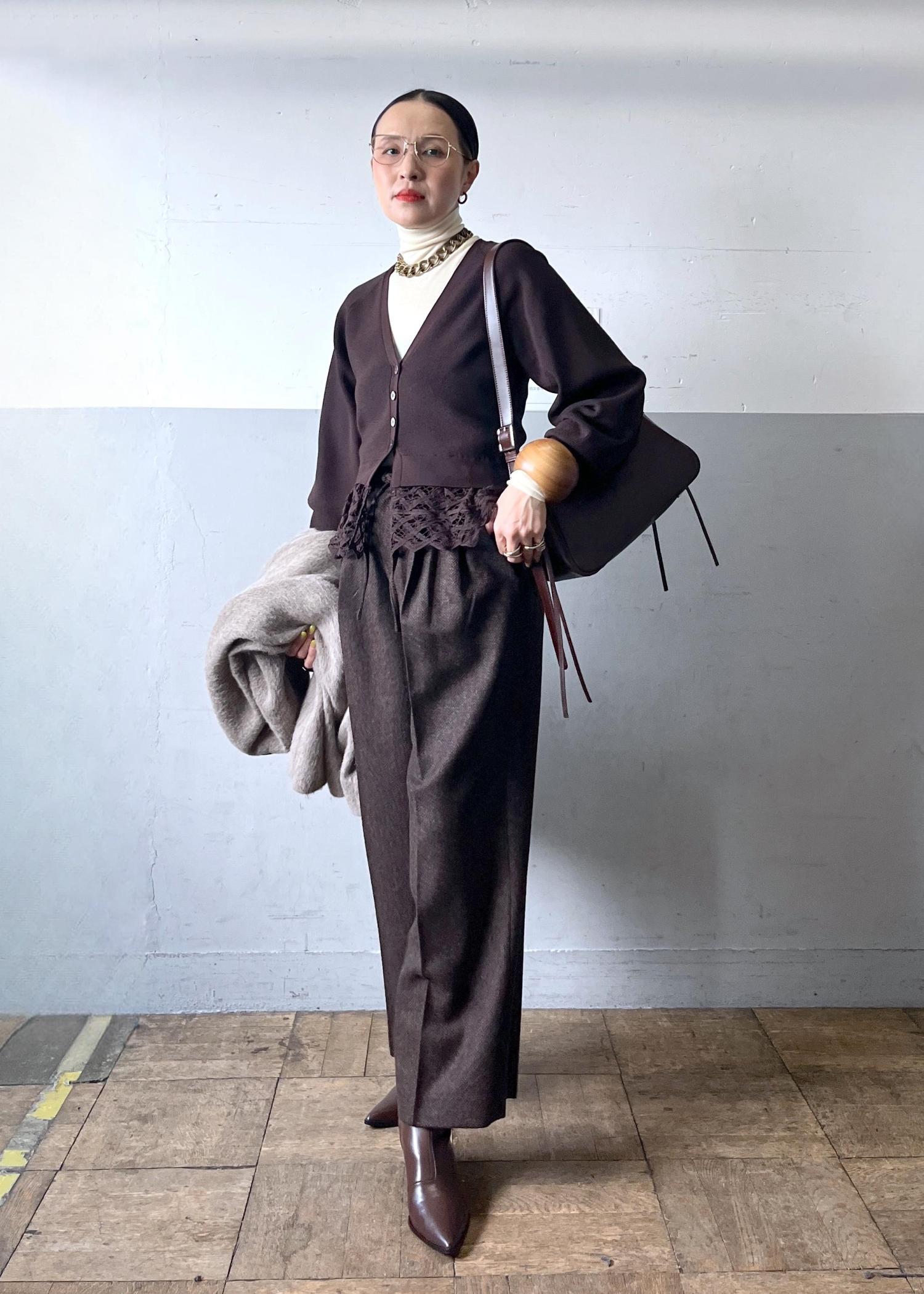タートルネックやワイドパンツとのレイヤードで、上品な季節感と立体感をプラス。