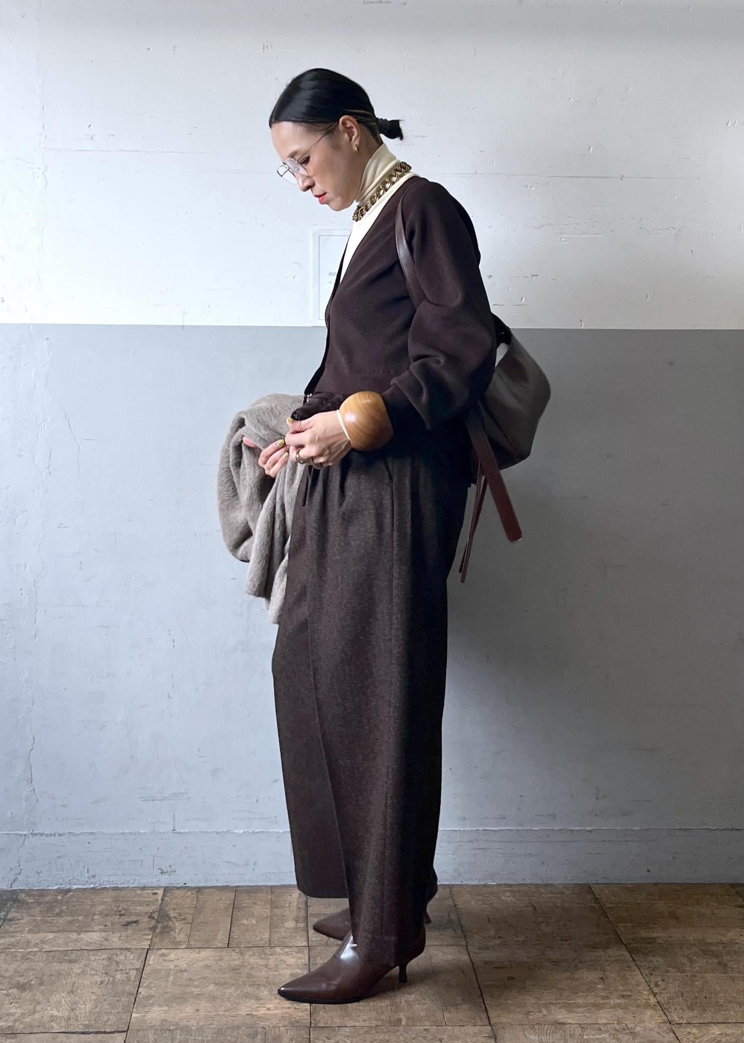 EMOELLE【EMOELLE】へリンボーンワイドパンツダークブラウン系 / 38¥39,600レビューツィード素材のしっかりした厚みのある上品なスラックスです。ウエスト〜腰回りがゆったりしていてとても履きやすいですよ^ ^