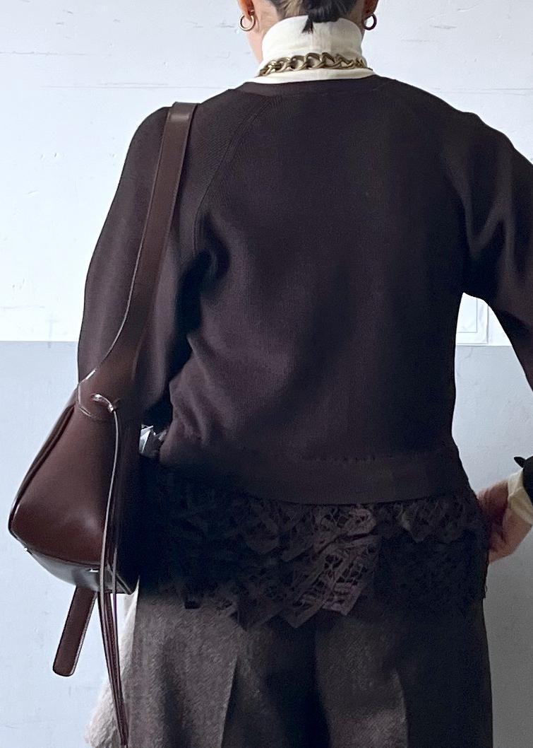ADAM ET ROPÉ FEMMEバテンレースコンビニットカーディガンダークブラウン / F¥18,150レビュー開けても閉じても可愛いカーディガン♫ 裾のレースは綺麗めにもカジュアルにも使えてスタイリングのアクセントとしても便利ですよ!薄手と言う点も使いやすいです^ ^