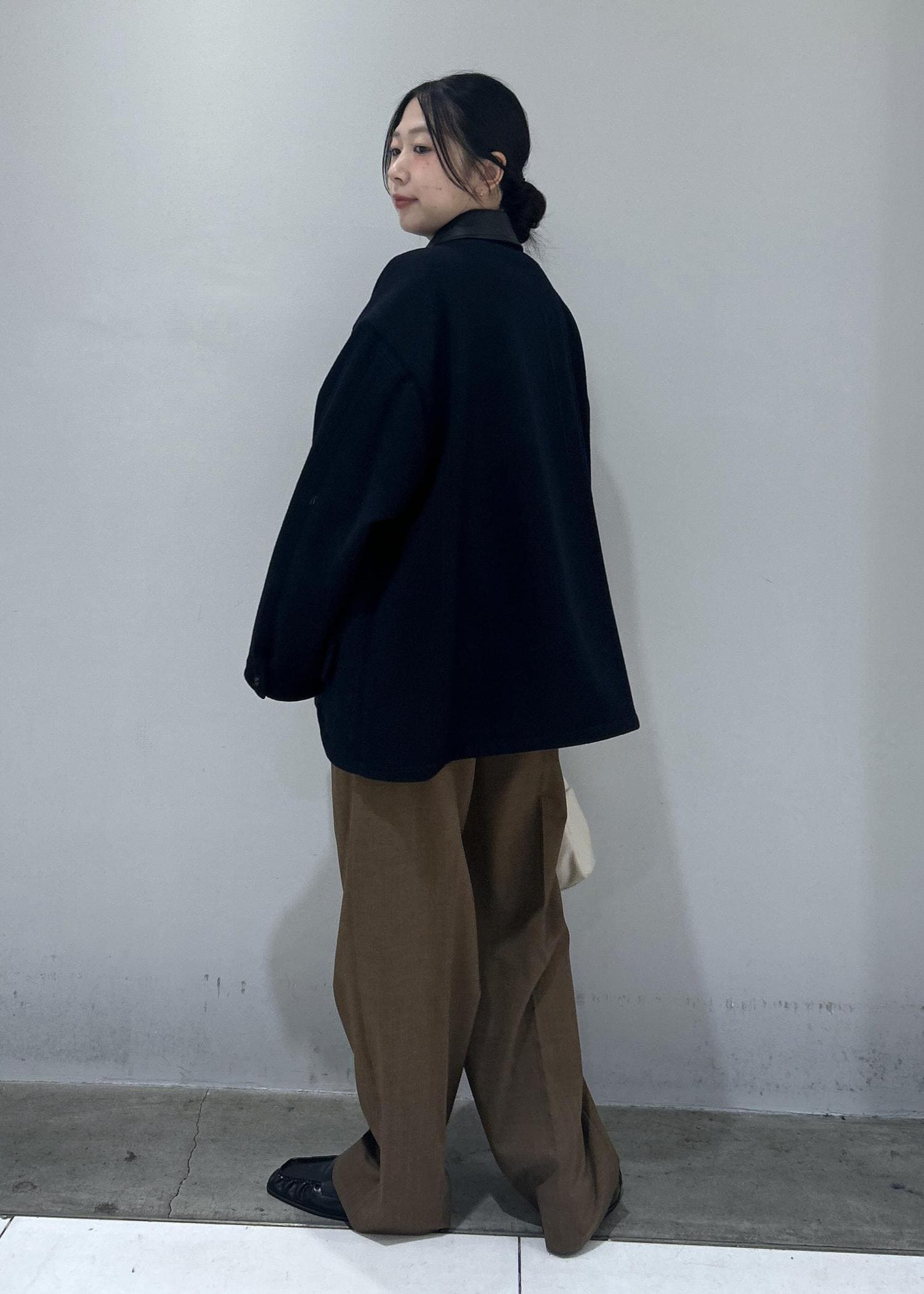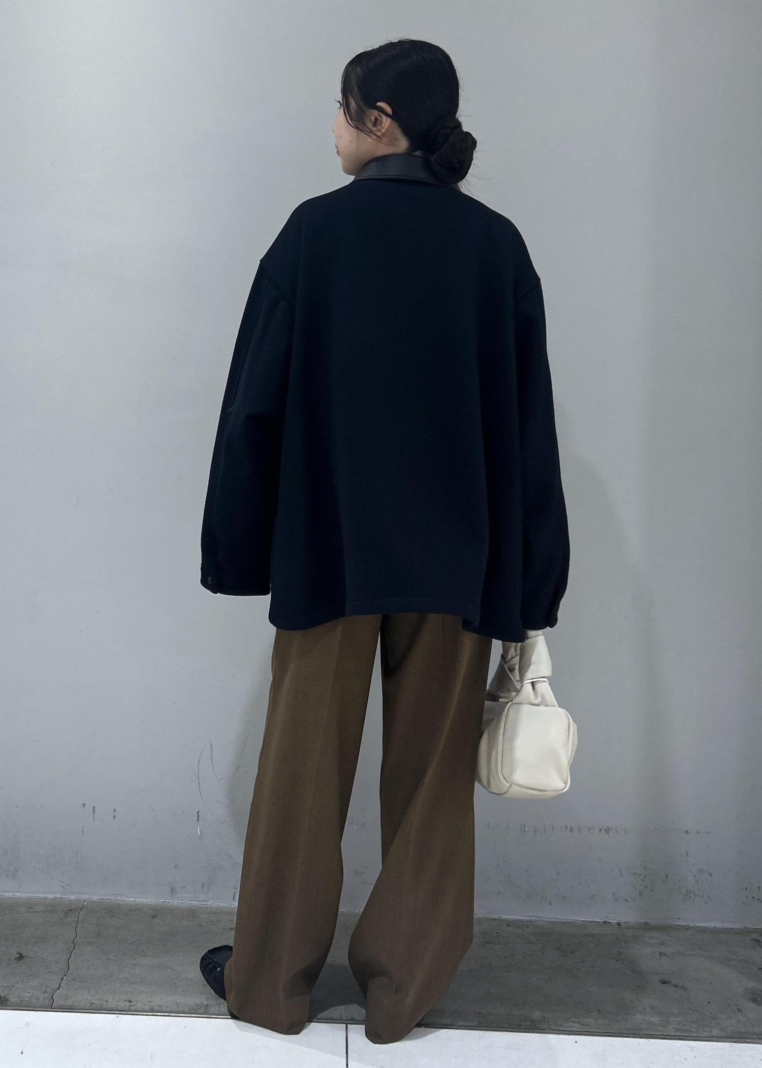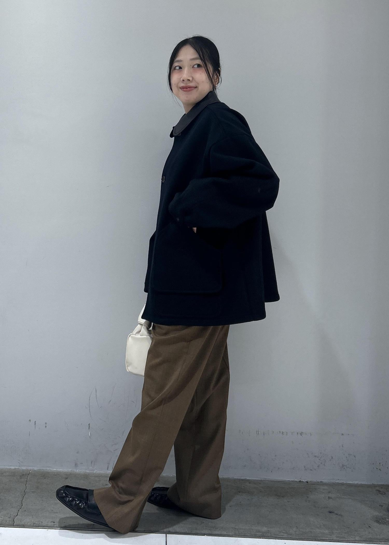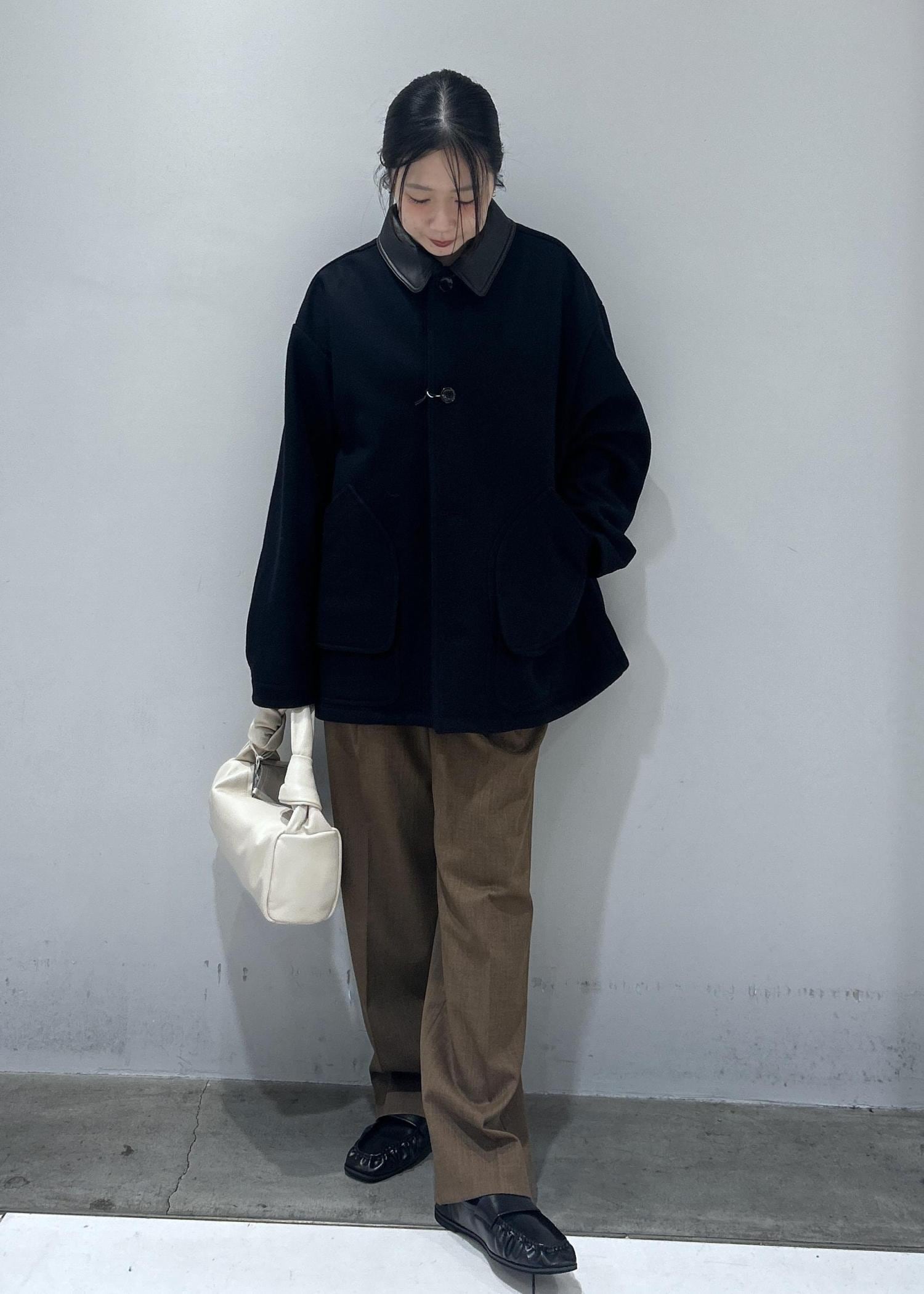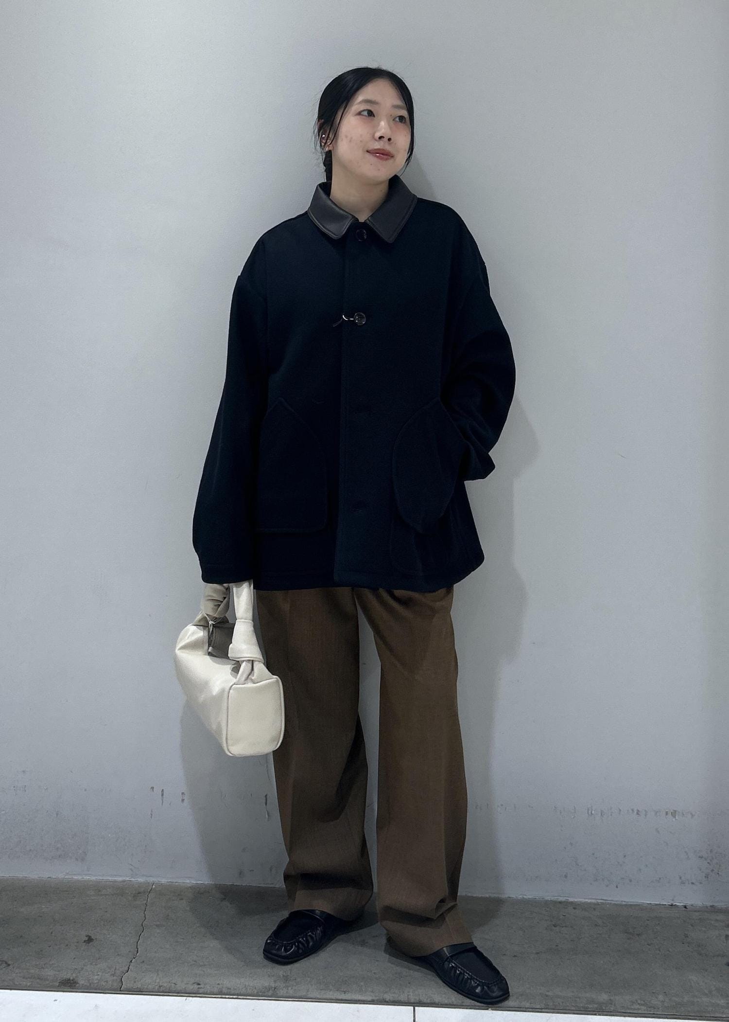 襟のお素材がレザーになっており、上品な雰囲気でモードっぽくまとめてくれるので素敵です。