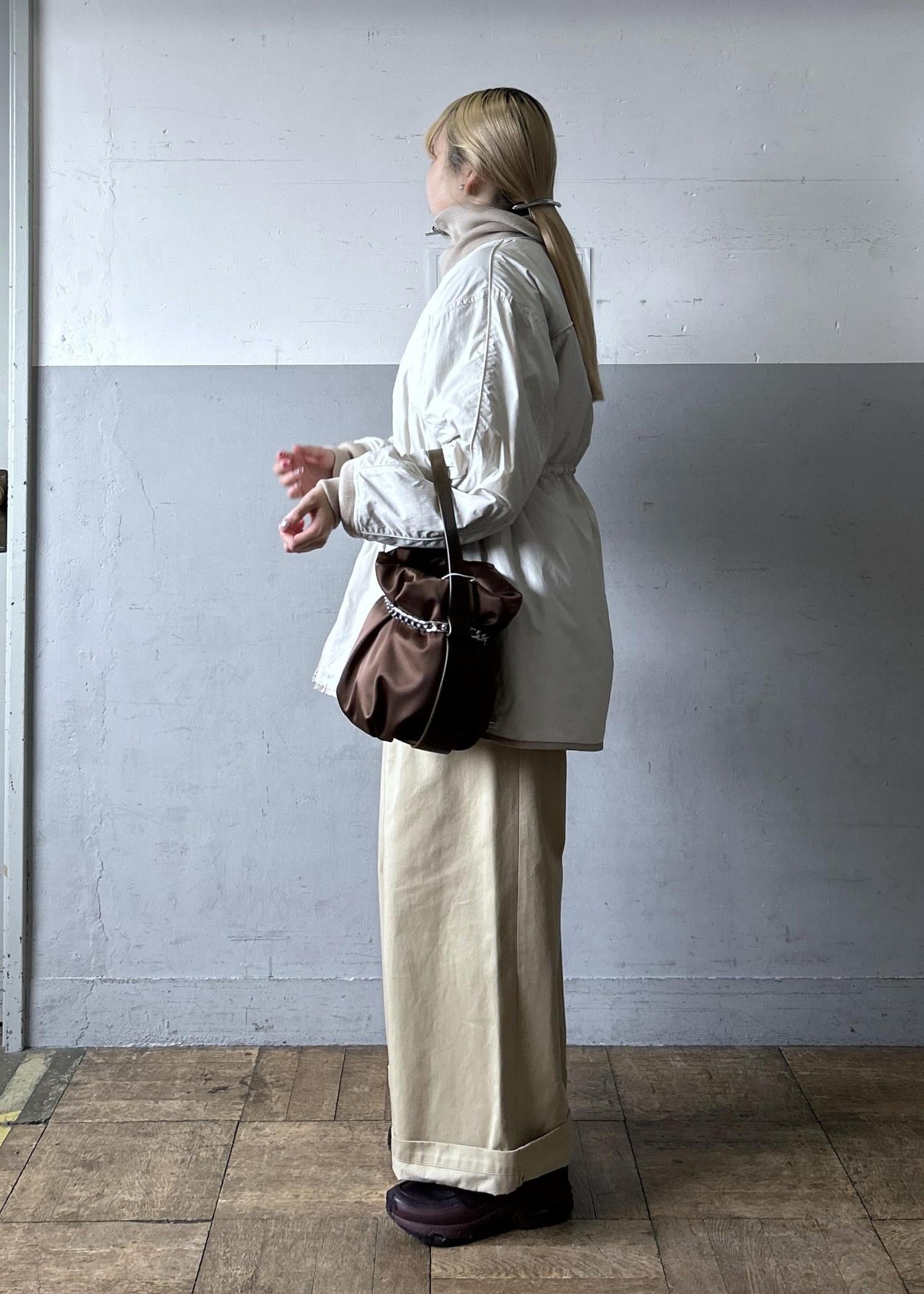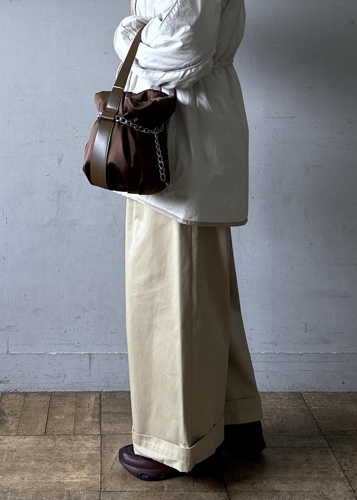 ADAM ET ROPÉ FEMME【サステナブル】チェーン巾着バッグブラウン / F¥13,200レビューブラックにはゴールドの、ブラウンにはシルバーのチェーンが付いたバッグです。