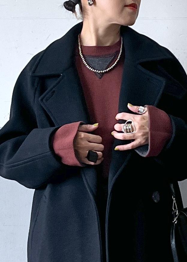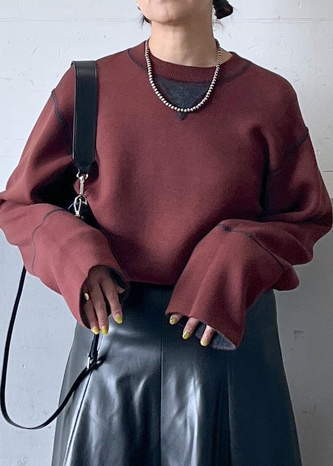 深みのあるレッドに、袖口の配色がアクセントとして効くリバーシブルニット。
