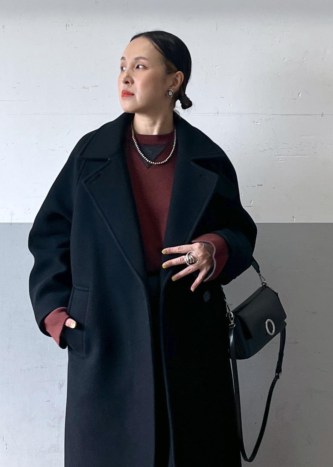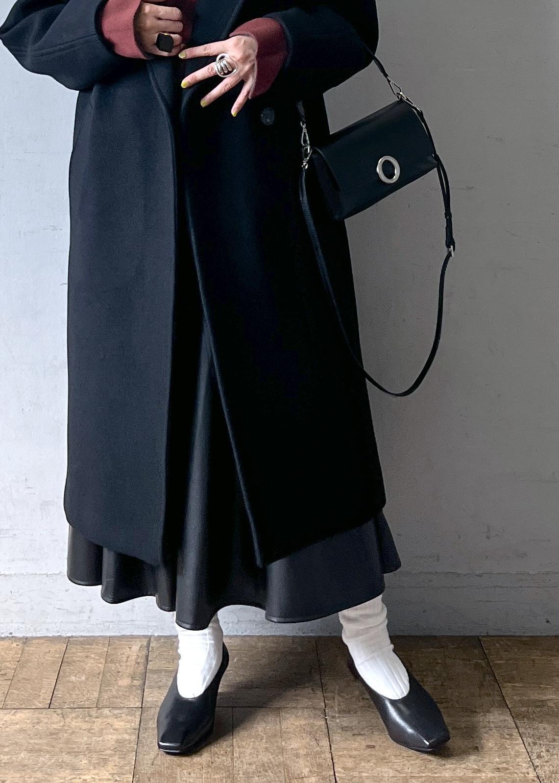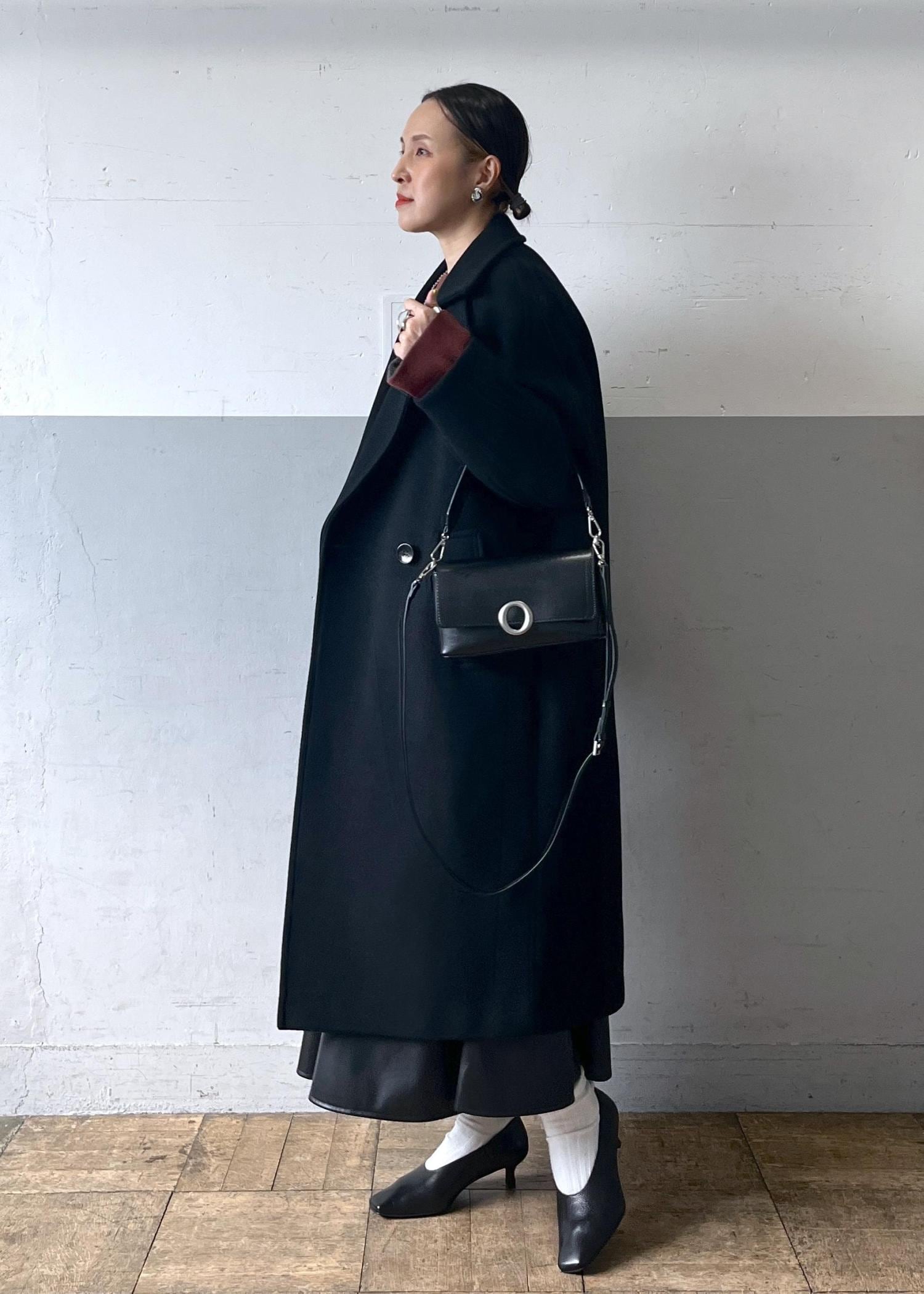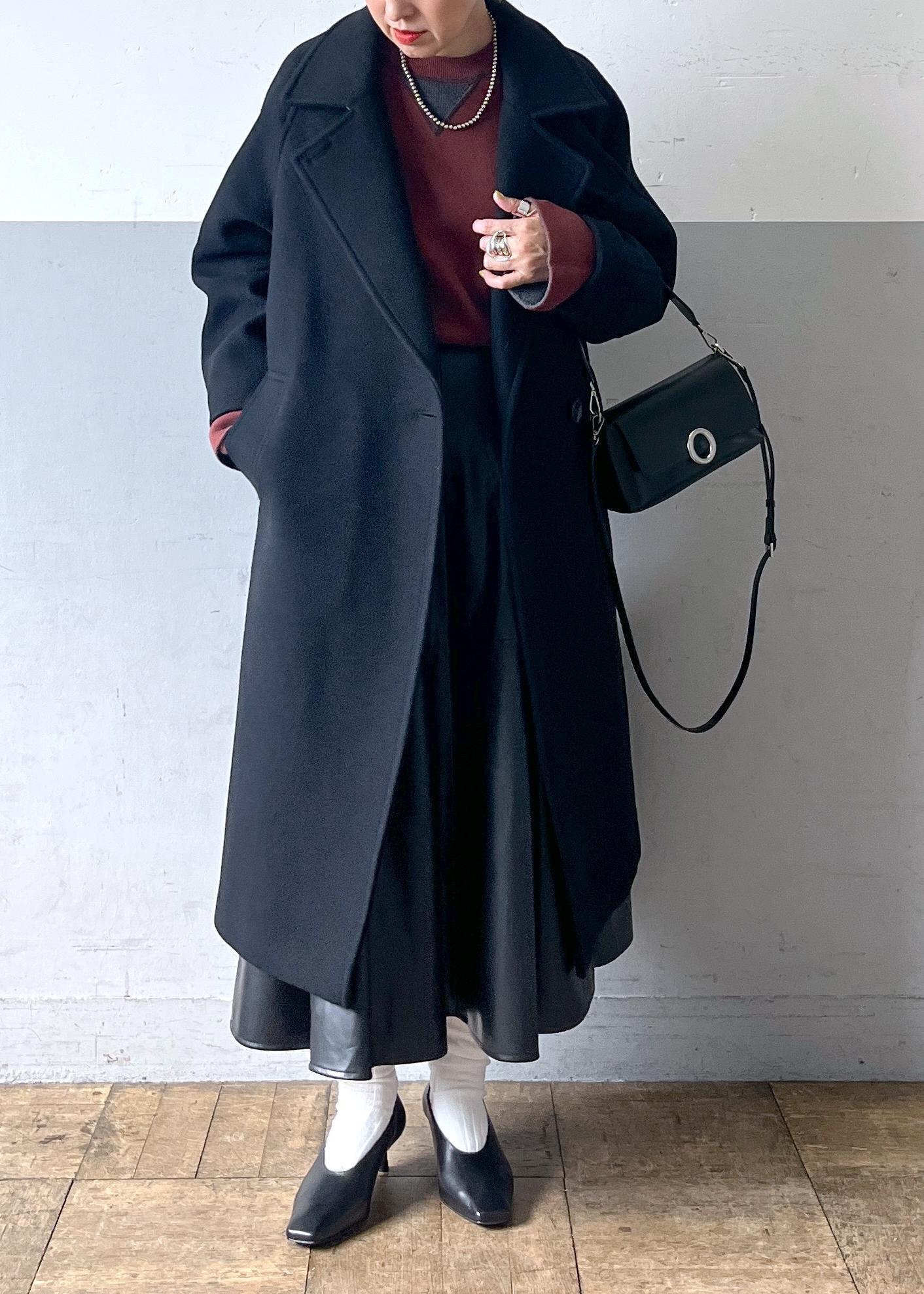 フェイクレザーのマットな質感とロングコートの重厚感を重ね、色と素材のコントラストで魅せる冬のモードスタイル。