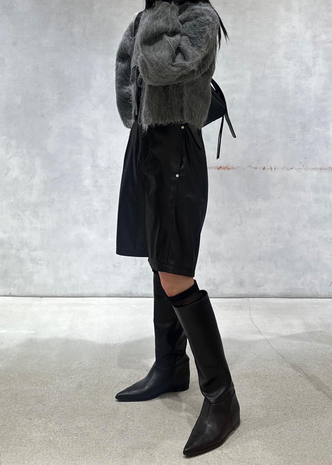 トレンド感のあるロングブーツ合わせ、パンツとのレイヤードもおすすめです。 -