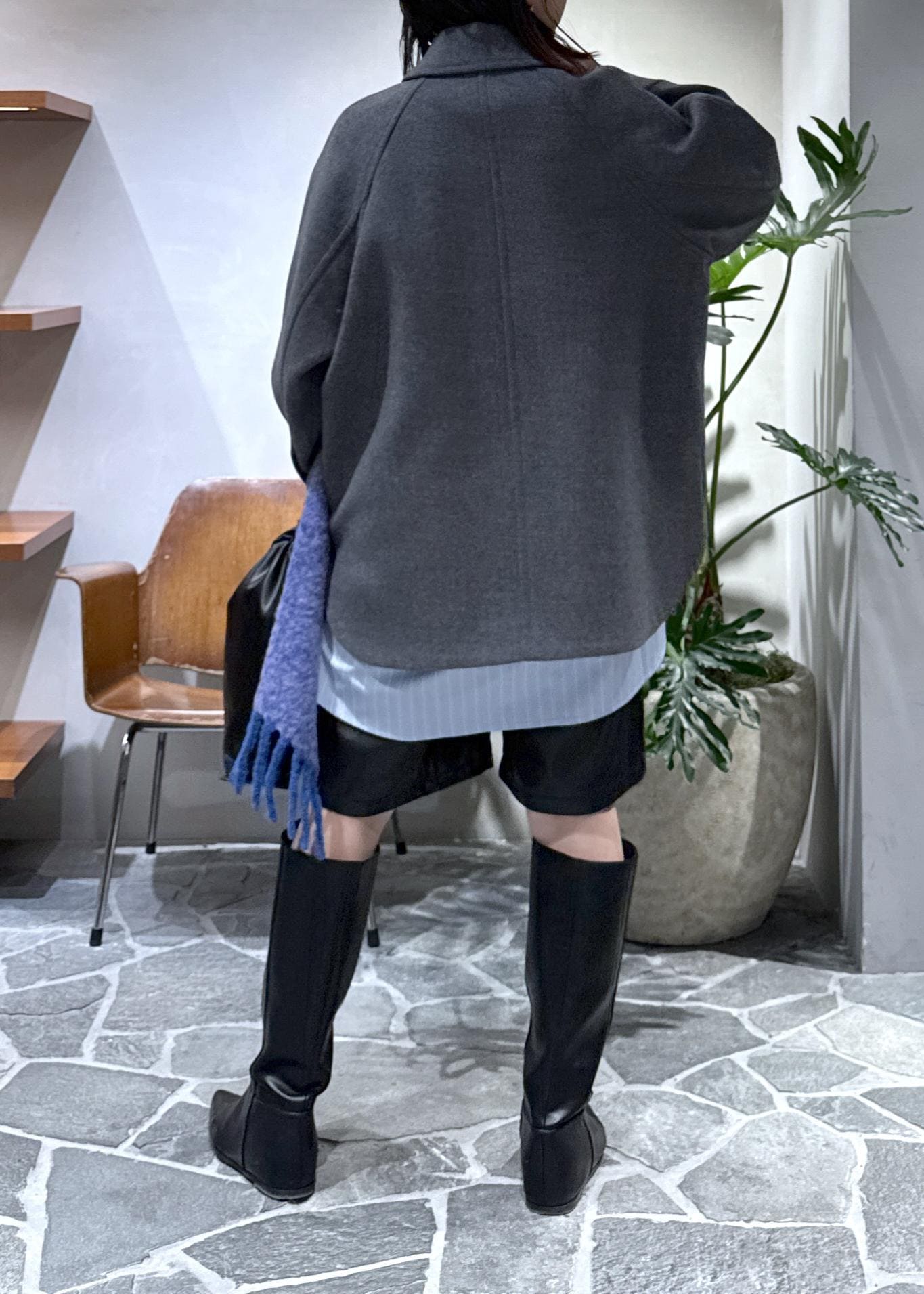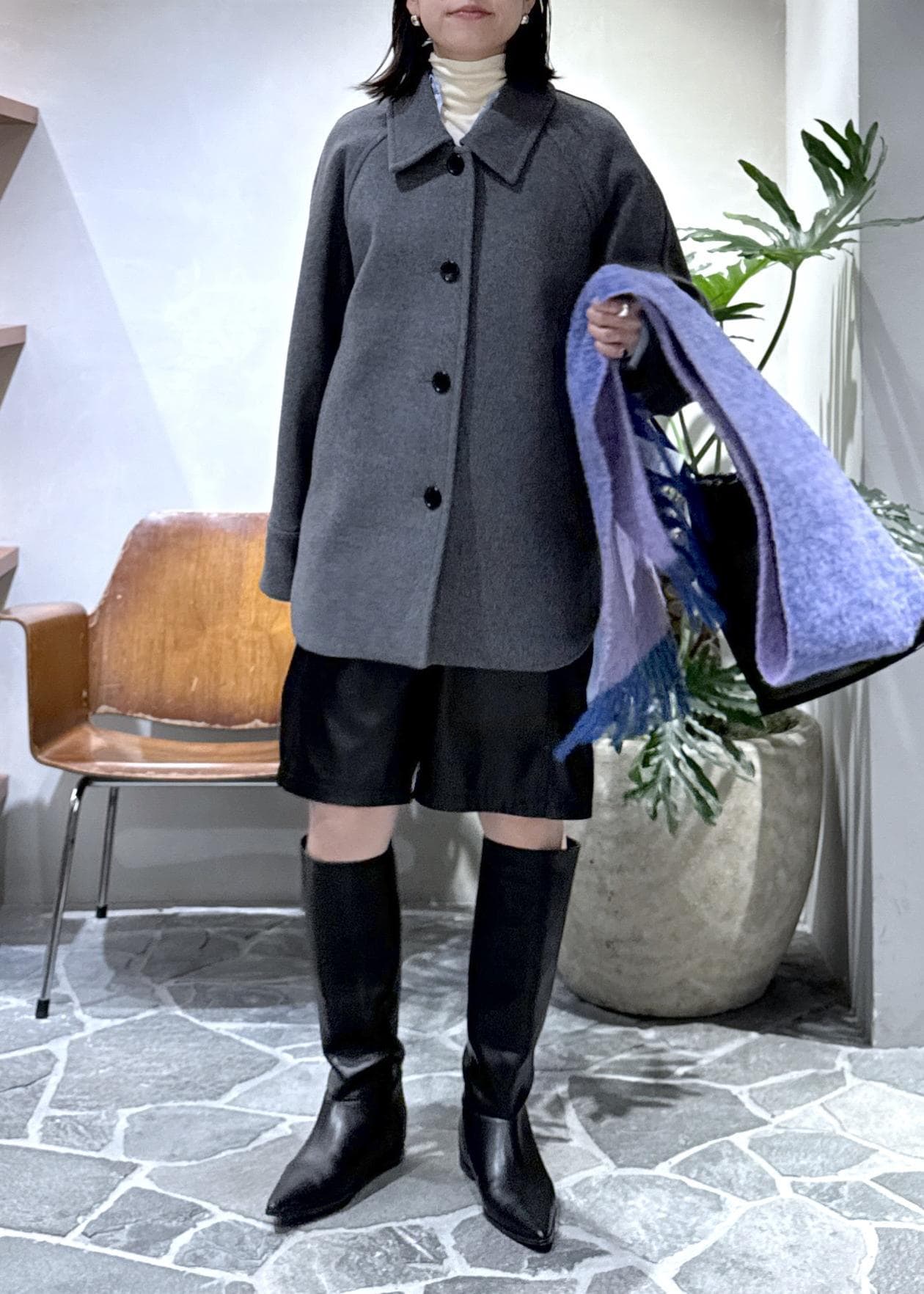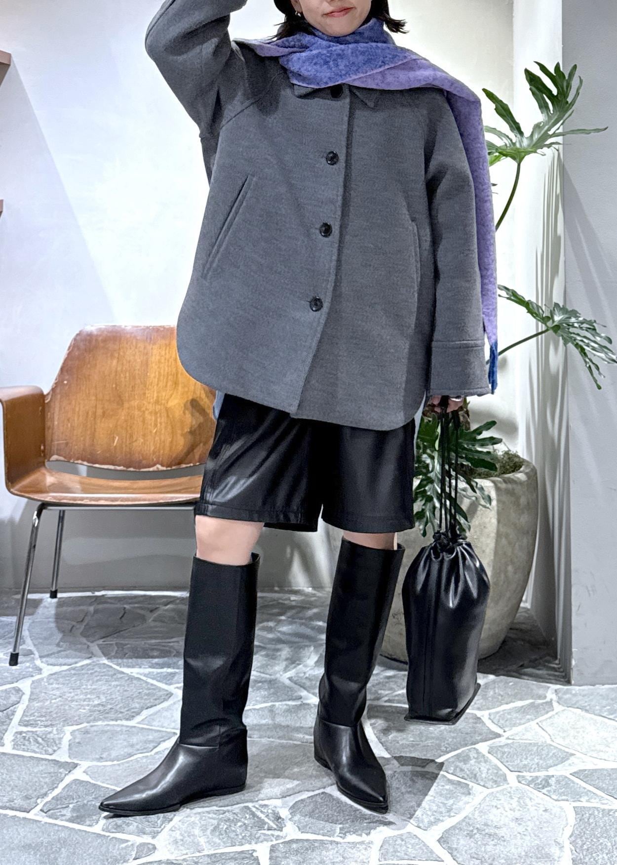 シャツ型のメルトンコートにハーフパンツでスタイリングです。