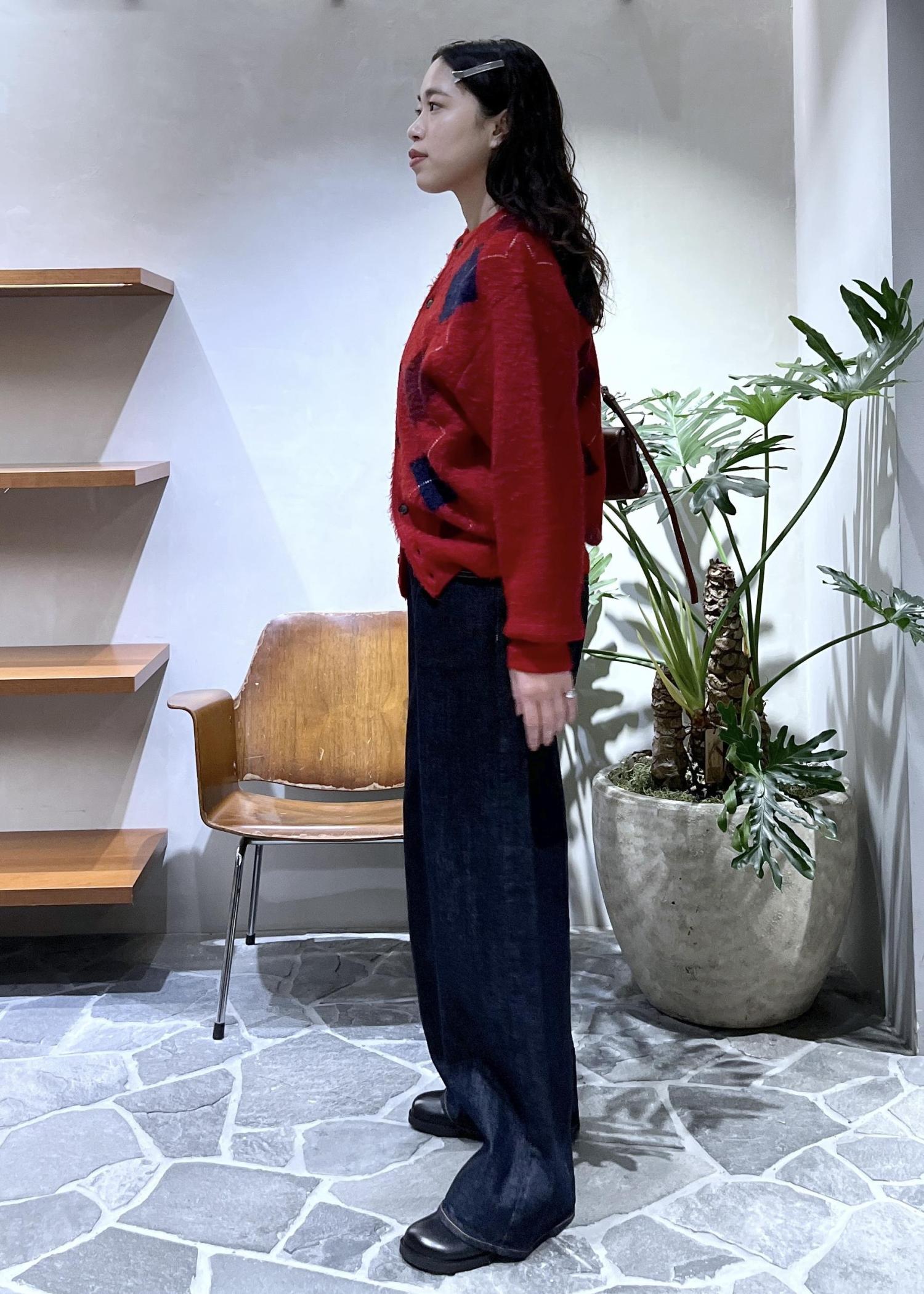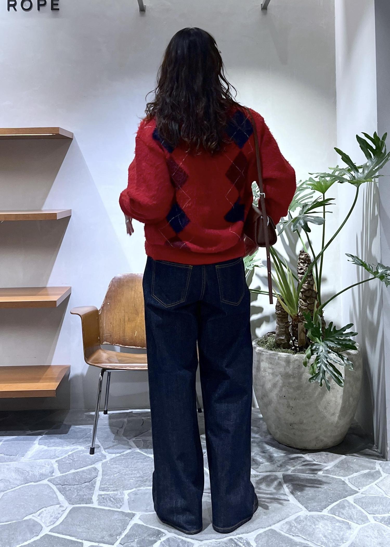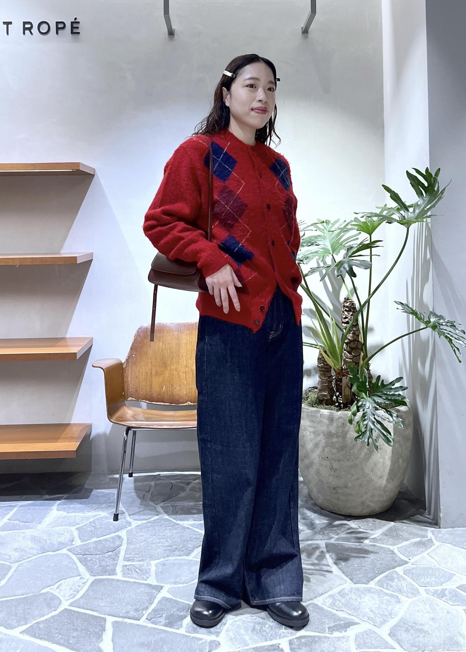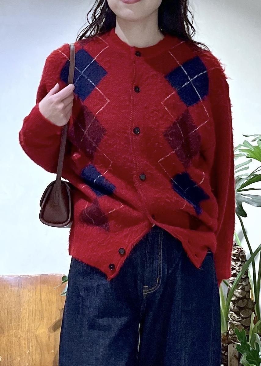 今年トレンドのアーガイル柄。パキッとした大柄アーガイルが存在感が抜群ながら、落ち着いた赤とネイビーの配色が大人かわいい雰囲気です♡