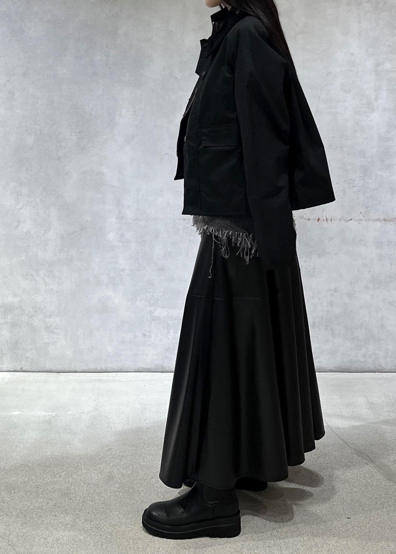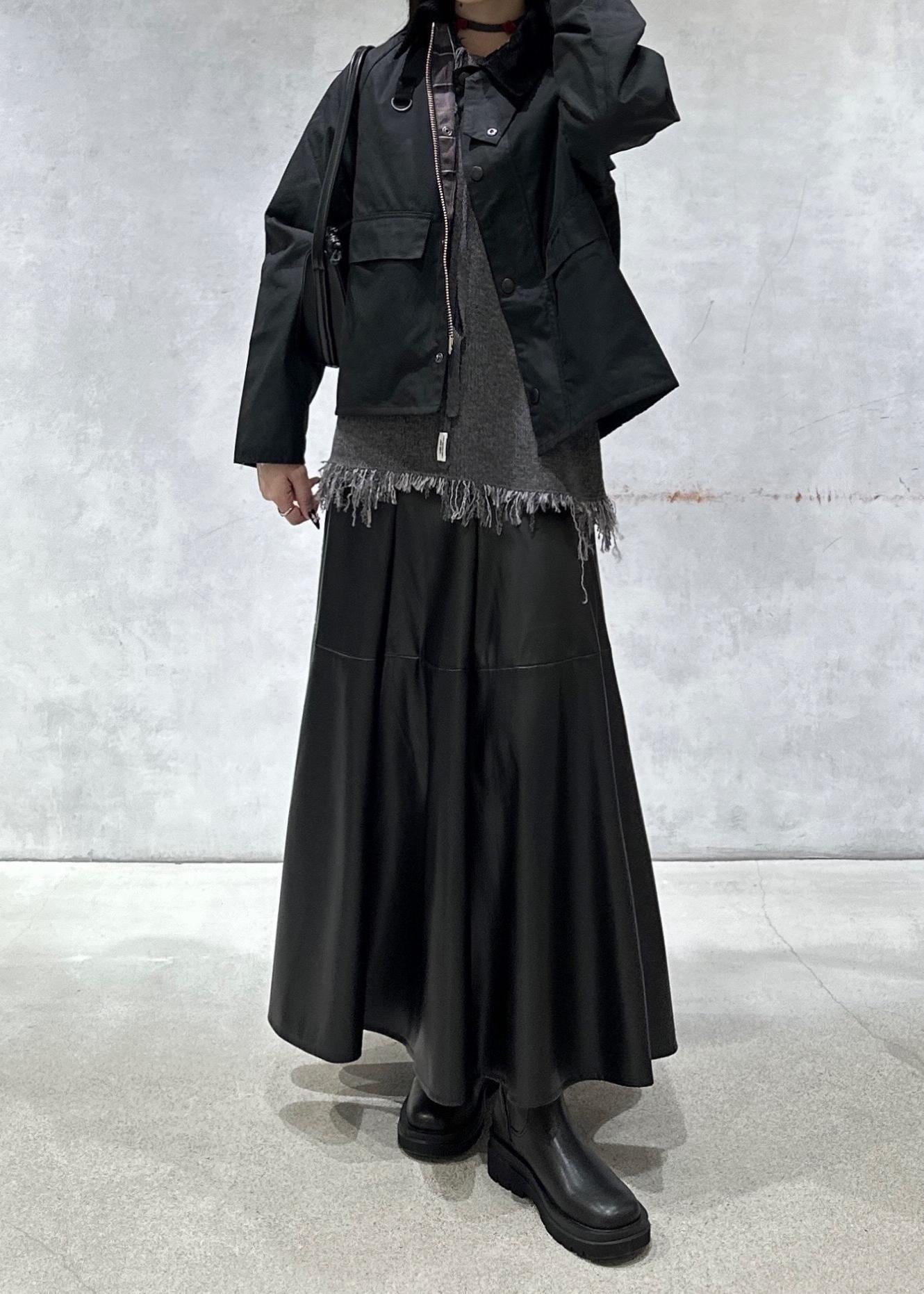 レザースカートですが女性らしいフレアシルエットなのでかっこよくなりすぎずに履いていただけます。