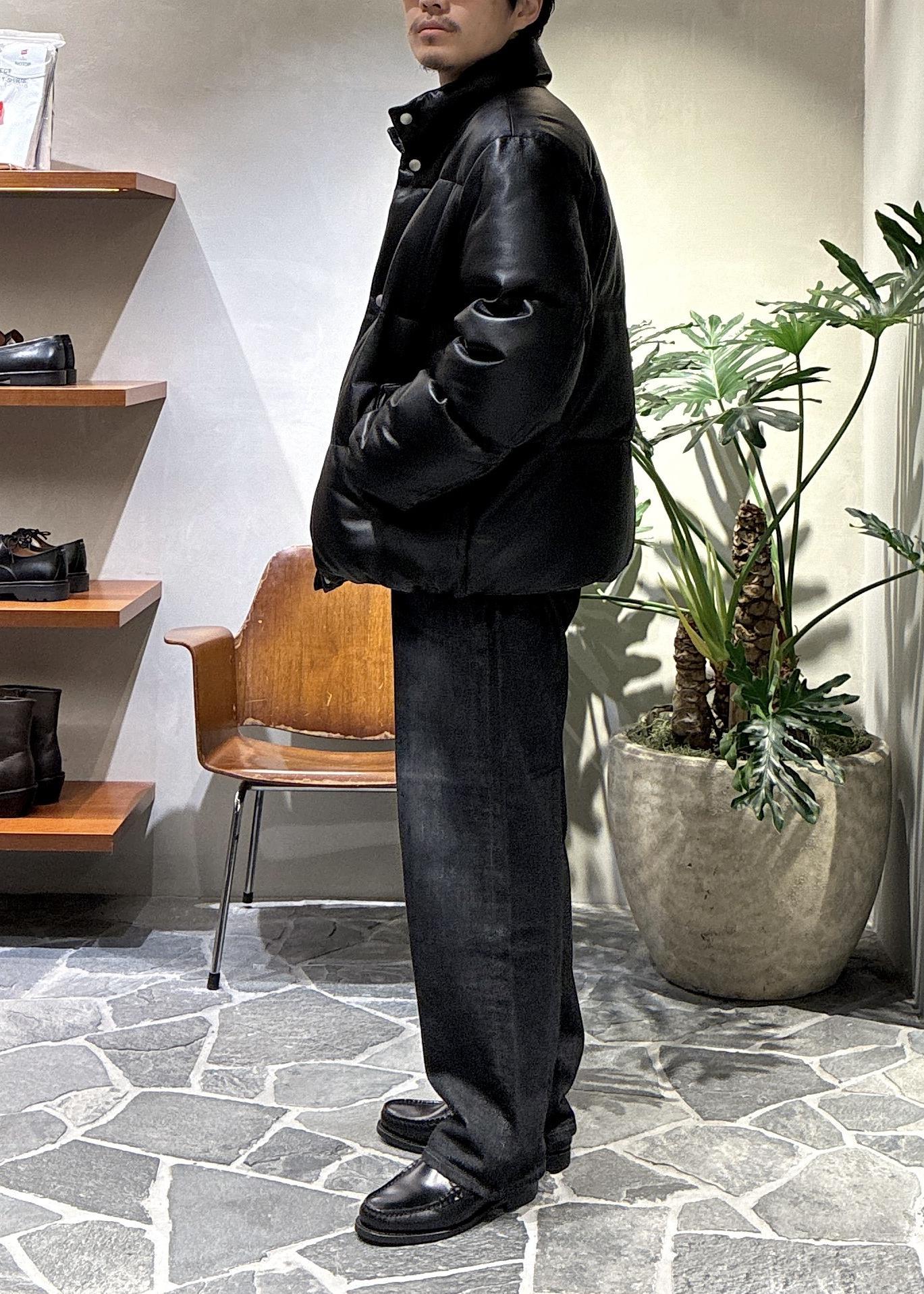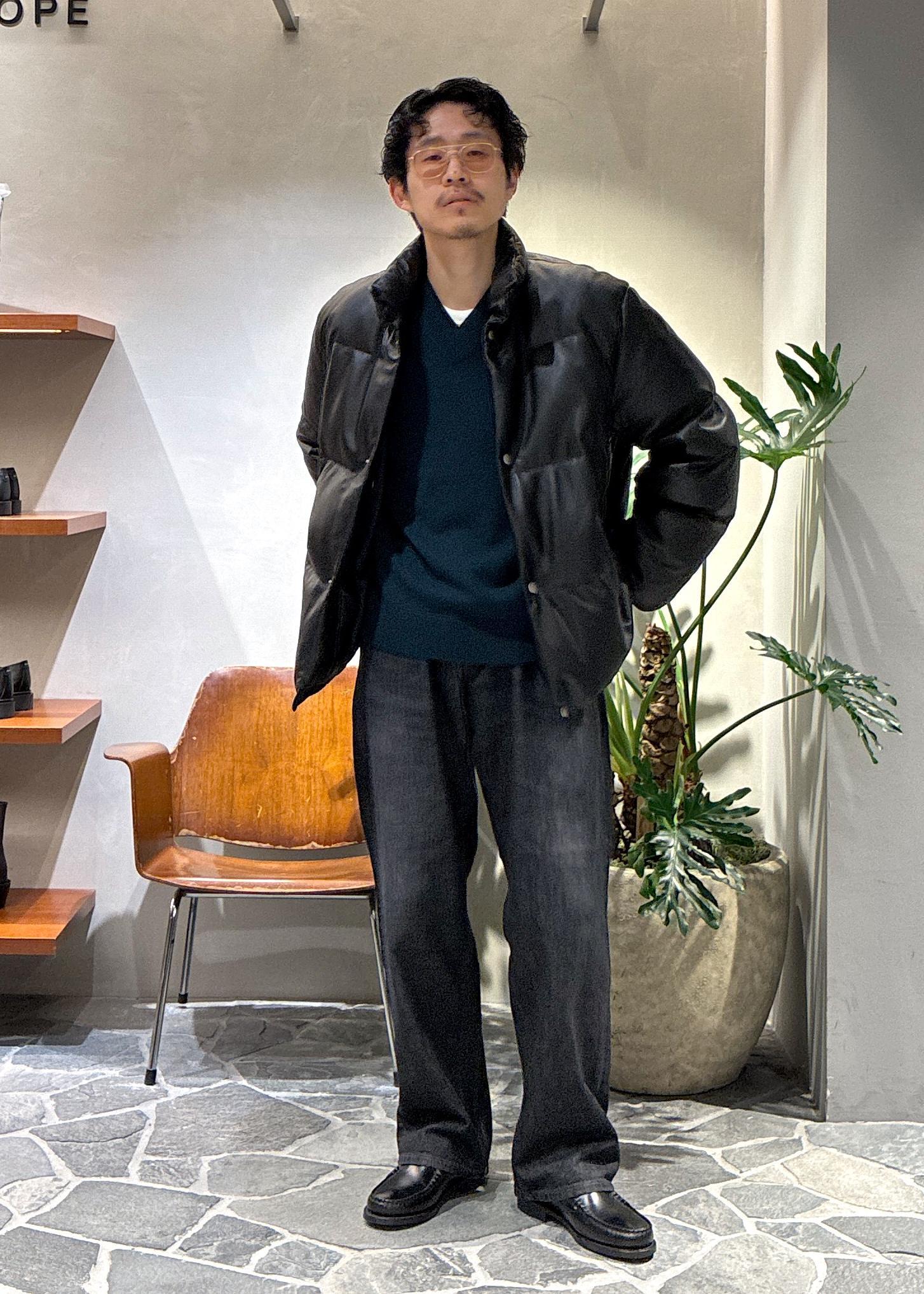 僕の中でこのレザーダウンは、どことなく品の良さを感じるので、今回はカシミヤニットや革靴でカチッとまとめてみました!