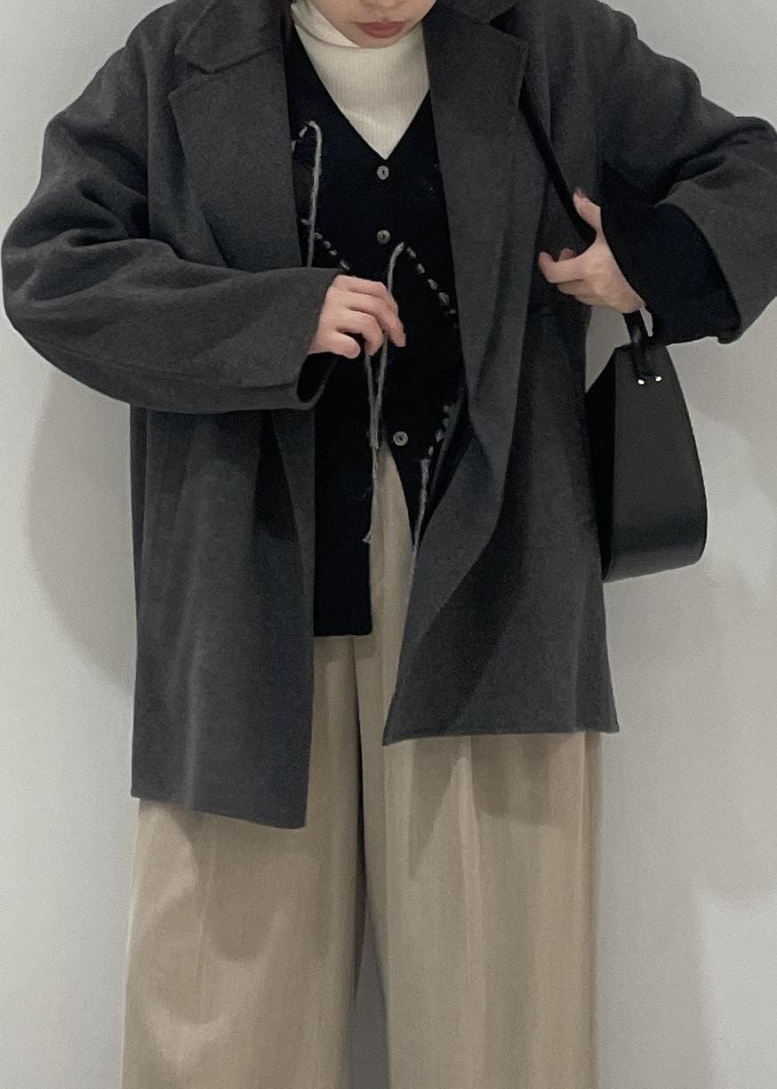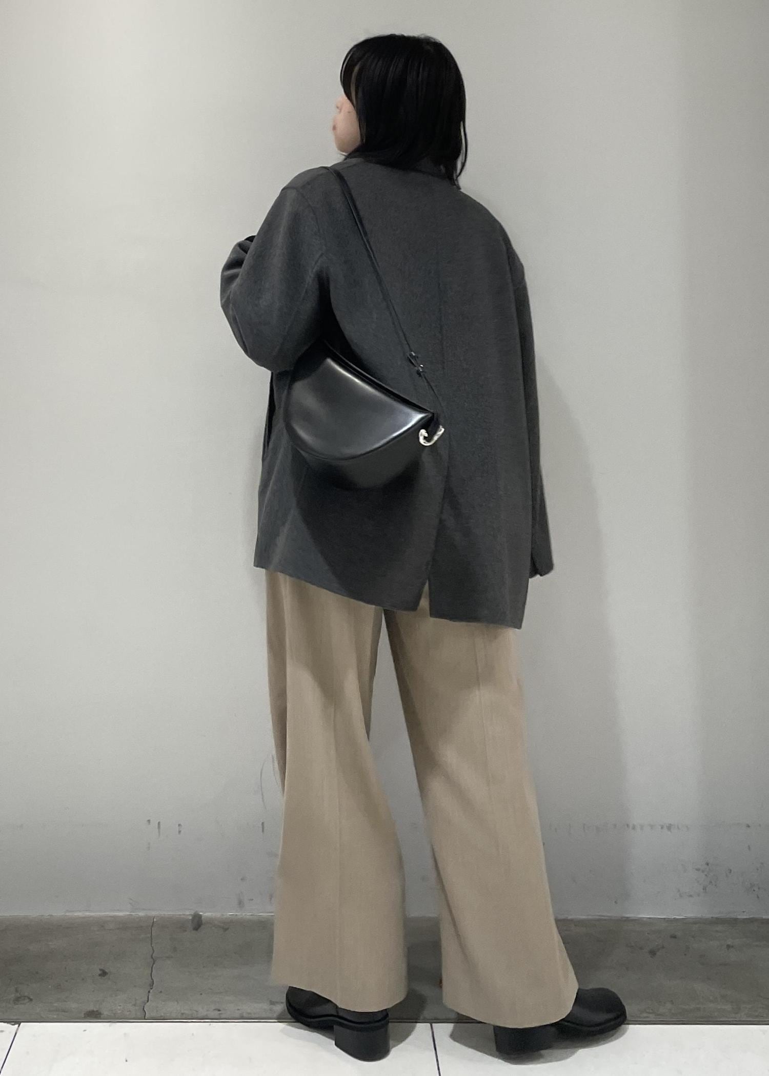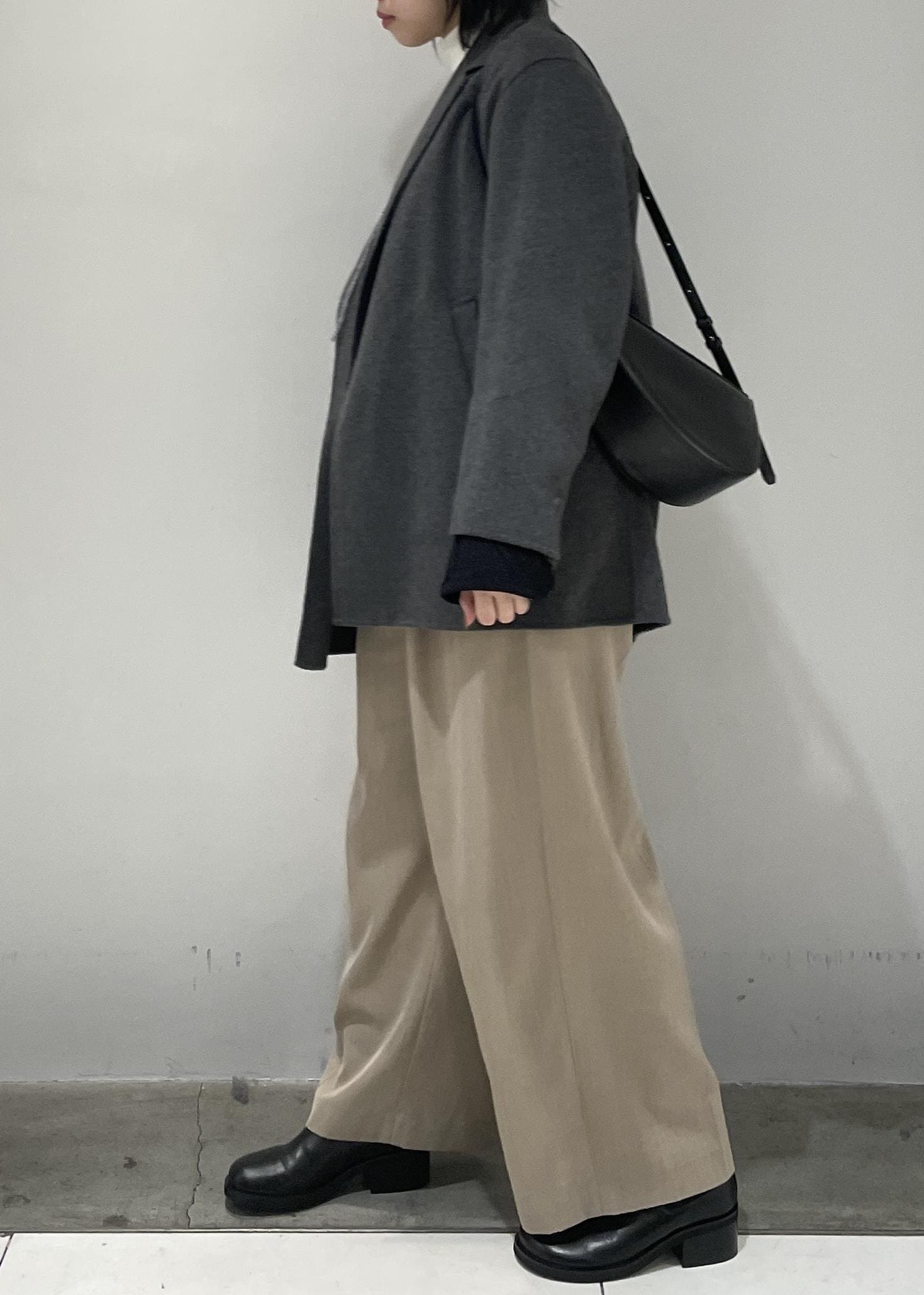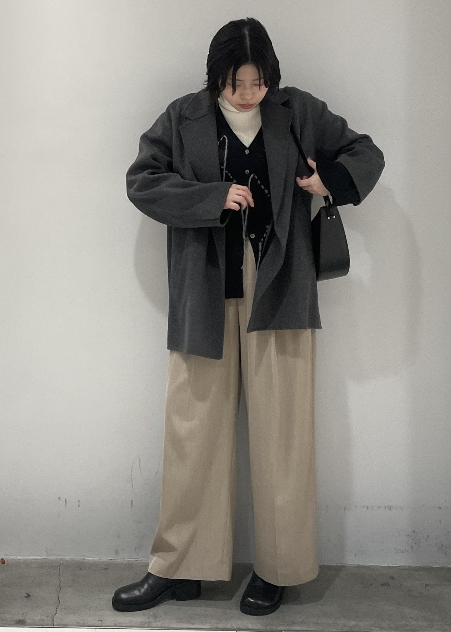 黒やチャコールグレーの落ち着いた色味でまとめながらも、ボトムスやインナーにベージュを持ってくることで重くなりすぎないようしています!
