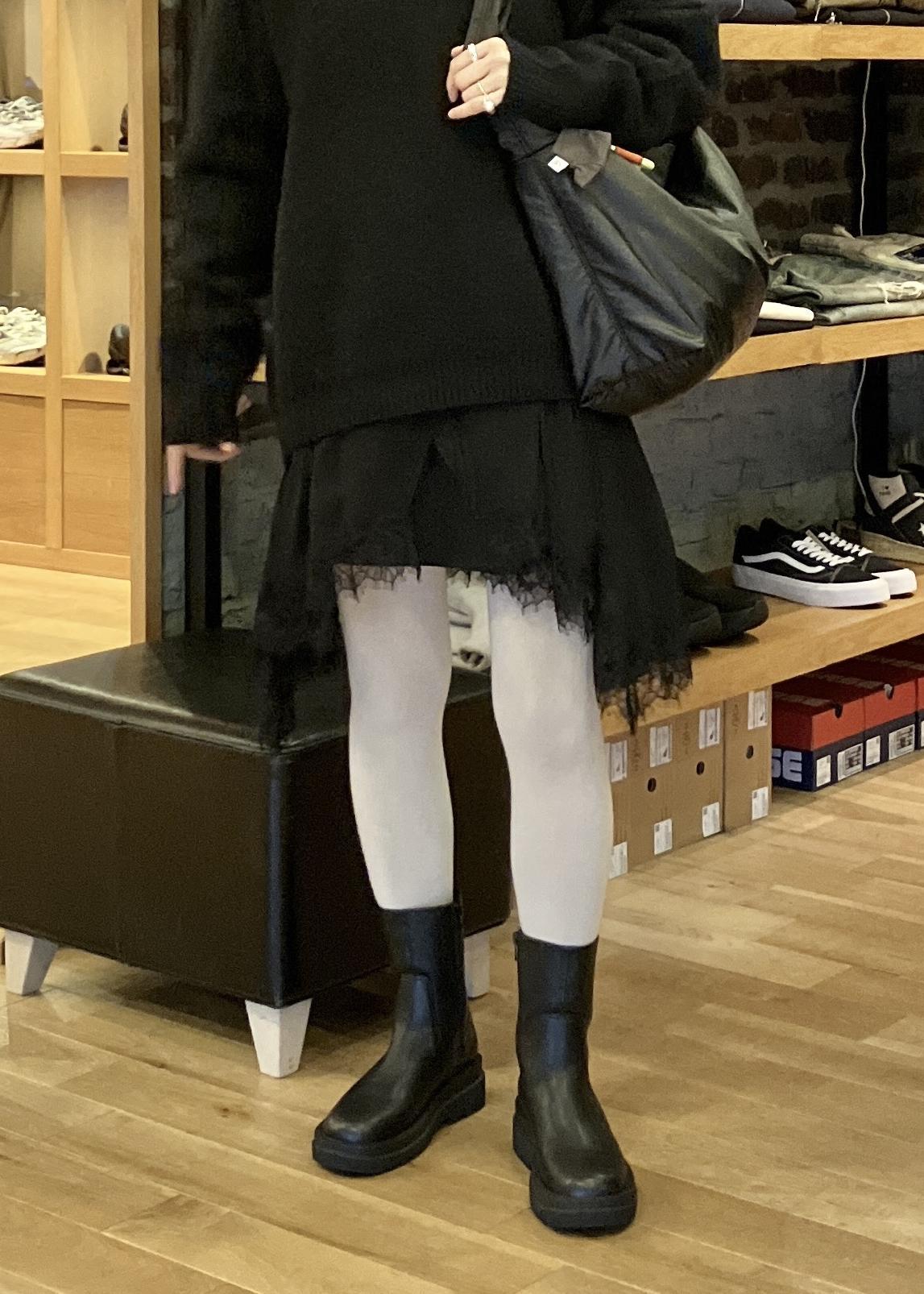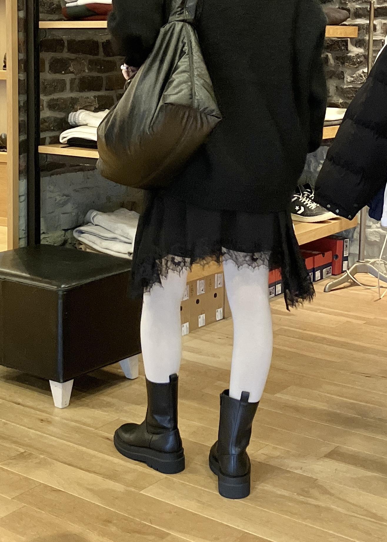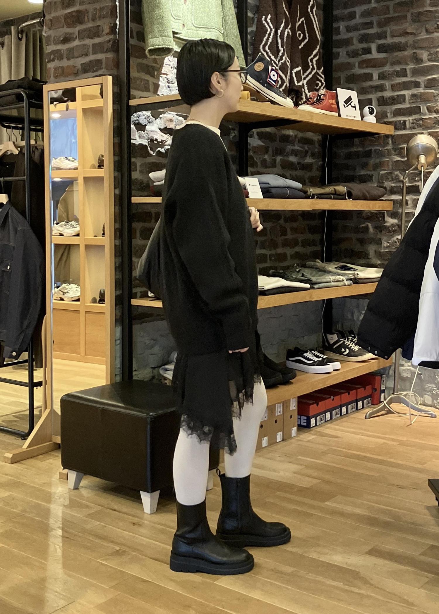真っ黒のコーデでも、レースやモヘアの素材感で